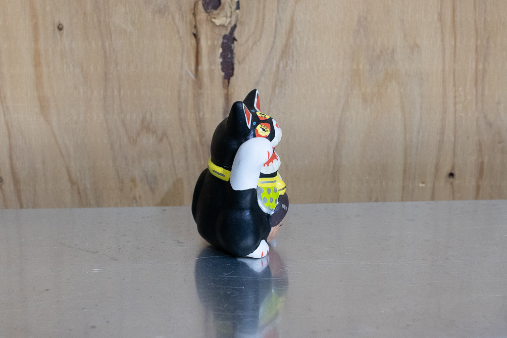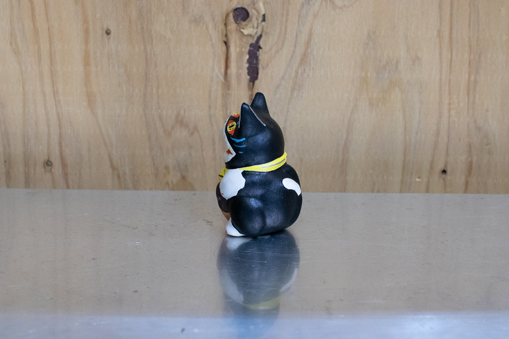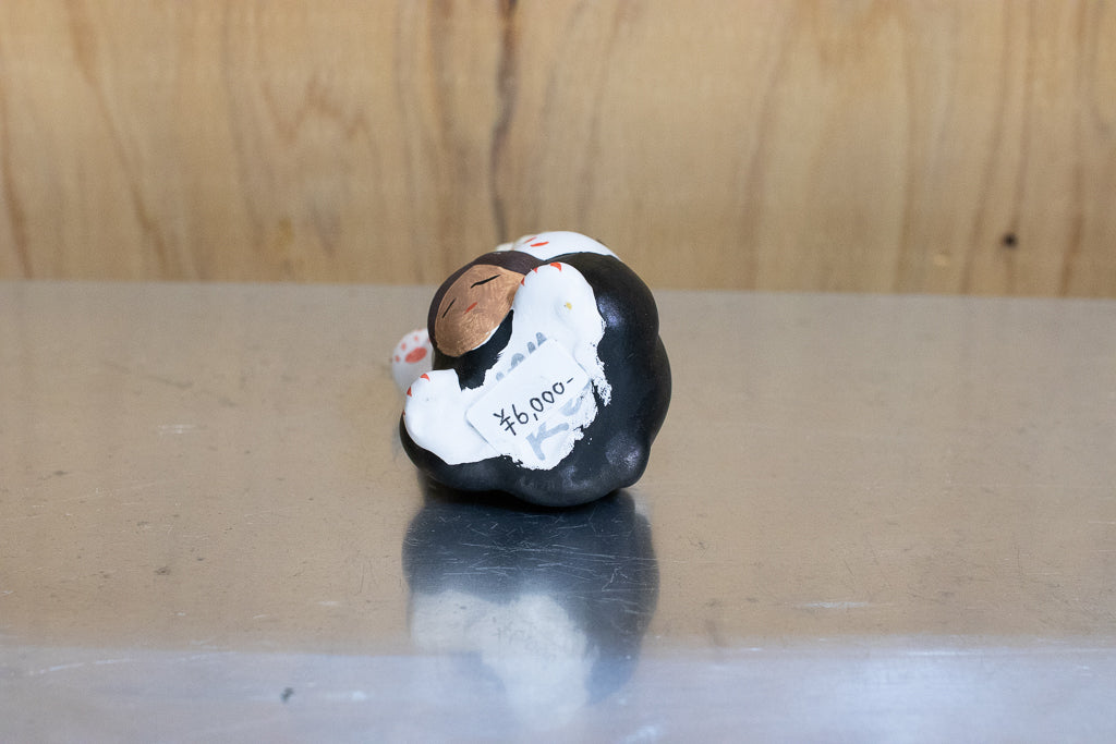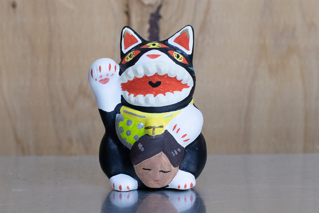 油絵画家の佐藤麗生さんによる張り子風のアートピース、「夢民芸」です。こちらは招き猫っぽいタイプ。よく見ると怖いです。
