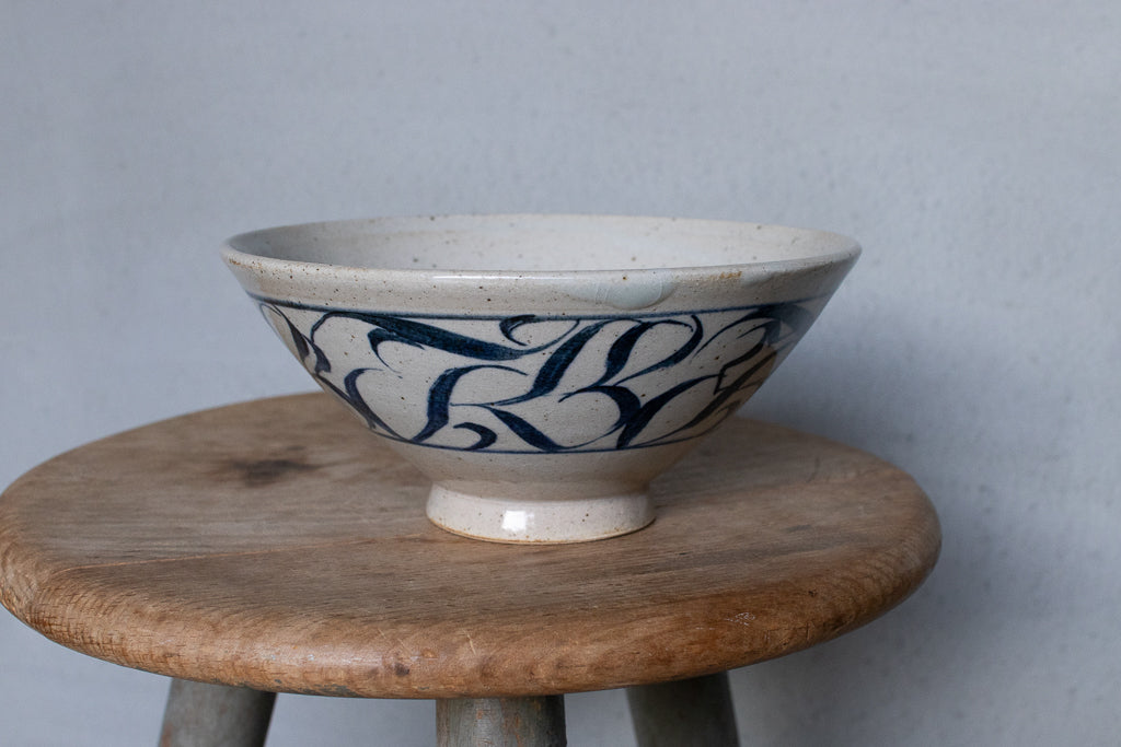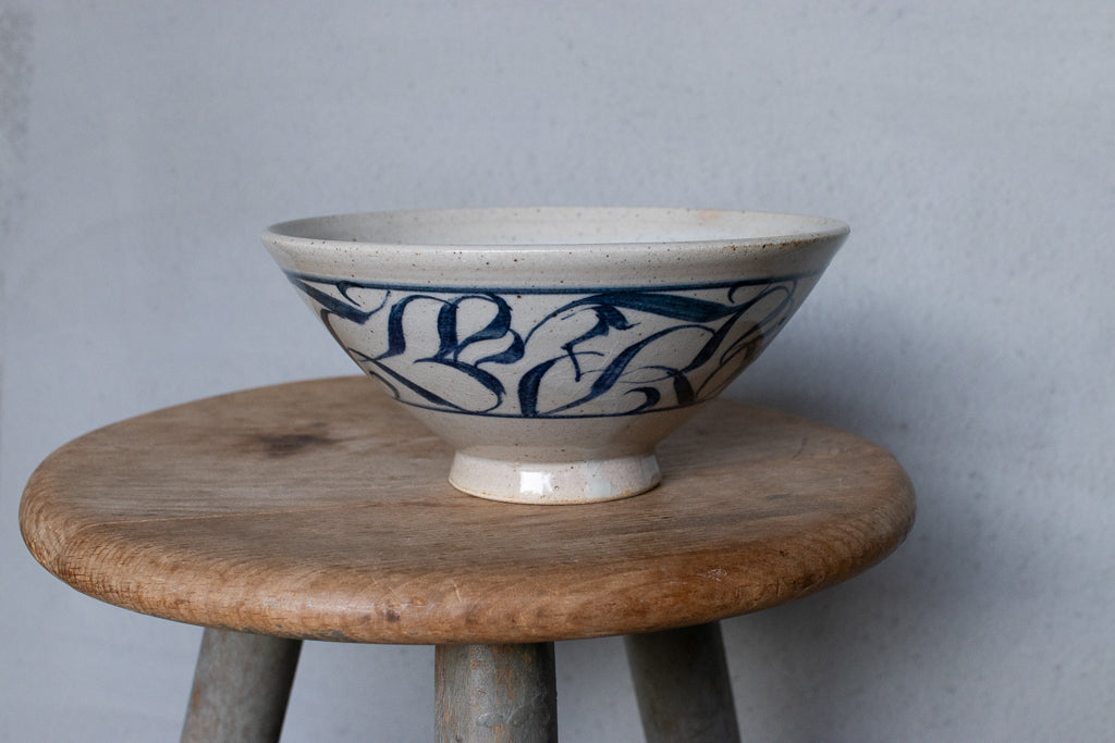 グラフィックアーティストrimさんと陶芸家の保田さんが手掛けるブランド「刻紋」の陶芸×カリグラフィー作品。フリーハンドとは思えない力強くも精緻なカリグラフィーが施されています。灯油窯で焼成することで渋い焼きめもついて極めて独特なバランスをもった作品に仕上がっています。元々掻き落としの技法で仕上げた作品が定番ですが、こちらは白の土灰釉ベースの上に青呉須で描画した新作です。民芸調の風合いが強く出て唯一無二の魅力を醸し出しています。図柄もすべてが一点ものの超貴重な作品です。フリーハンドとは思えない力強くも精緻なカリグラフィーが施されています。