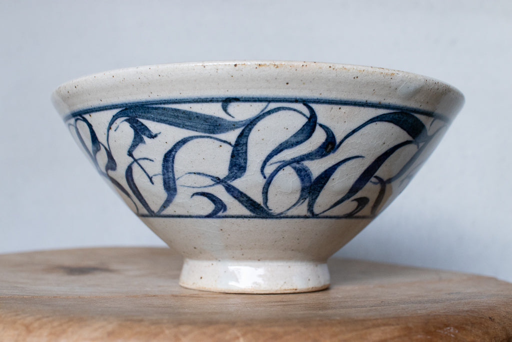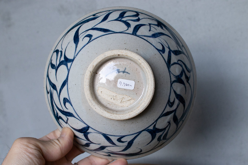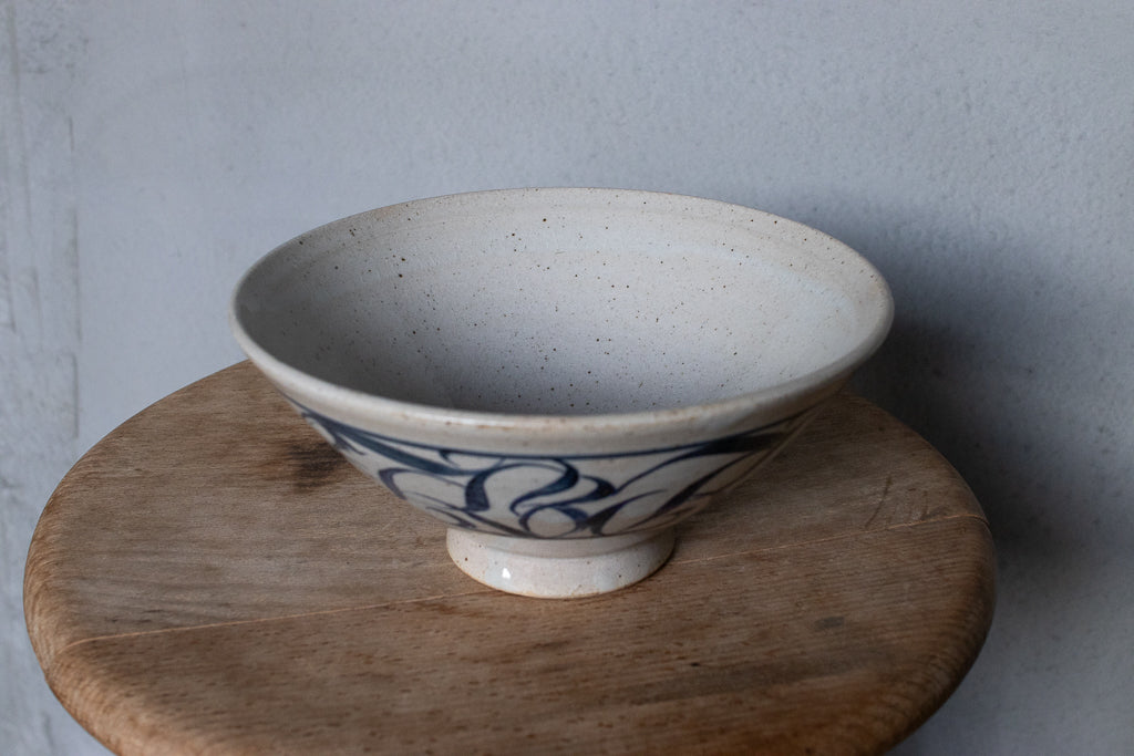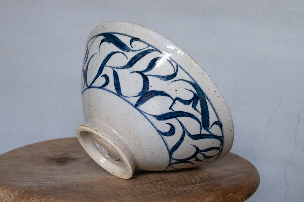 刻紋<Kokumon>の小丼。ニッチな層にぶっ刺さって人気の作品です。26年の新作。定番の飯碗をふたまわりほど大きくしたような小ぶりな丼。ひとつあるとかなり使いでのある絶妙なサイズ感です。呉須の絵付けは今回は青々と発色し格好良さが際立っています。フリーハンドで施される図柄は完全一点もの。ピンときたら決めちゃってください!