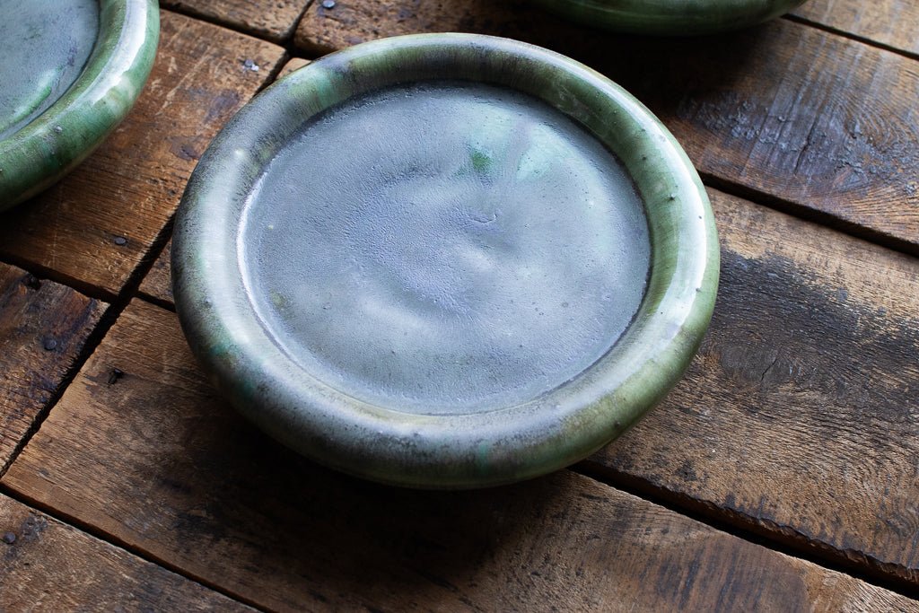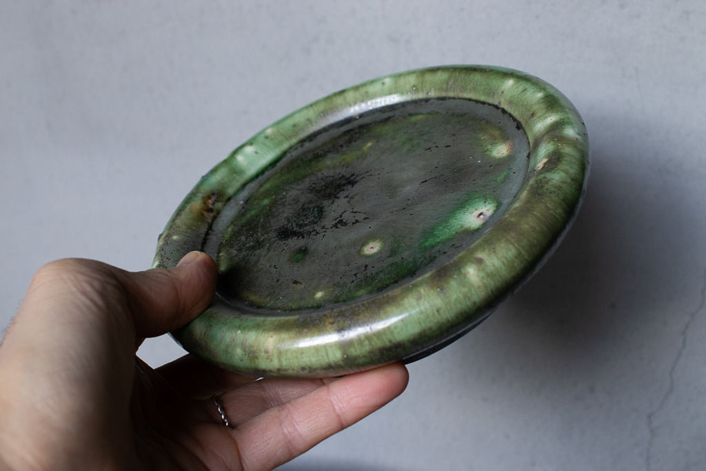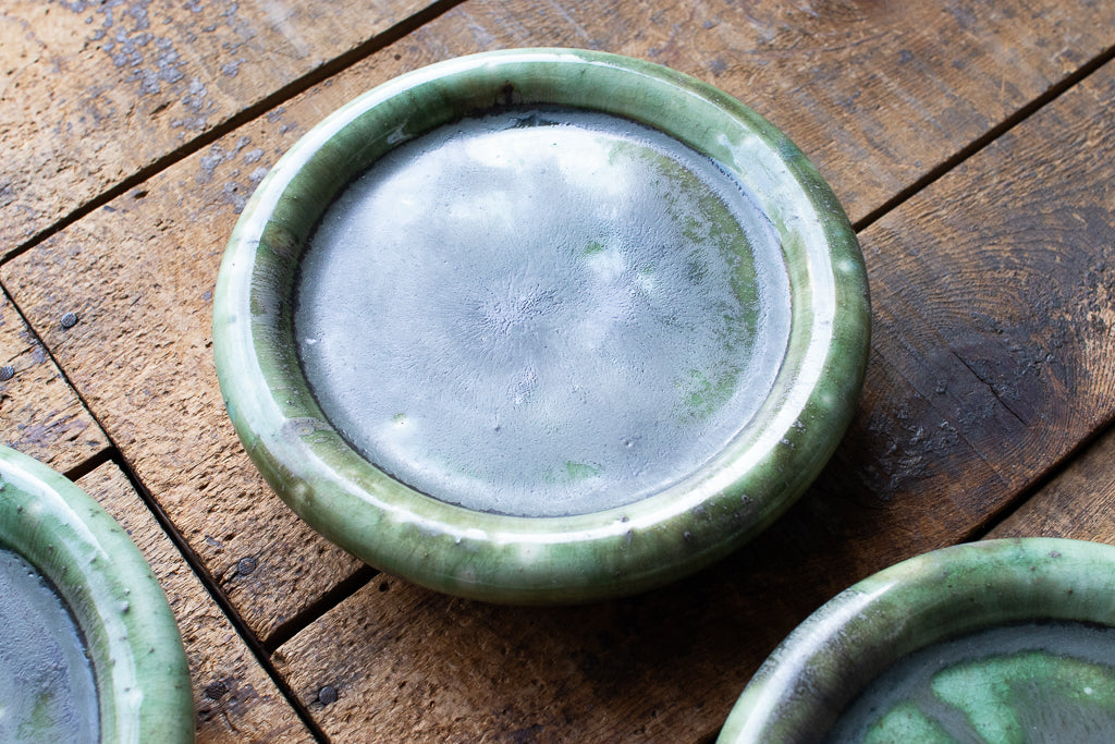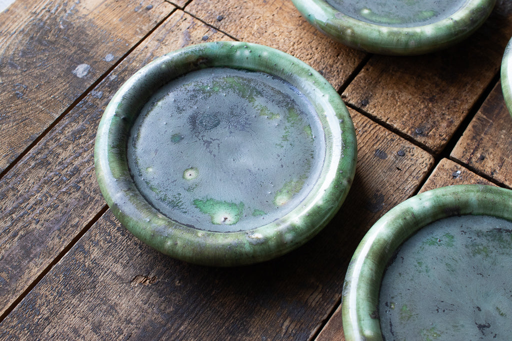 野中麟太郎さんのエアリーシリーズより、ぷっくりとしたフォルムがかわいい小皿です。立体的な造形ですが、中空になっており、持った感じは結構軽いです。食卓に少し高さが出て、良いアクセントになってくれますよ。一品料理も盛り付けやすく、飲食店さんにもよくお使いいただくアイテムです。複雑な色味のグリーンは初めて見る色でかなり良いです。