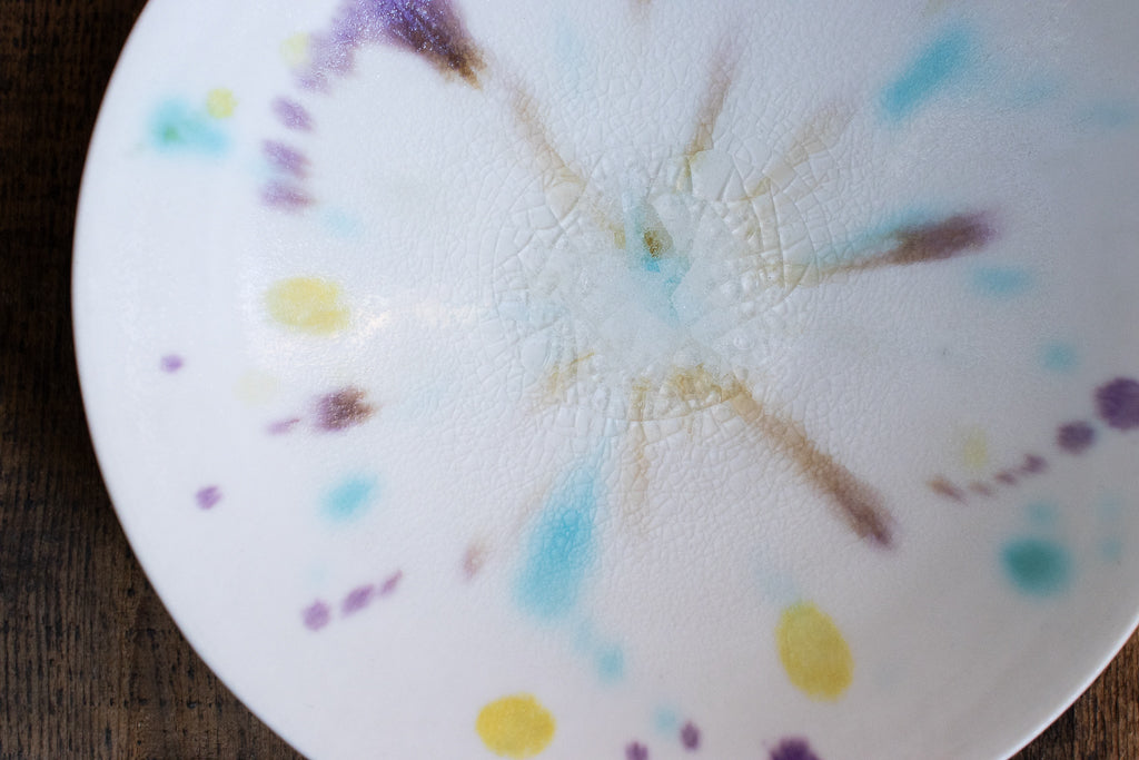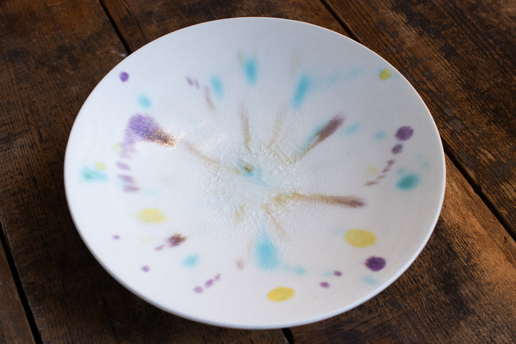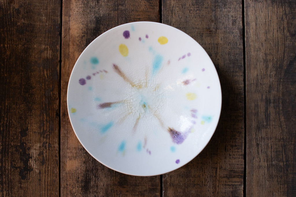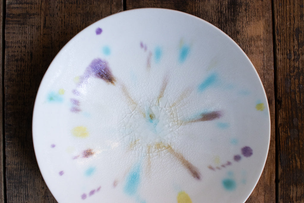 滋賀 大津に工房を構える馬場匠(ばんば たくみ)氏の浅小鉢です。クリーンなホワイトの地に色とりどりの釉薬が飛ばされた作品。見込みの透明釉の結晶も非常に美しいです。使用する釉薬の全てを自身の手で調合しており、同業者からも畏敬の念を込めて”変態”と呼ばれるほどだという馬場さん。奇跡的な色彩をお楽しみください。