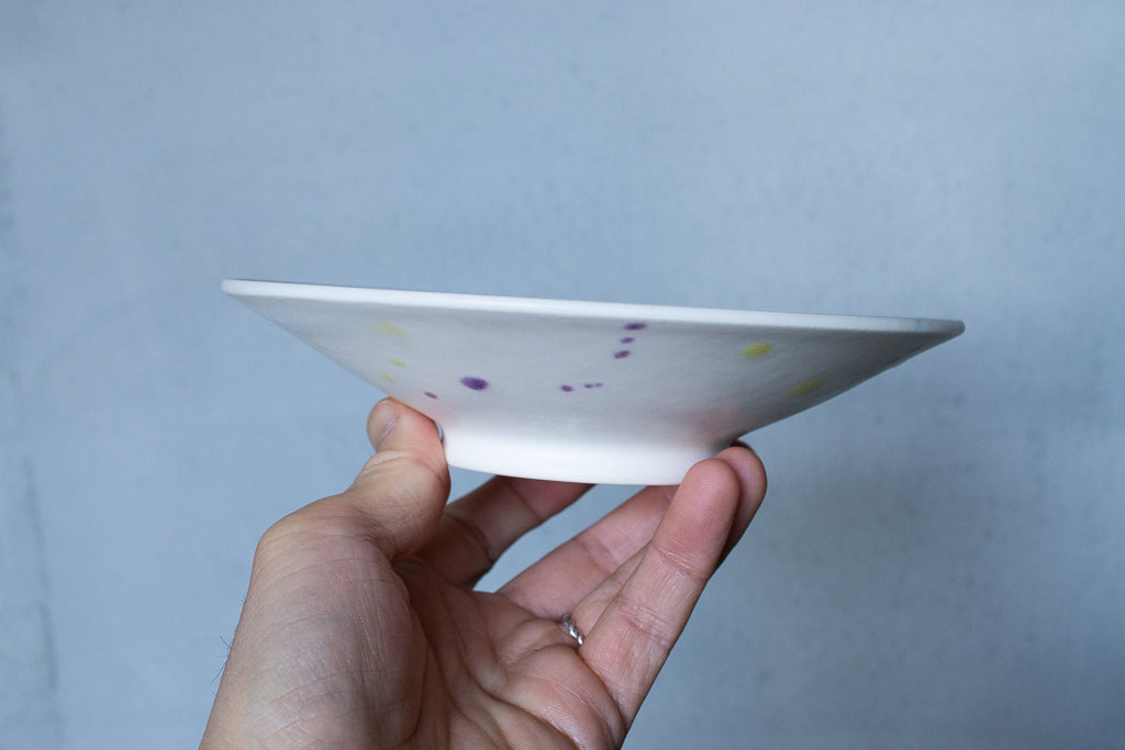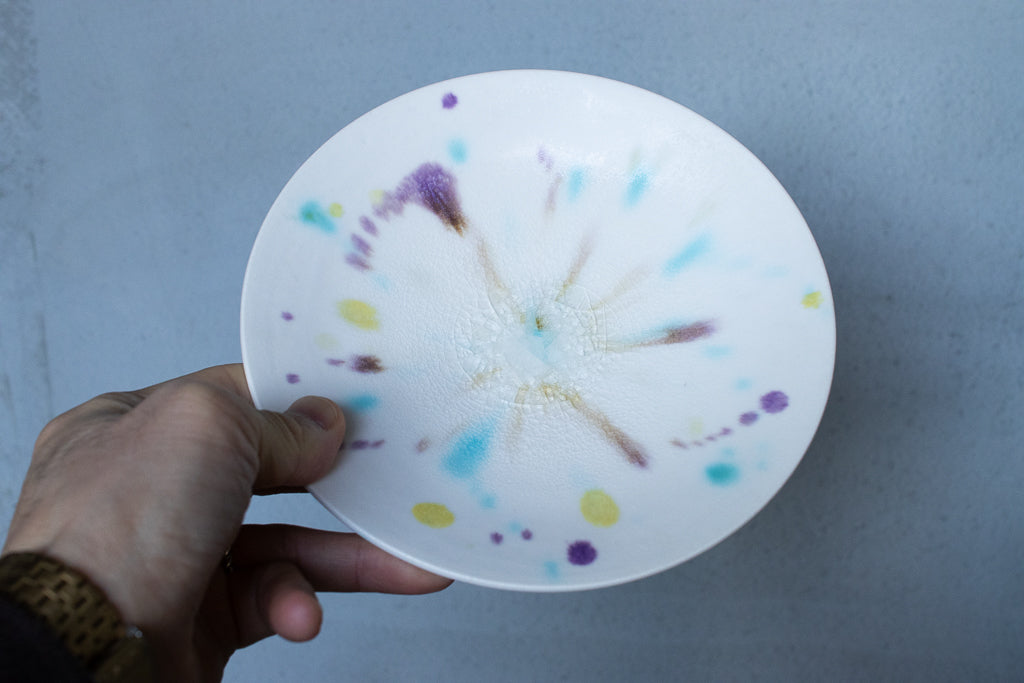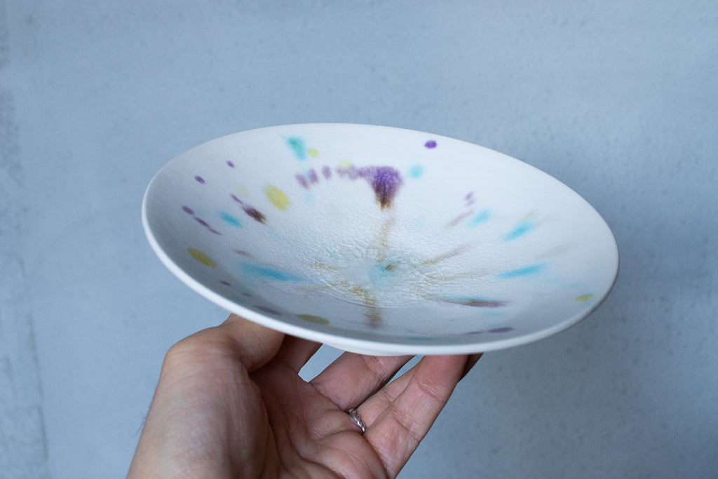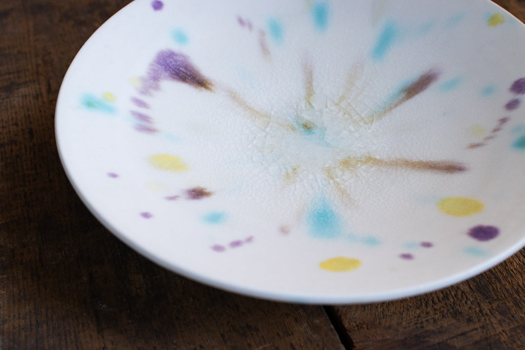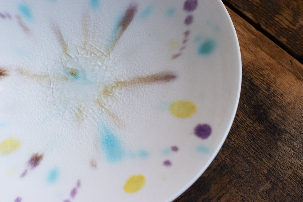 滋賀 大津に工房を構える馬場匠(ばんば たくみ)氏の浅小鉢です。クリーンなホワイトの地に色とりどりの釉薬が飛ばされた作品。見込みの透明釉の結晶も非常に美しいです。使用する釉薬の全てを自身の手で調合しており、同業者からも畏敬の念を込めて”変態”と呼ばれるほどだという馬場さん。奇跡的な色彩をお楽しみください。