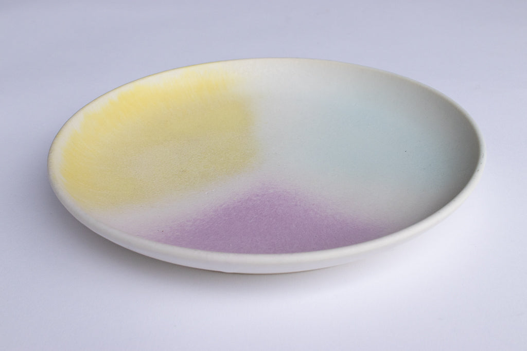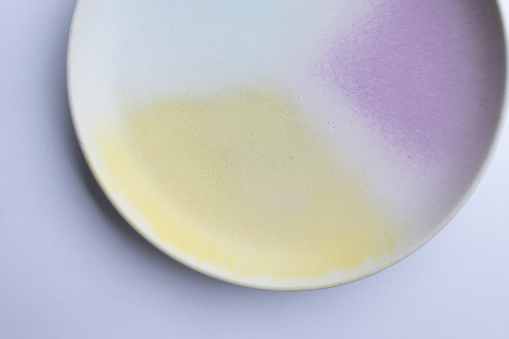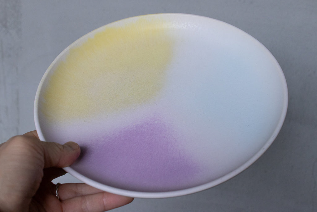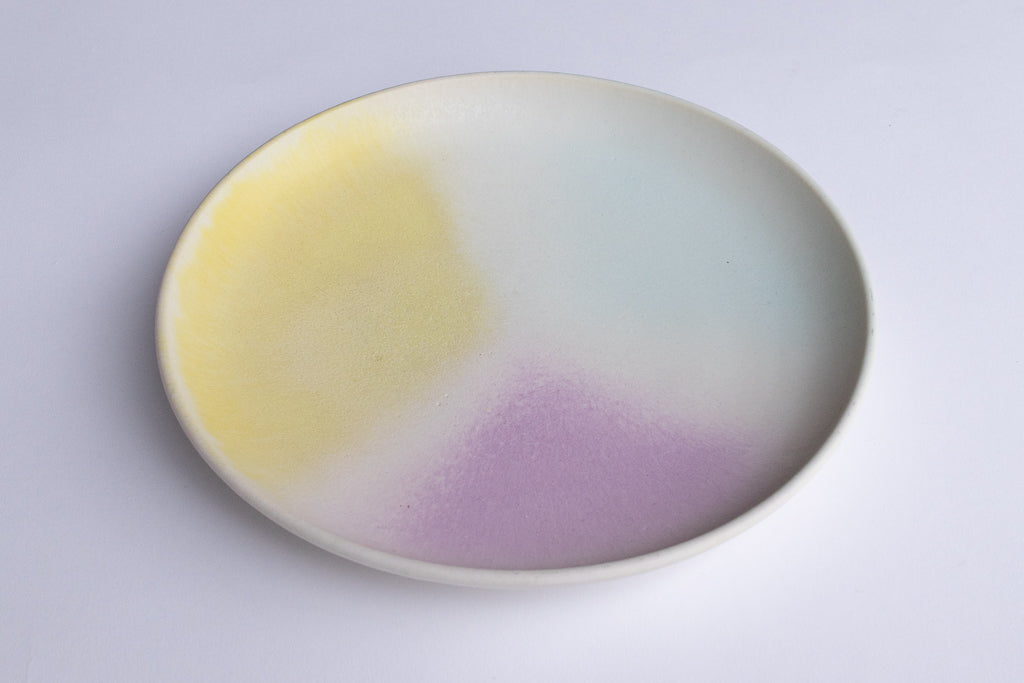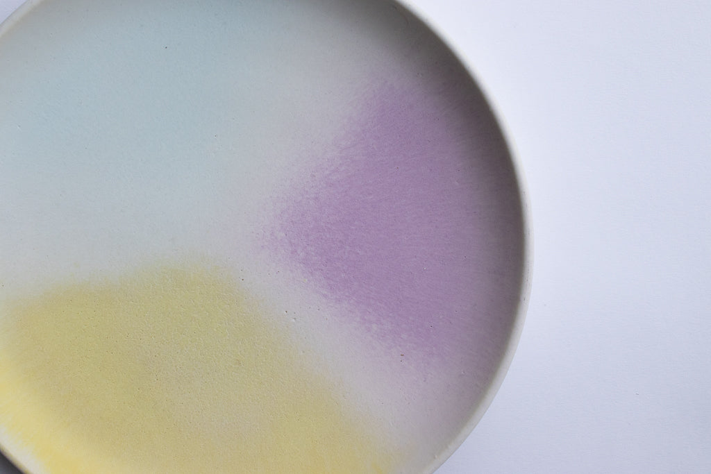 滋賀 大津に工房を構える馬場匠(ばんば たくみ)氏の丸皿です。ピンクパープル×イエロー×ブルーの美しい色彩の釉薬が掛け分けられています。22cmほどのサイズで、パン皿やディナープレートとして使い勝手のよいうつわです。