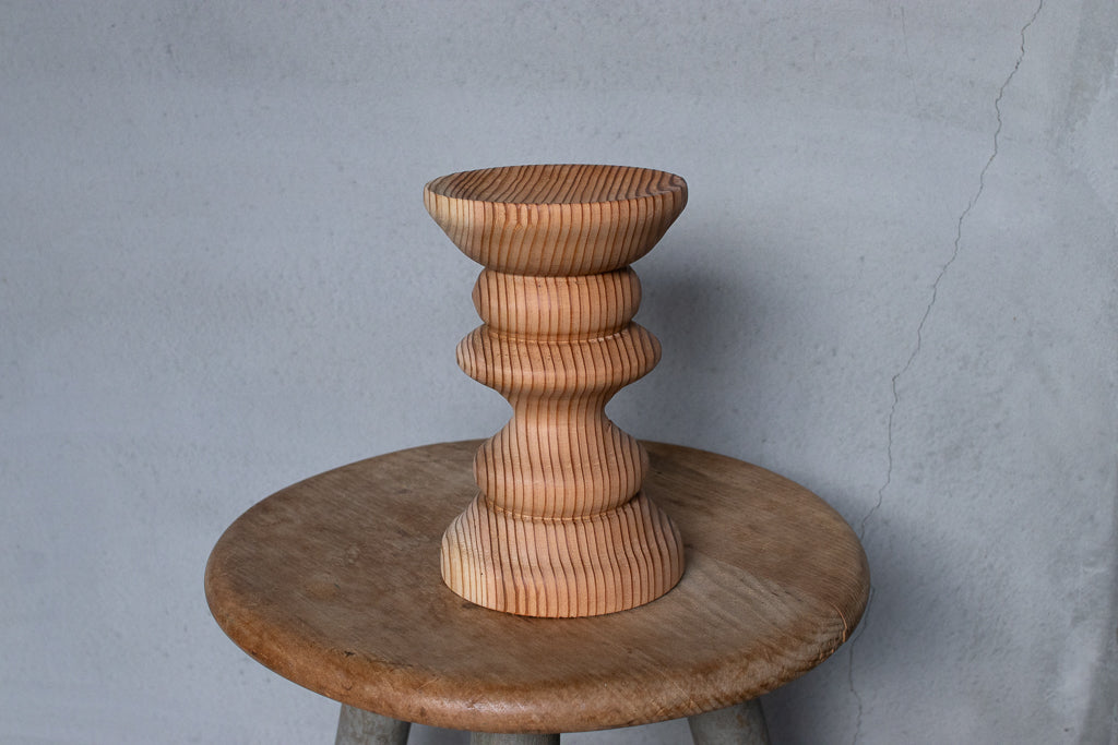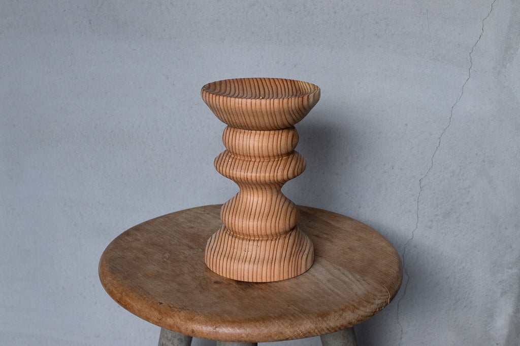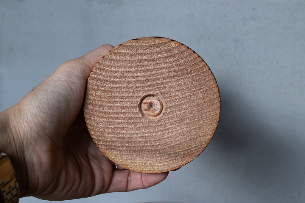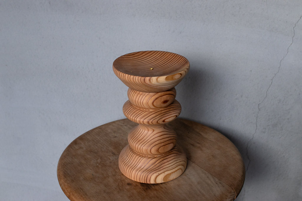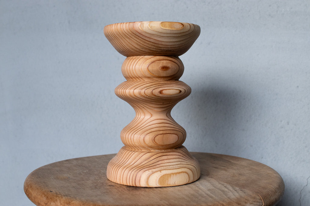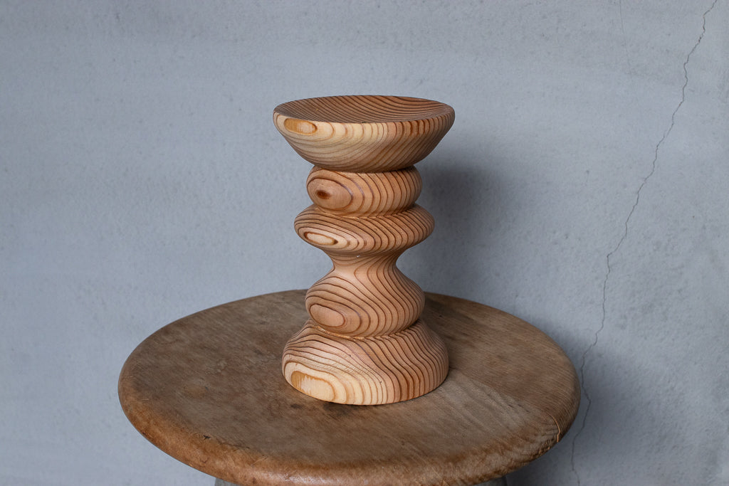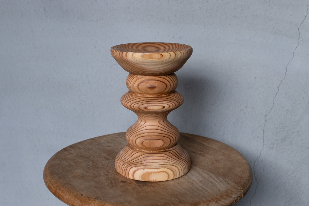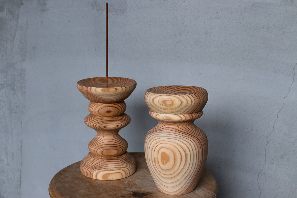 ブランドディレクターのアンジーがひとつひとつ杉の間伐材を旋盤で削りだし造形するインセンスホルダーは完全一点ものの作品です。ポップアップの際には、お香立てとしてはもちろんアクセサリーなどの小物置きとして使うという方もたくさんいらっしゃいました。単体で飾っておくだけでもサマになる作品です。