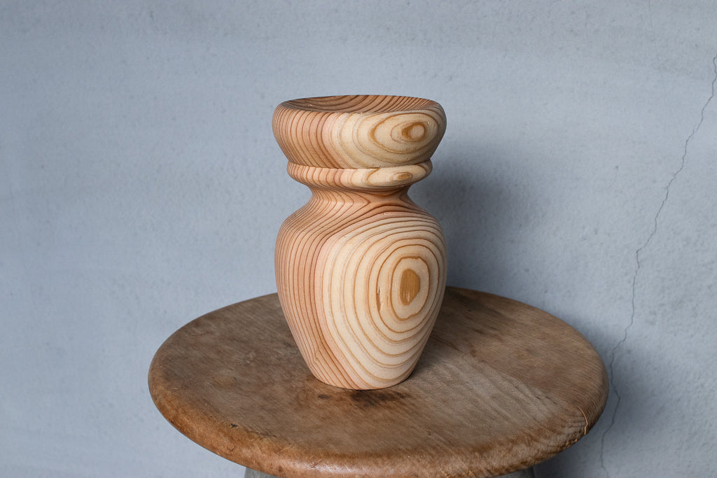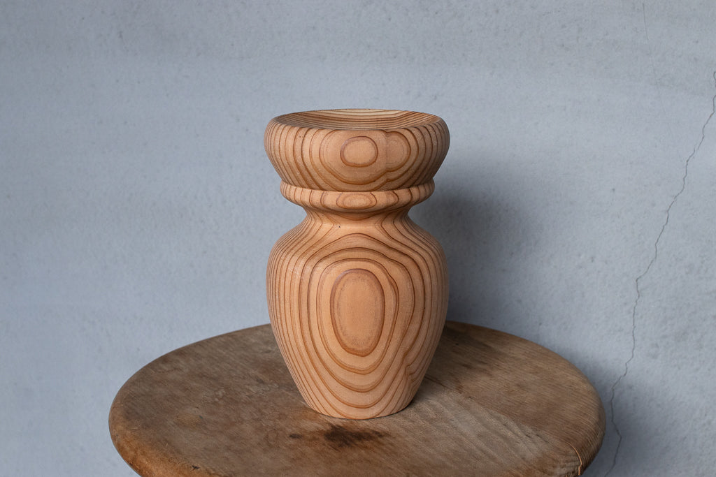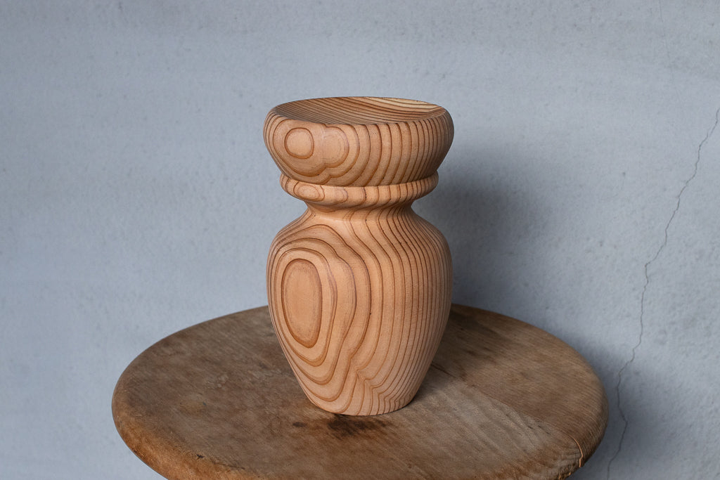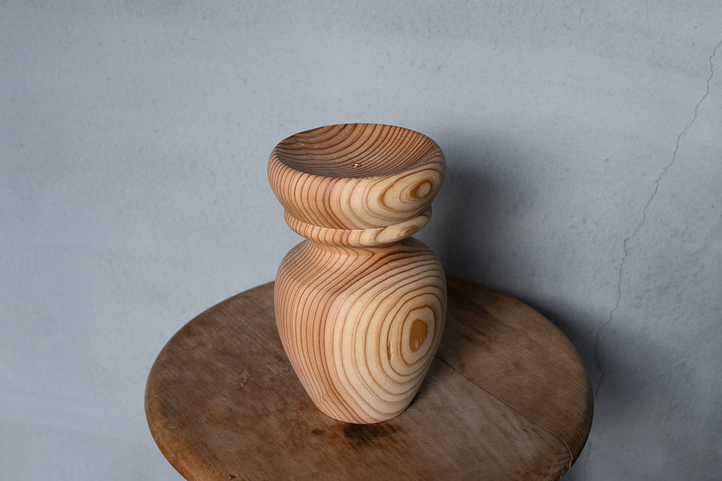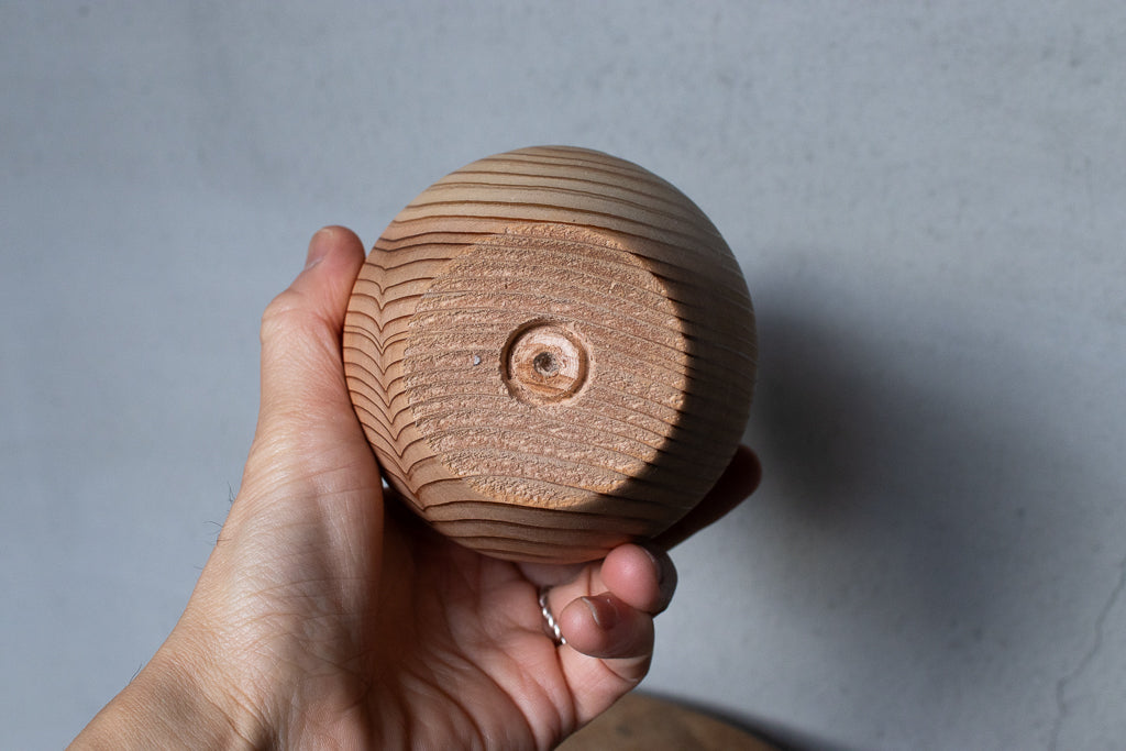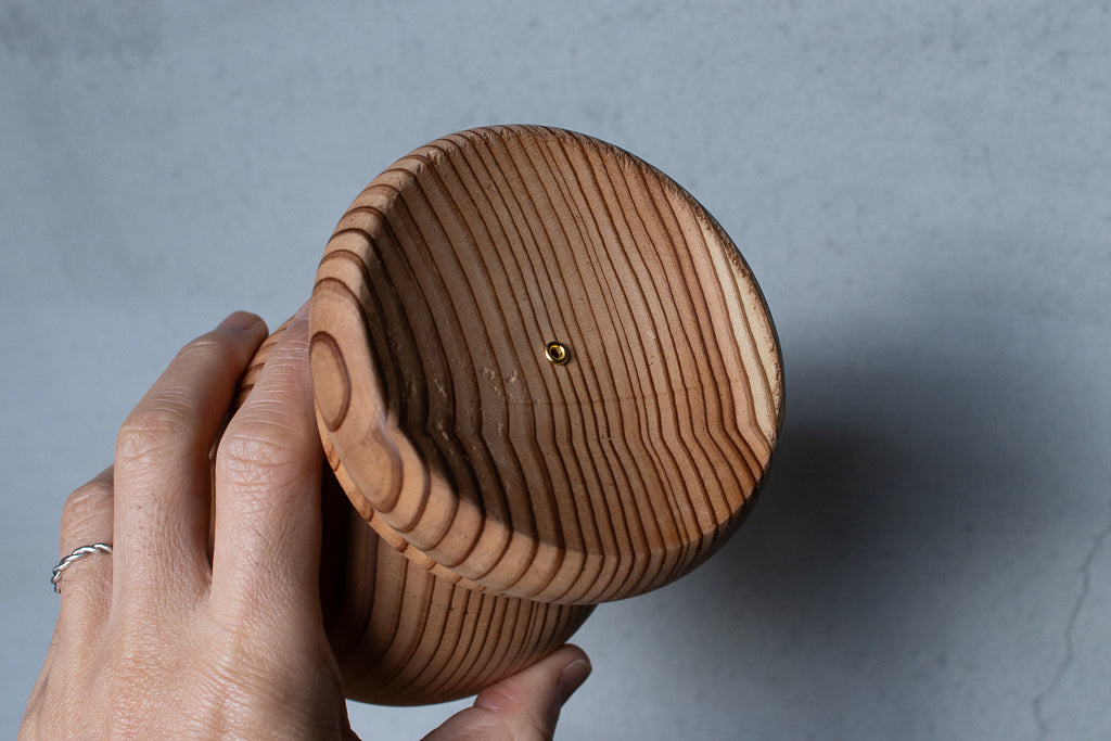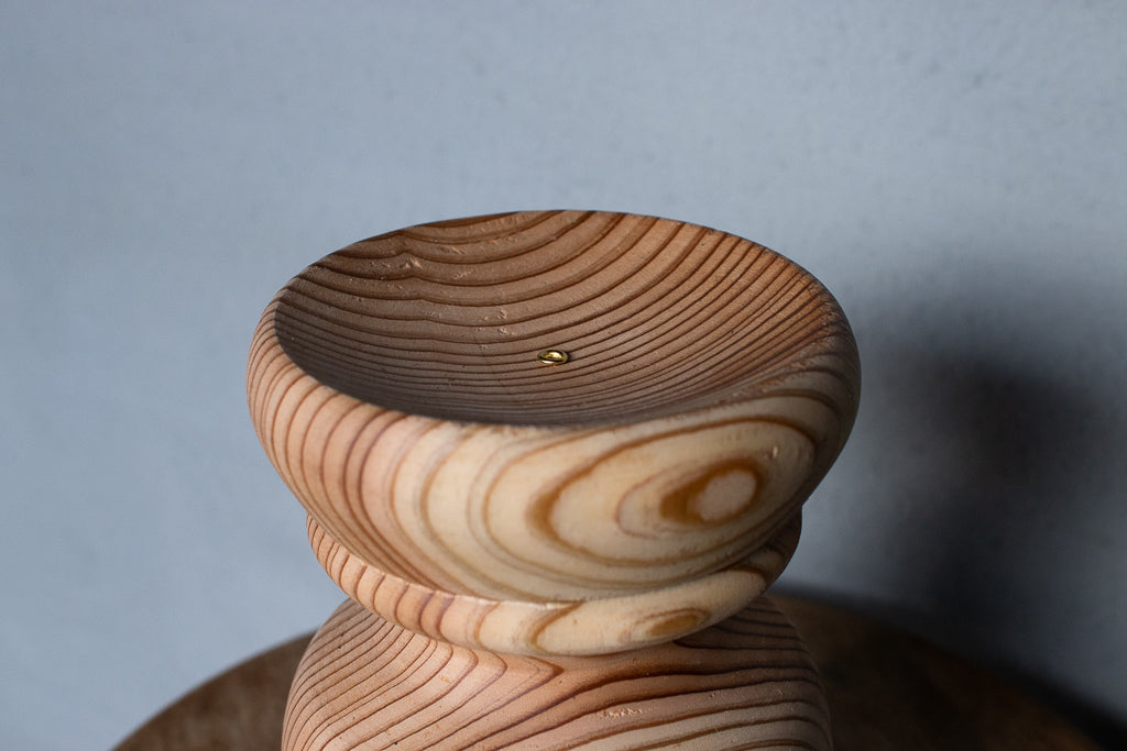 ブランドディレクターのアンジーがひとつひとつ杉の間伐材を旋盤で削りだし造形するインセンスホルダーは完全一点ものの作品です。ポップアップの際には、お香立てとしてはもちろんアクセサリーなどの小物置きとして使うという方もたくさんいらっしゃいました。単体で飾っておくだけでもサマになる作品です。