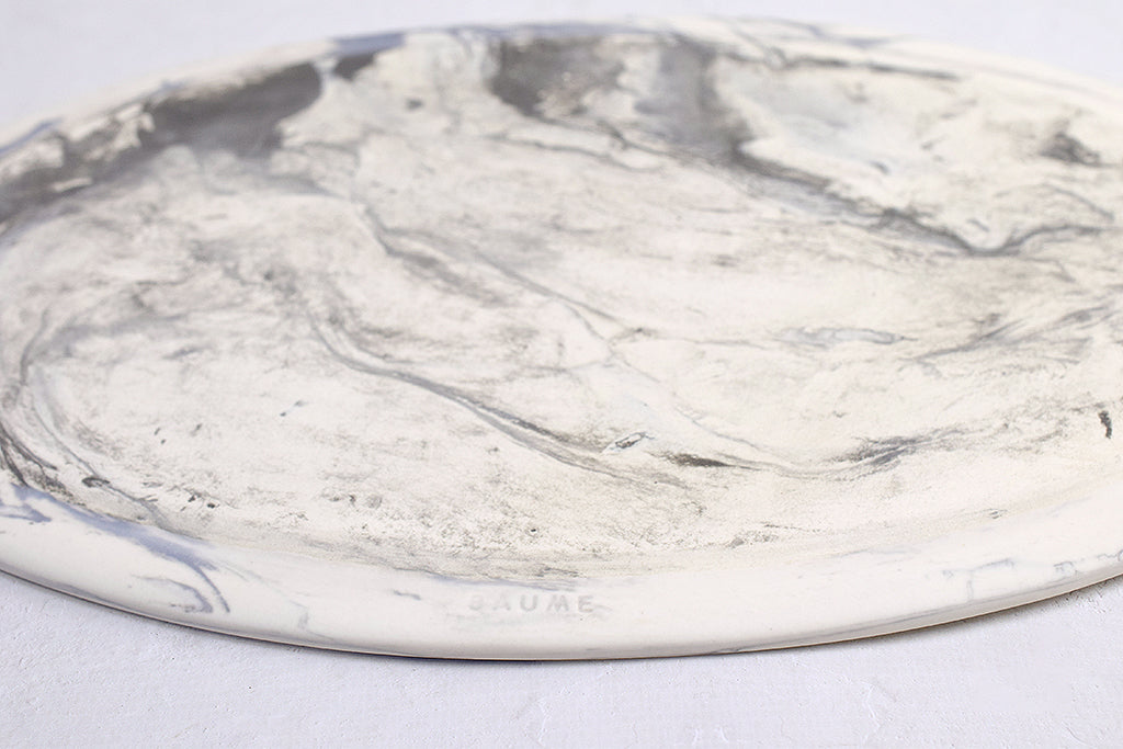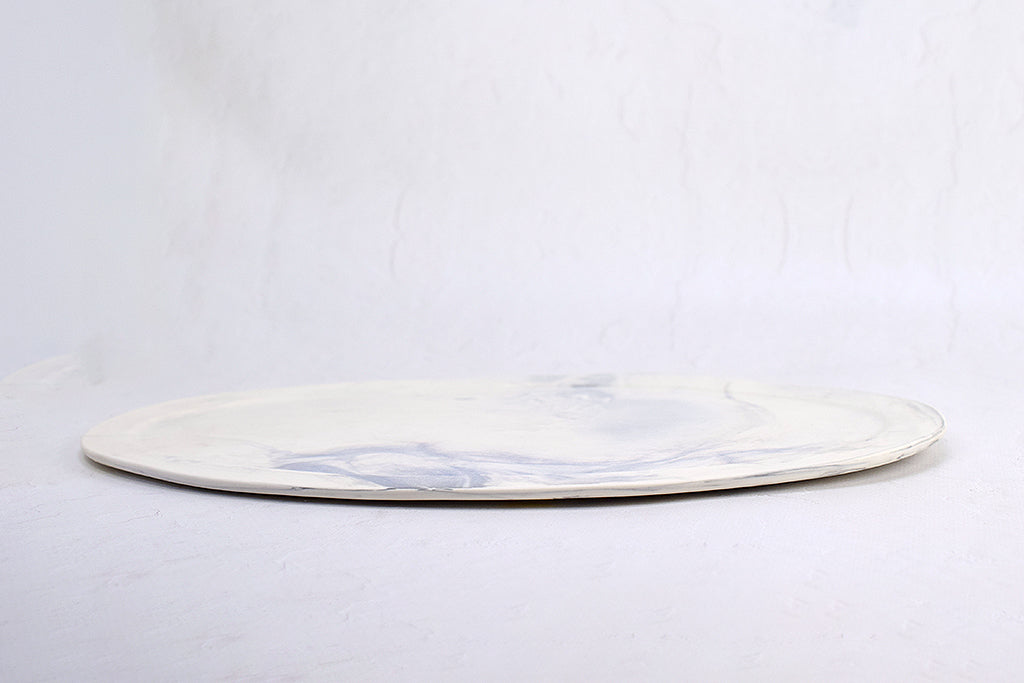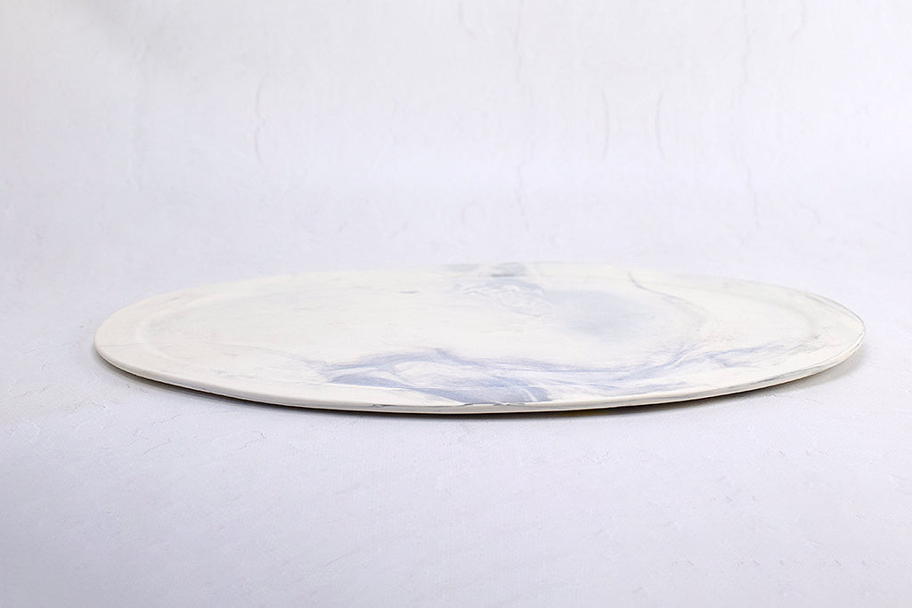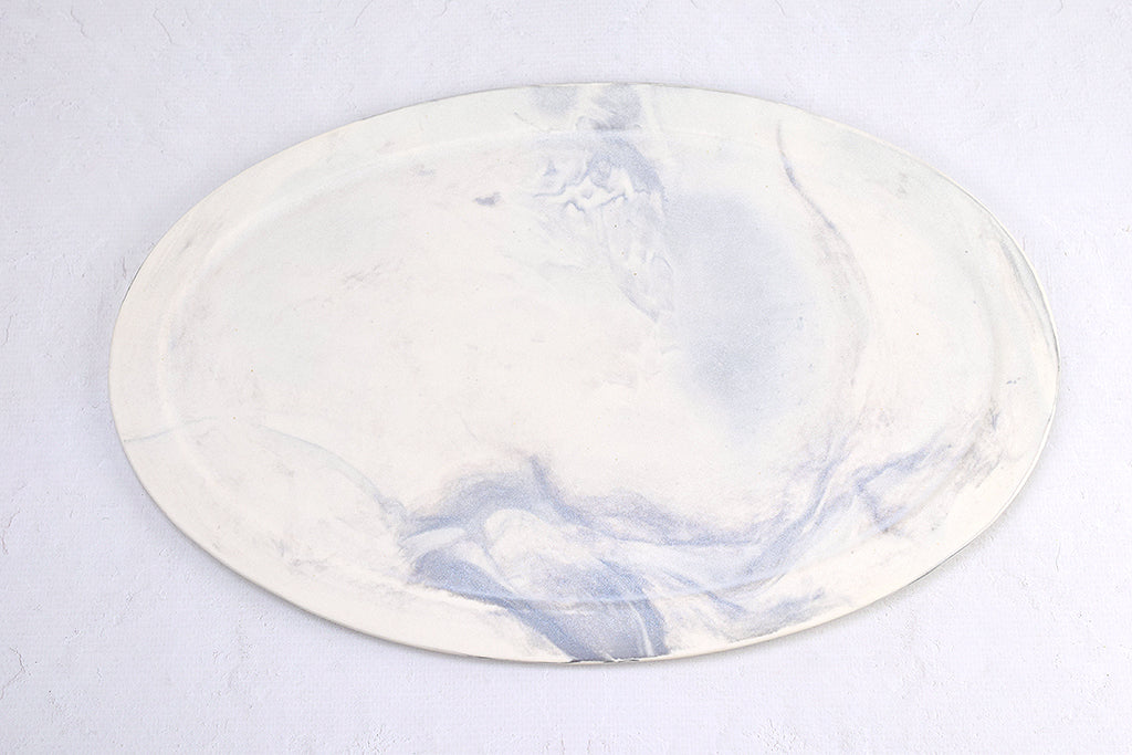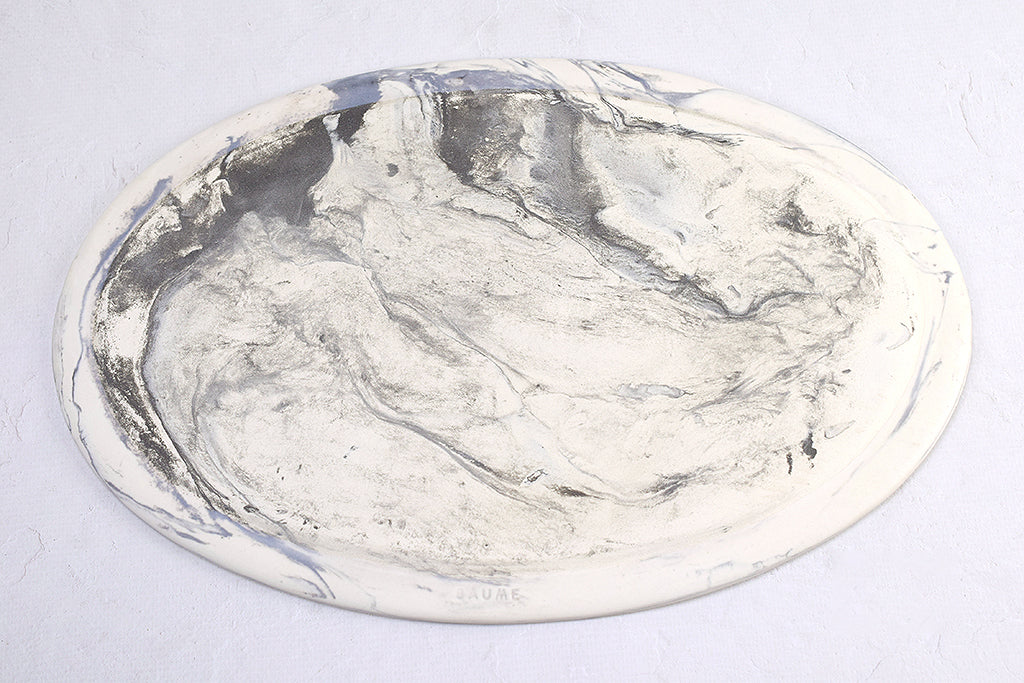 大阪 堺のうつわボーメさんの定番オーバル皿。こちらは大きいサイズで板皿タイプ、カラーは白地にグレーの練り混み模様です。