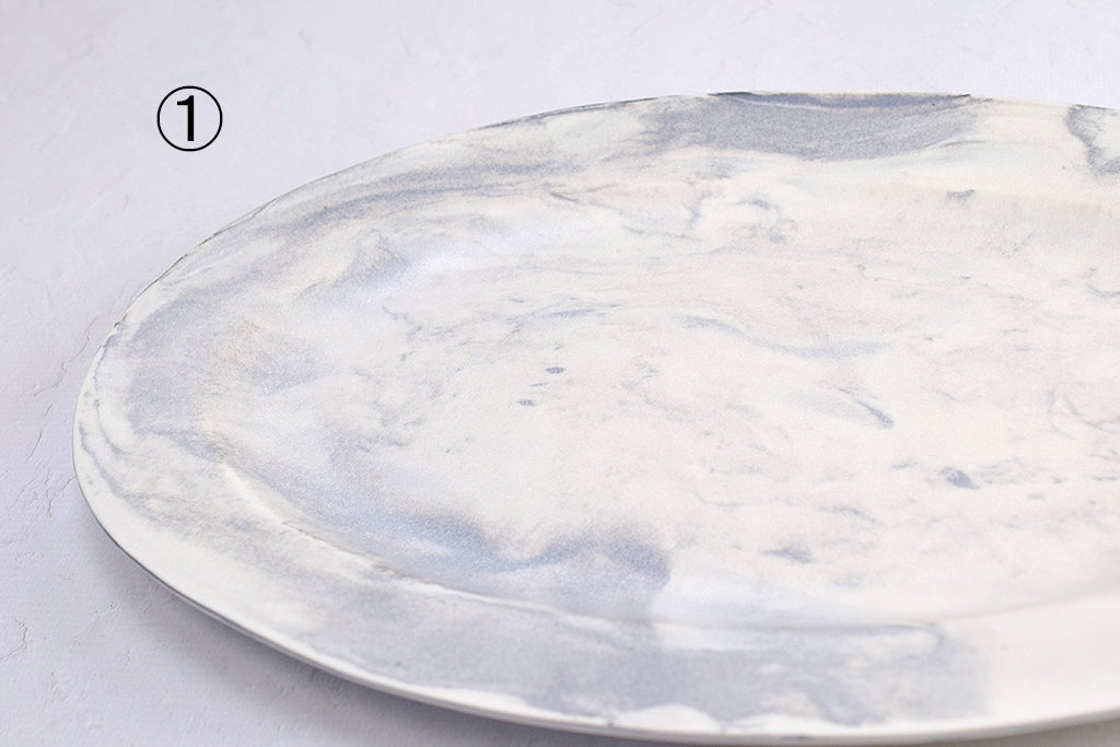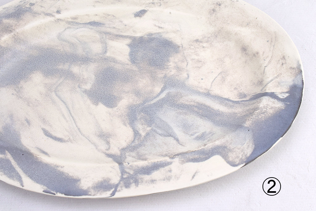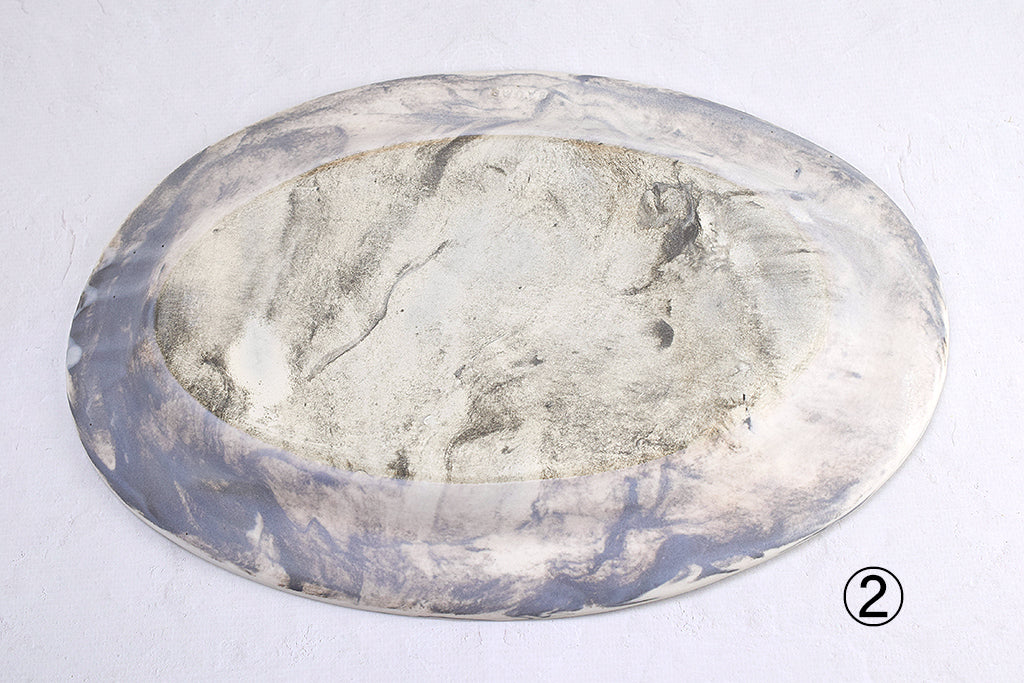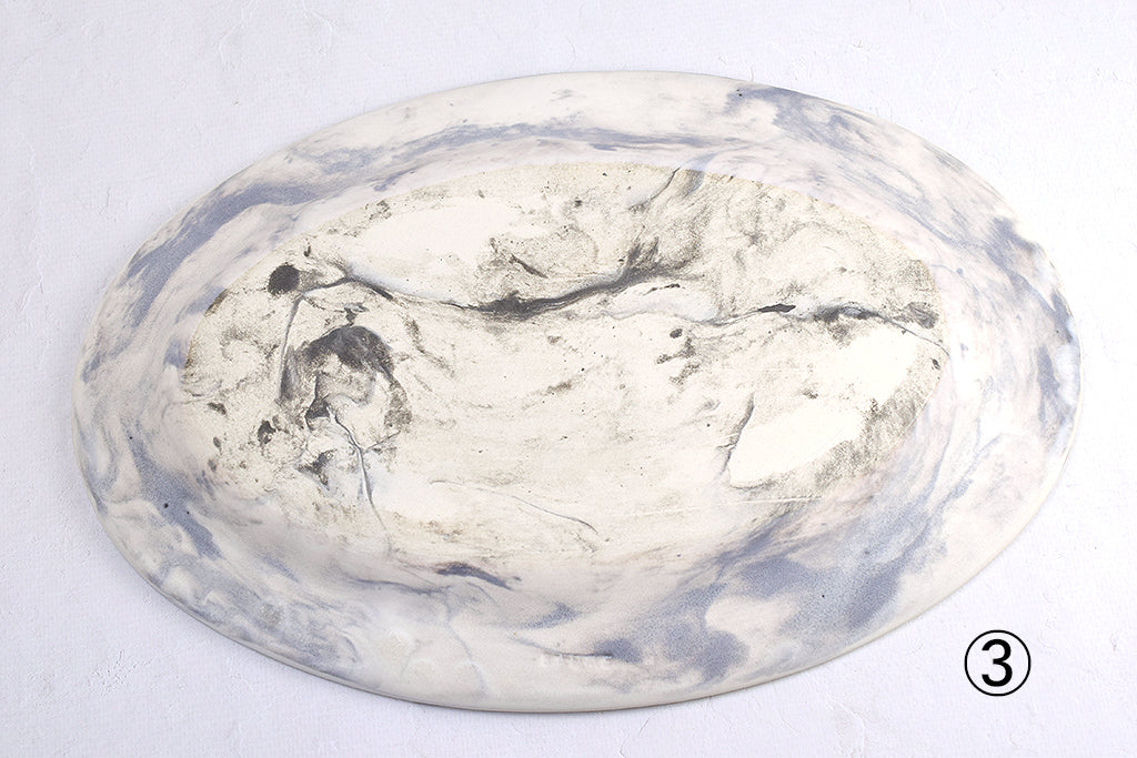ボーメさん定番のツルリとした半磁土が美しいオーバル皿です。練り込みの模様が効いていますね。