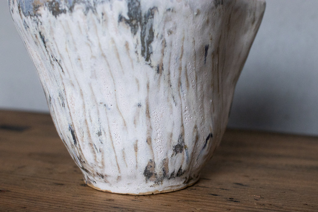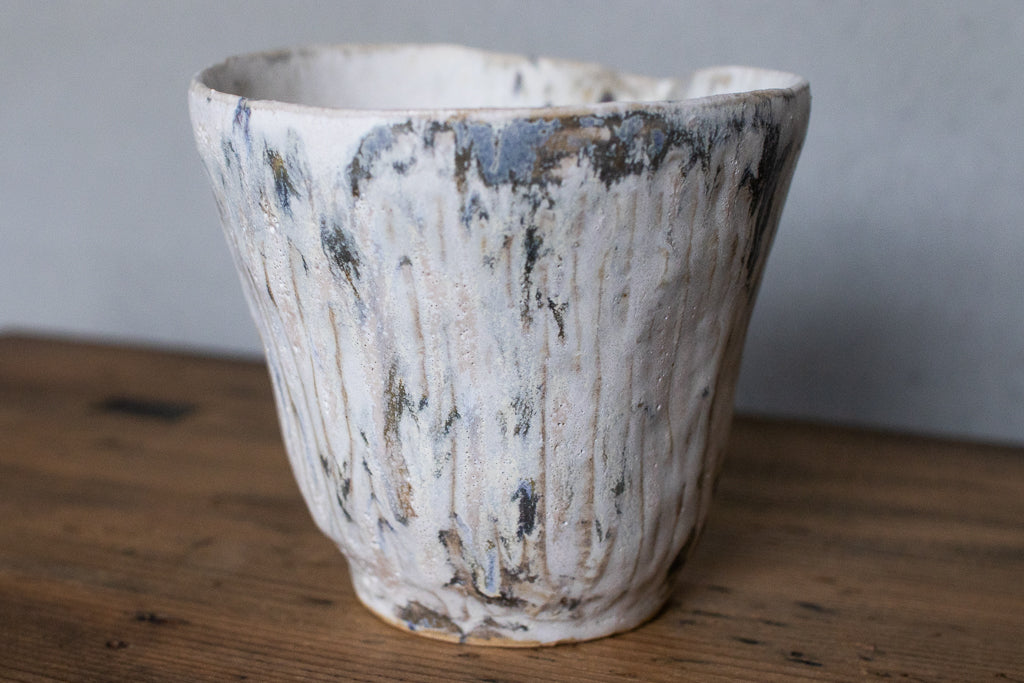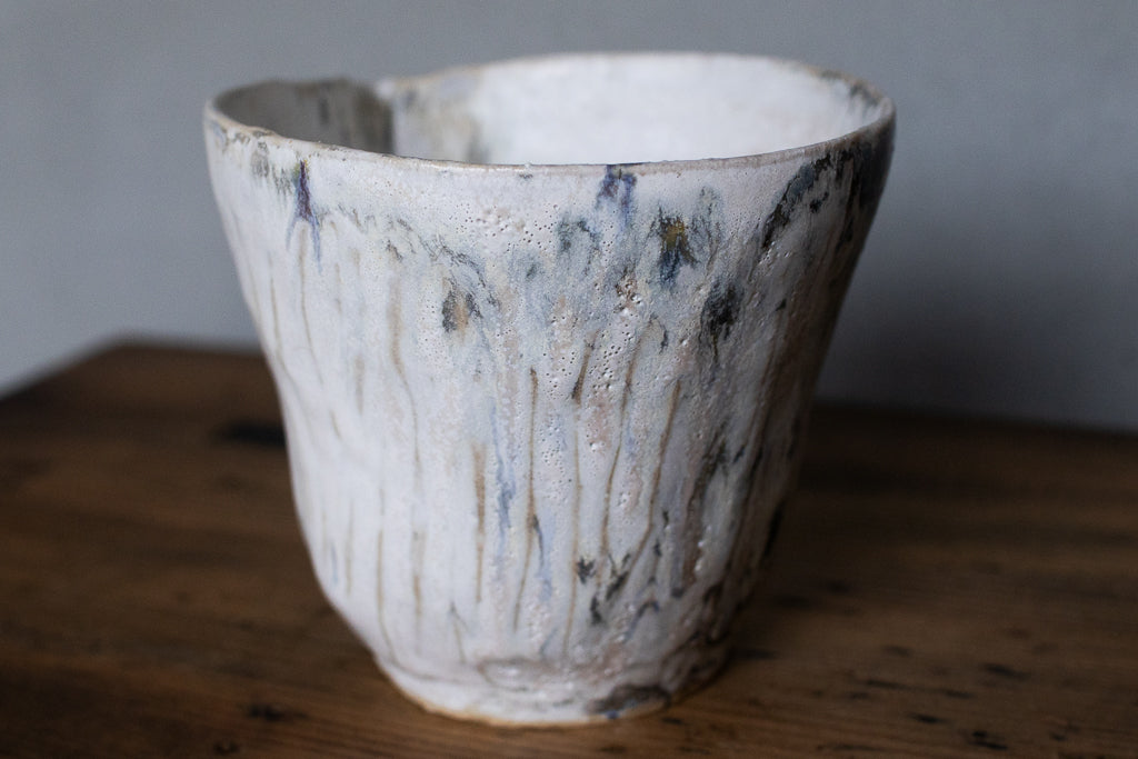 故郷台湾の風景を作陶のインスピレーションとしているイェンさん。山水と名付けられた白ベースに釉の流れが美しいこちらの作品は台湾ではめったに降らないという雪の景色を想像して作られたのでしょうか。見込みの結晶の美しさも特筆もの。透明なお酒を入れると大層見栄えがするでしょうが、コーヒーの道具としても良さそうです。