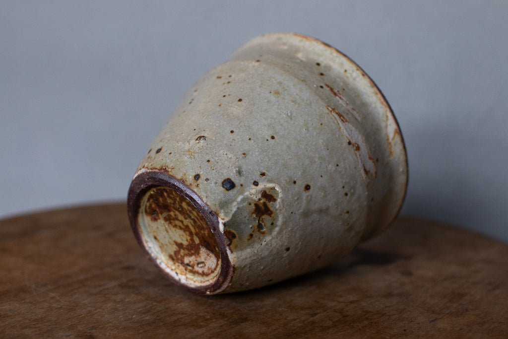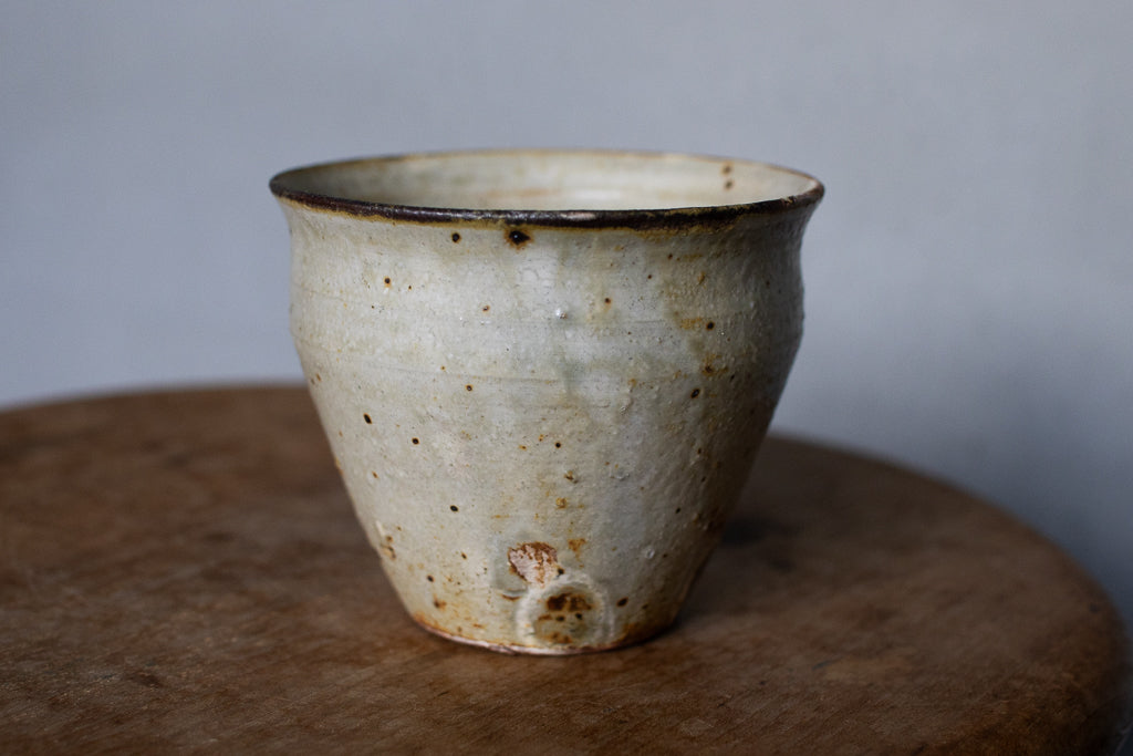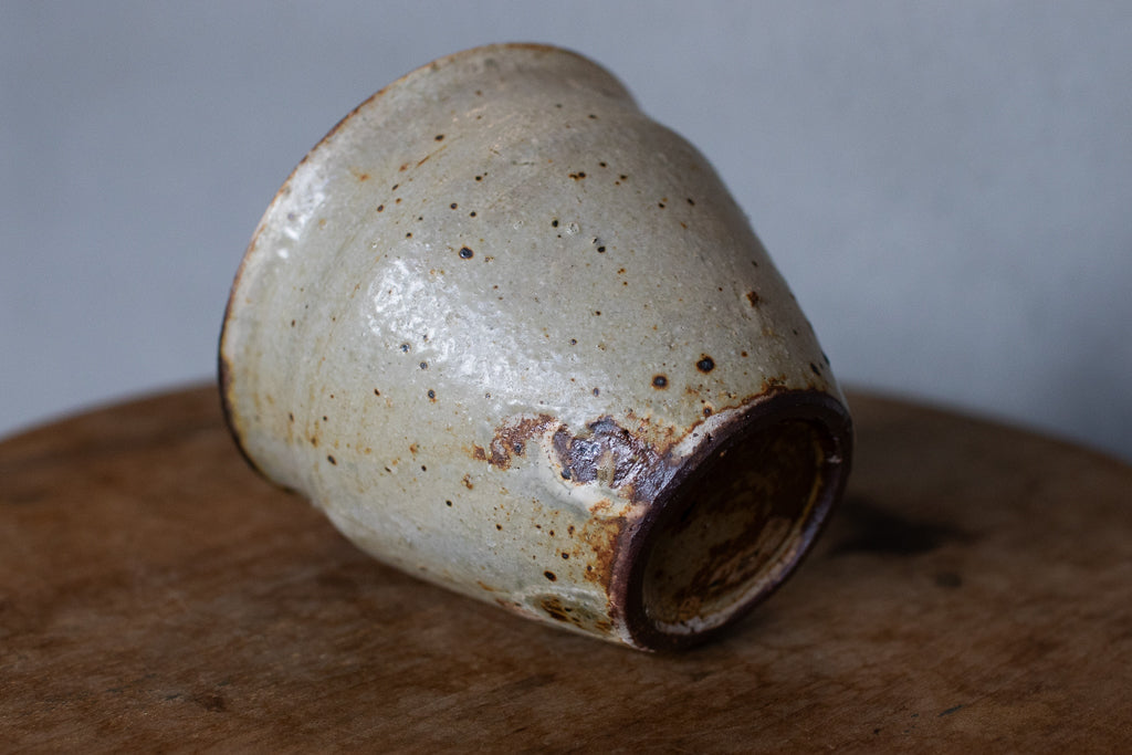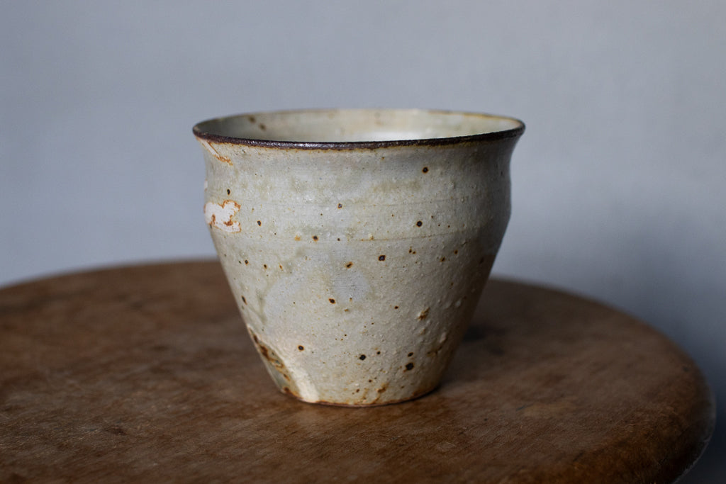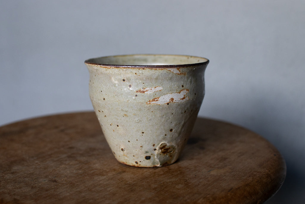 ガラス釉の作品が人気のタナカ製陶さんですが、年に1~2回焼くかどうかという貴重な薪窯の作品も頂くことができました。こちらはインドの素焼きのチャイカップを模した作品。本場のものは簡素な素焼きで、一度使ったら飲み捨てたりするらしいですが、それを薪窯焼成するところにタナカさんの遊び心を感じます。くびれのあるキュートな造形に薪の灰が溶けた渋いテクスチャが載ってなんとも独特な空気をまとっています。程よいサイズ感で、湯呑などにちょうど良いかと。タナカさんの工房に伺った際にはこれでコーヒーを出して頂けたのですが、それもとても良い塩梅でした。