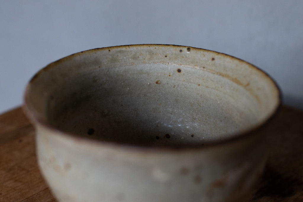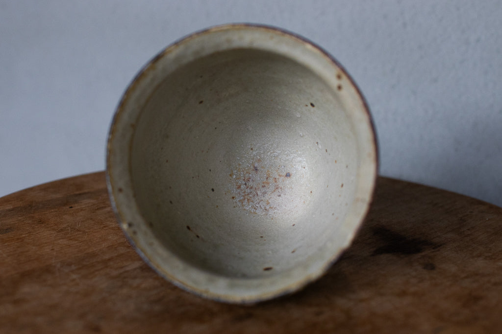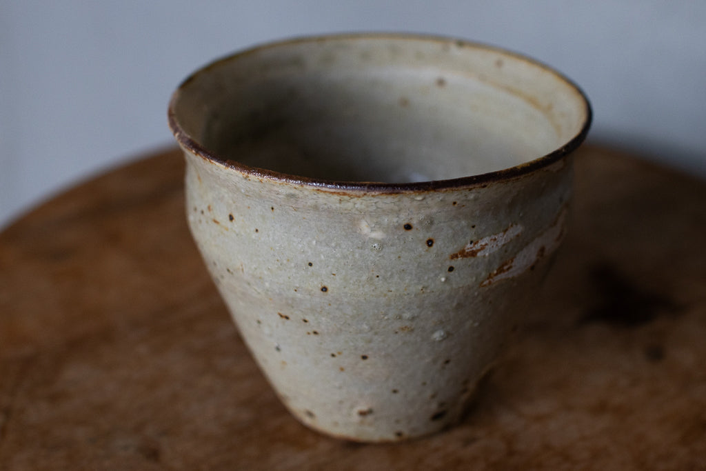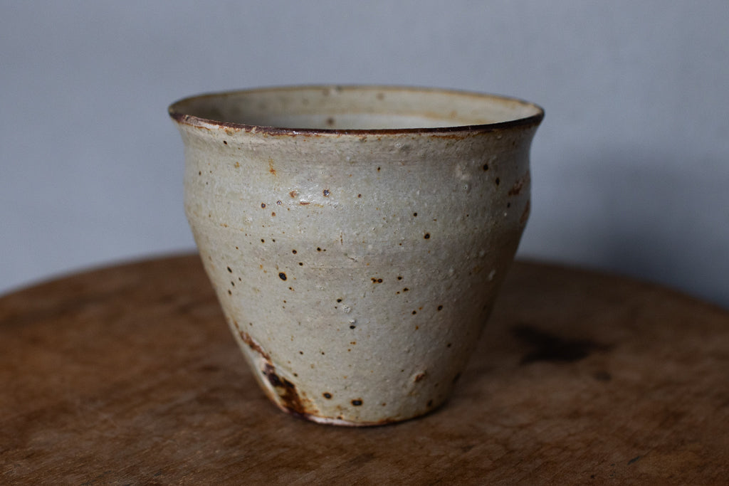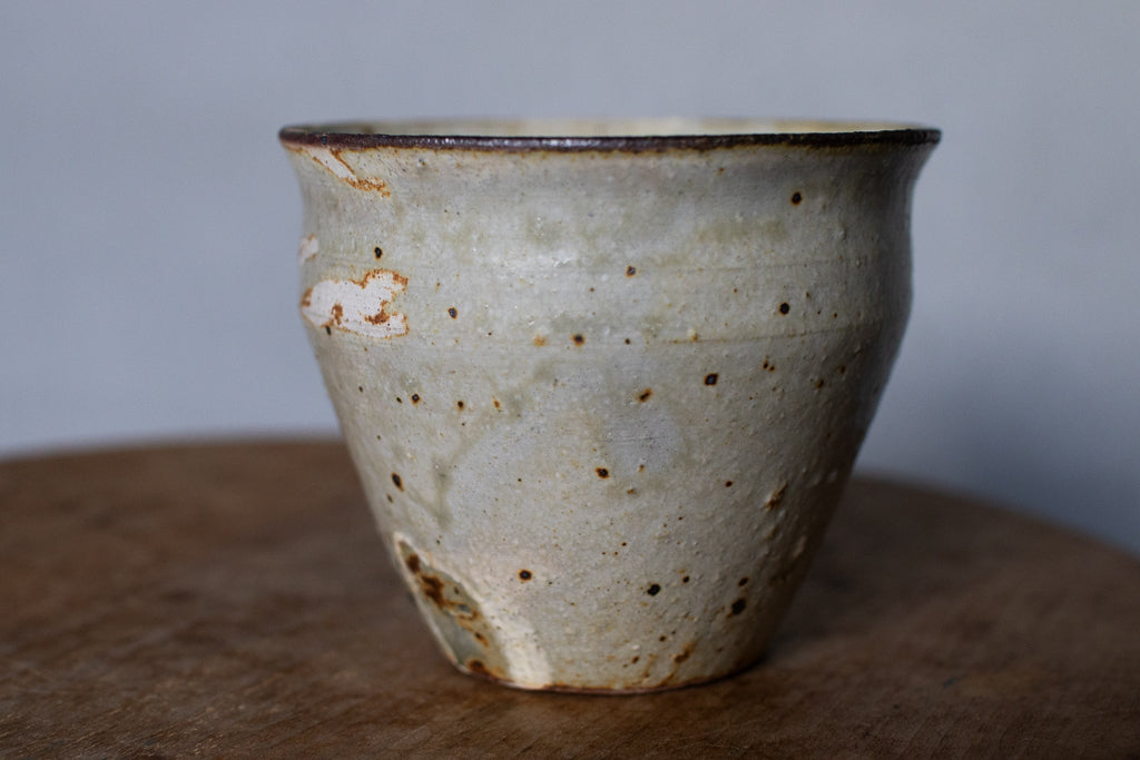 ガラス釉の作品が人気のタナカ製陶さんですが、年に1~2回焼くかどうかという貴重な薪窯の作品も頂くことができました。こちらはインドの素焼きのチャイカップを模した作品。本場のものは簡素な素焼きで、一度使ったら飲み捨てたりするらしいですが、それを薪窯焼成するところにタナカさんの遊び心を感じます。くびれのあるキュートな造形に薪の灰が溶けた渋いテクスチャが載ってなんとも独特な空気をまとっています。程よいサイズ感で、湯呑などにちょうど良いかと。タナカさんの工房に伺った際にはこれでコーヒーを出して頂けたのですが、それもとても良い塩梅でした。