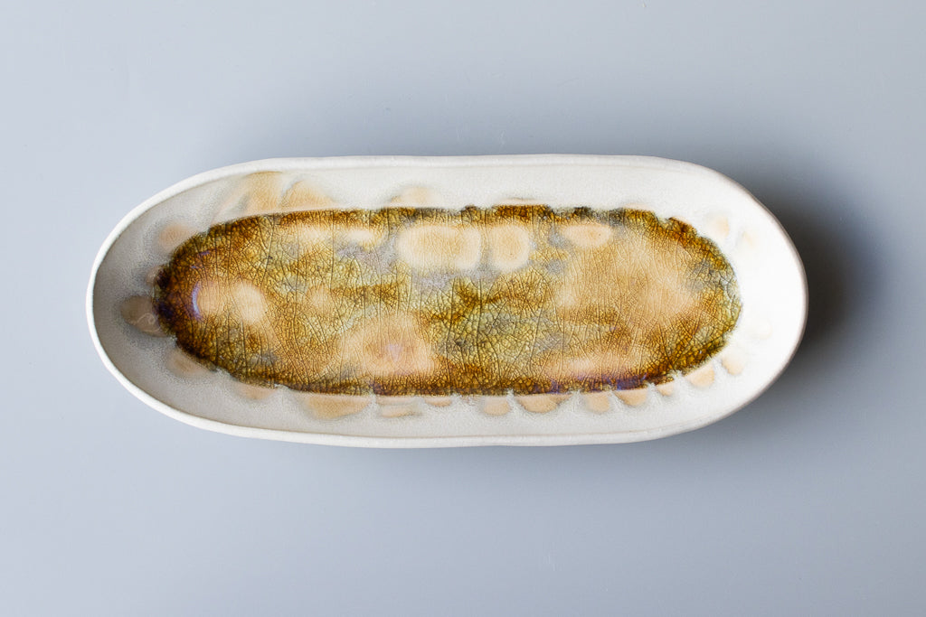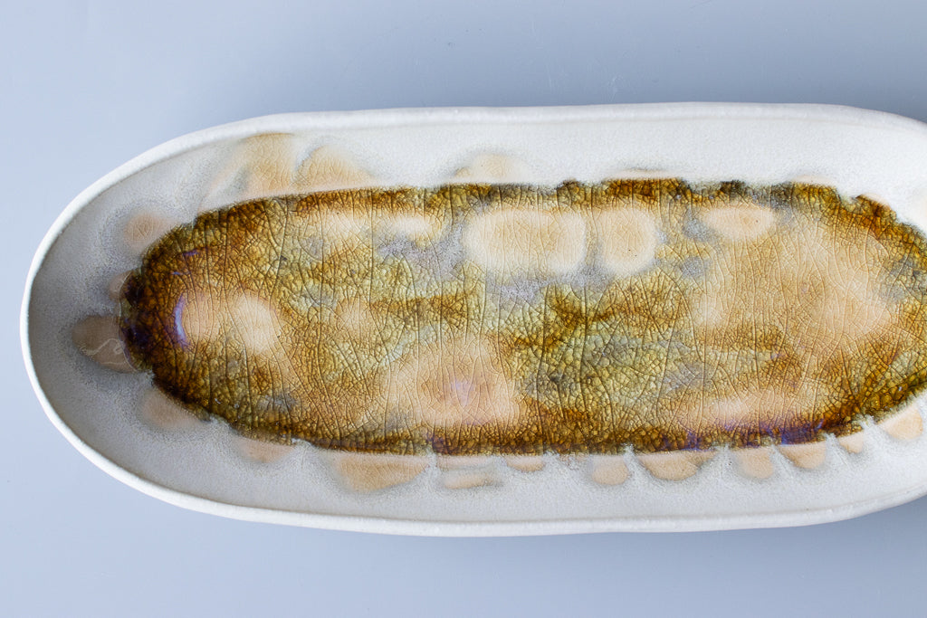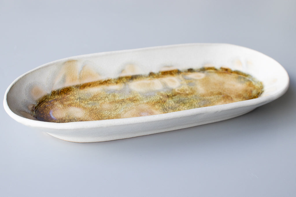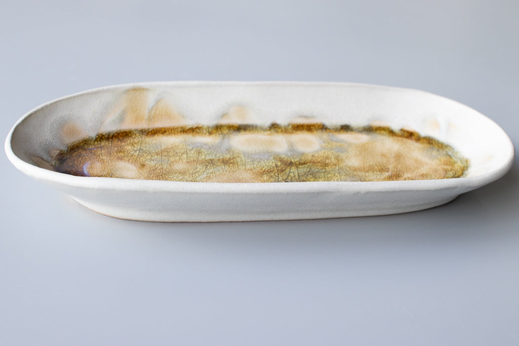 ユニークな楕円皿。反り上がったリムを流れる釉薬の淡い色味と見込みに溜まった濃く重なり感のある結晶が好対照で美しいです。少々の汁気も受け止めてくれるので何かと便利にお使い頂けそう。