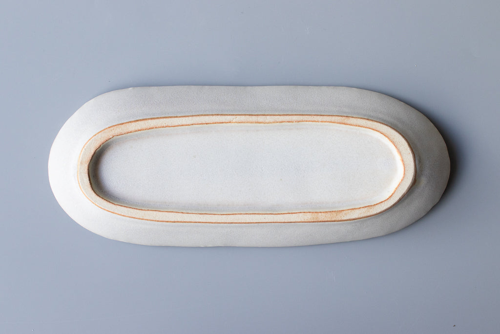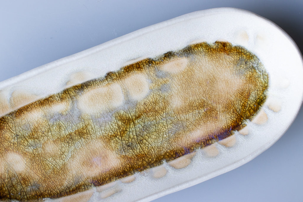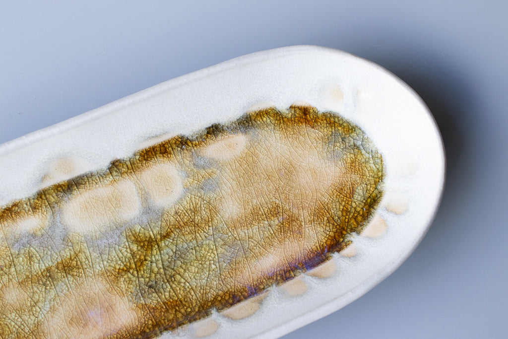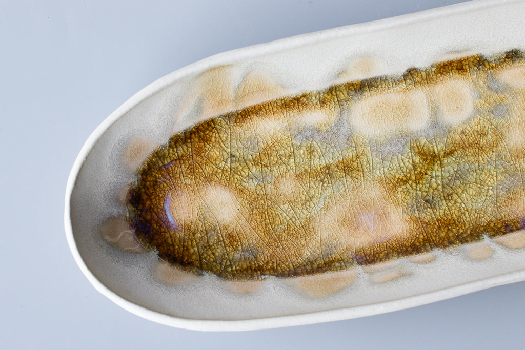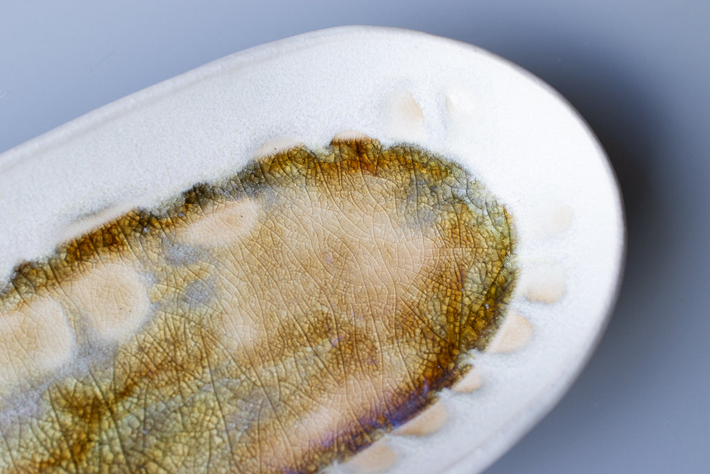 ユニークな楕円皿。反り上がったリムを流れる釉薬の淡い色味と見込みに溜まった濃く重なり感のある結晶が好対照で美しいです。少々の汁気も受け止めてくれるので何かと便利にお使い頂けそう。