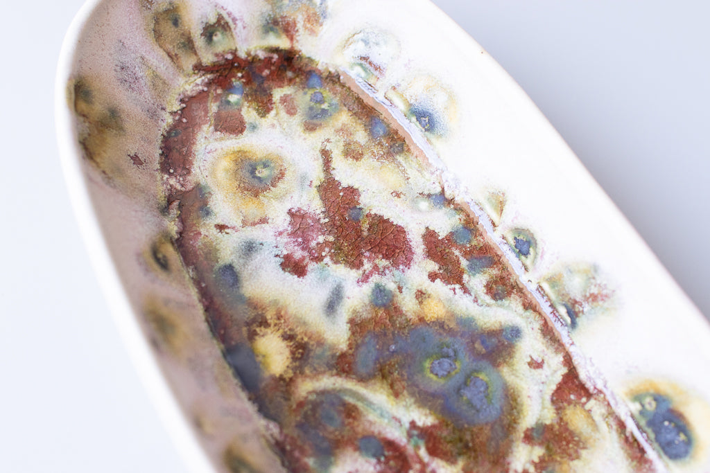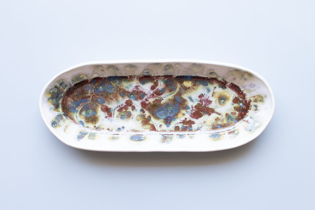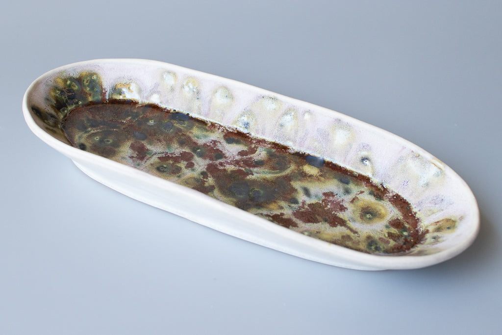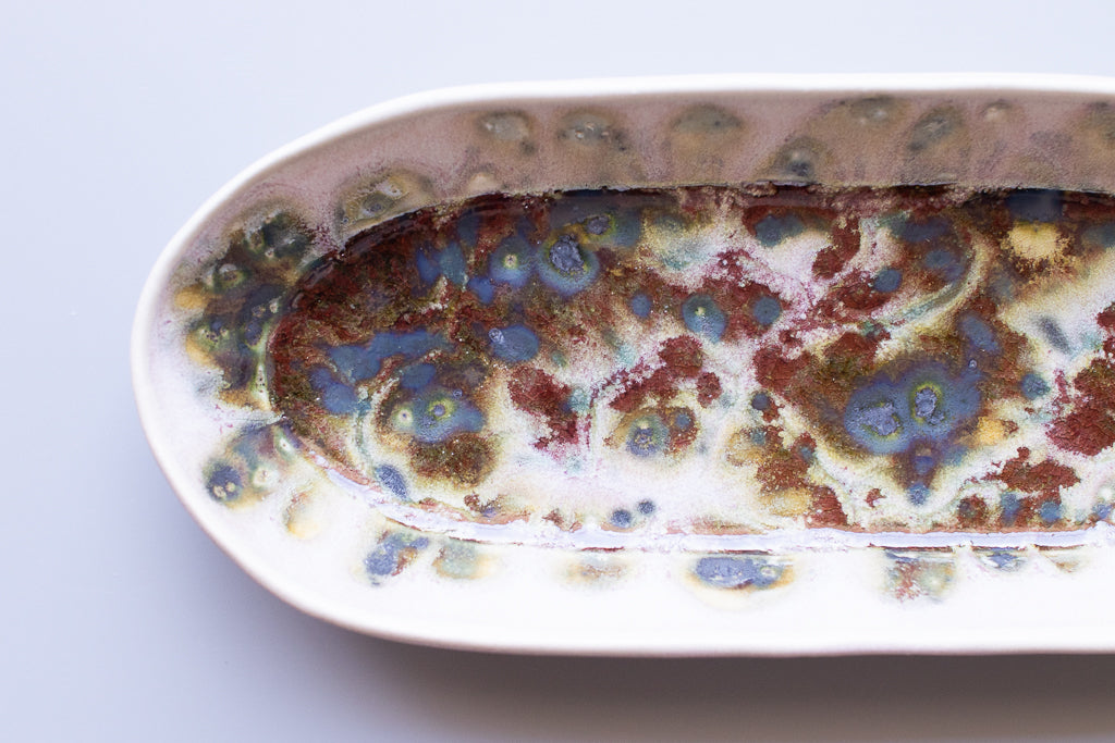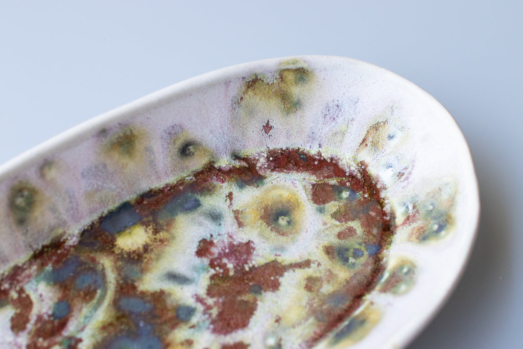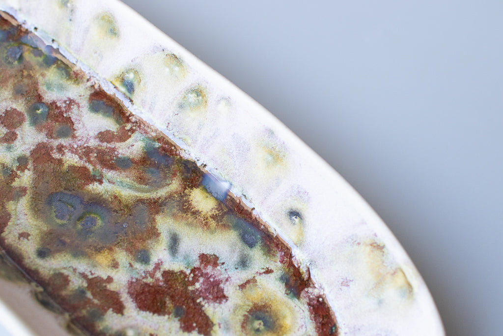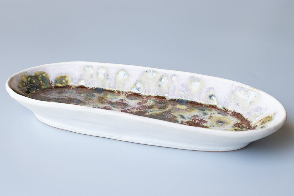 ユニークな楕円皿。反り上がったリムを流れる釉薬の淡い色味と見込みに溜まった濃く重なり感のある結晶が好対照で美しいです。少々の汁気も受け止めてくれるので何かと便利にお使い頂けそう。