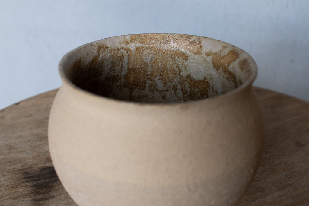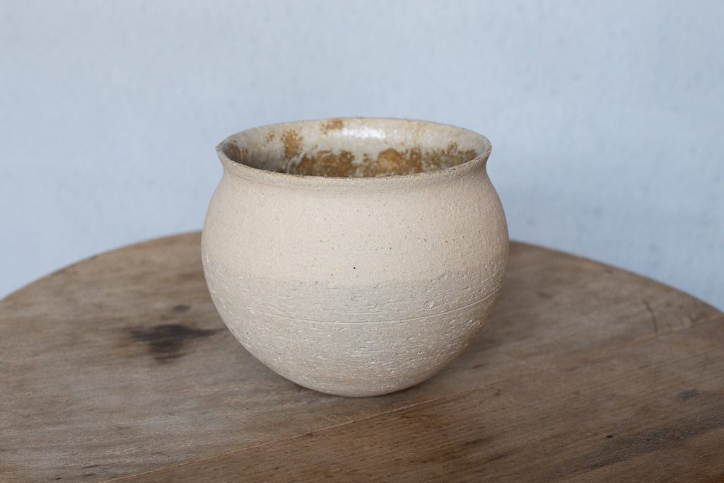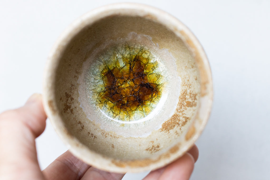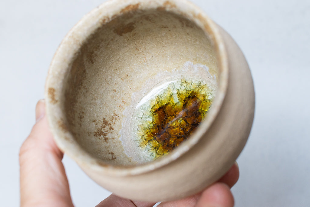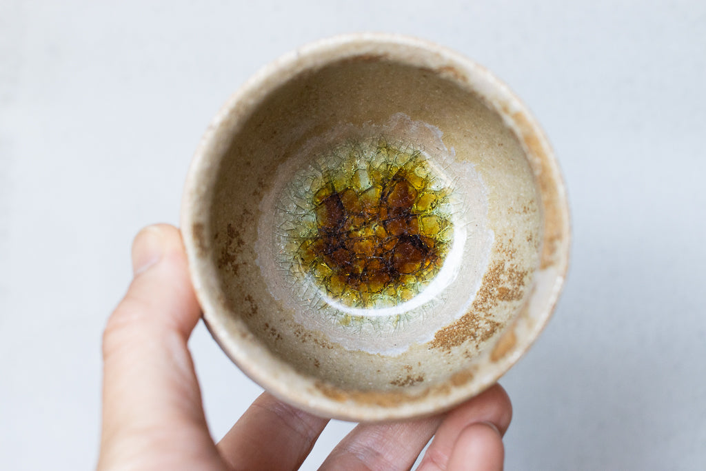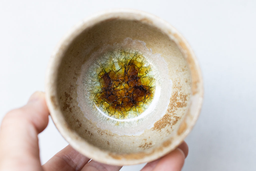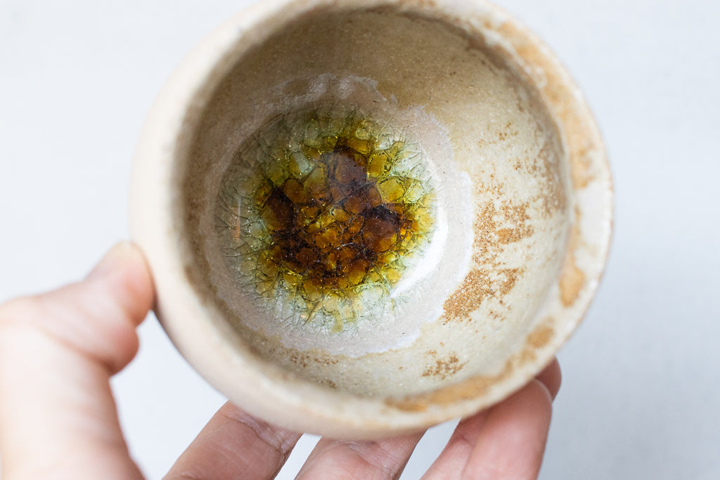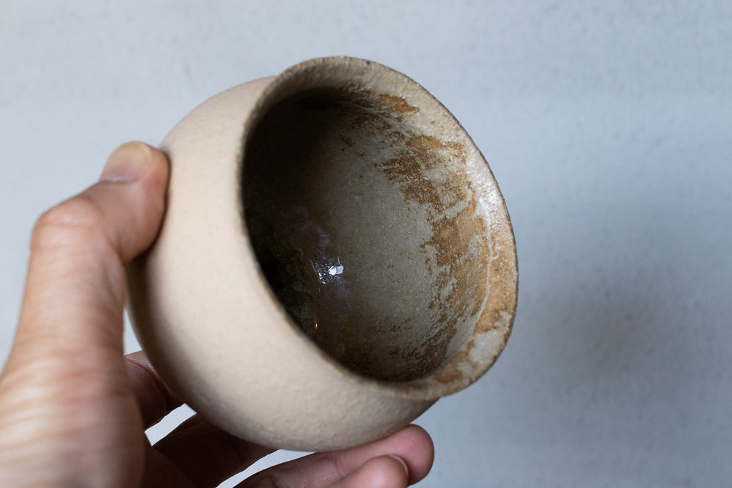 京都のタニガワユメさんのつぼカップ。代表作のつぼ型のフリーカップです。ごく薄く仕上げられた反った縁はコーヒーなど香りを楽しむドリンクに非常に相性が良いです。ドリンクの他、デザートカップとしてお使い頂くことも多い汎用性の高い逸品。ガラスを蒔いた見込みのキラキラも個体差があって選ぶ楽しみも。