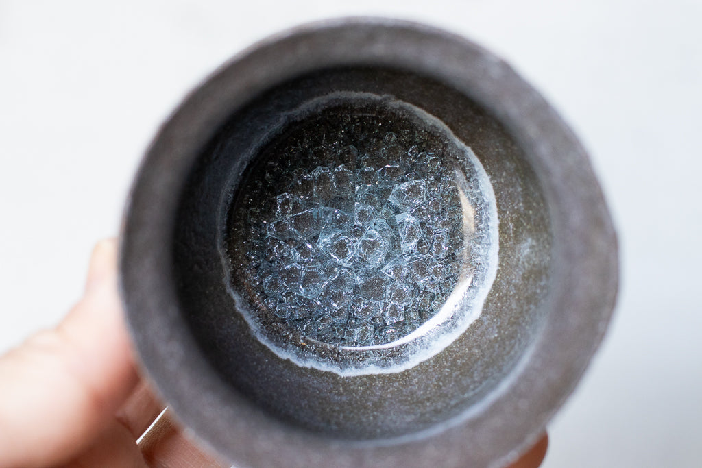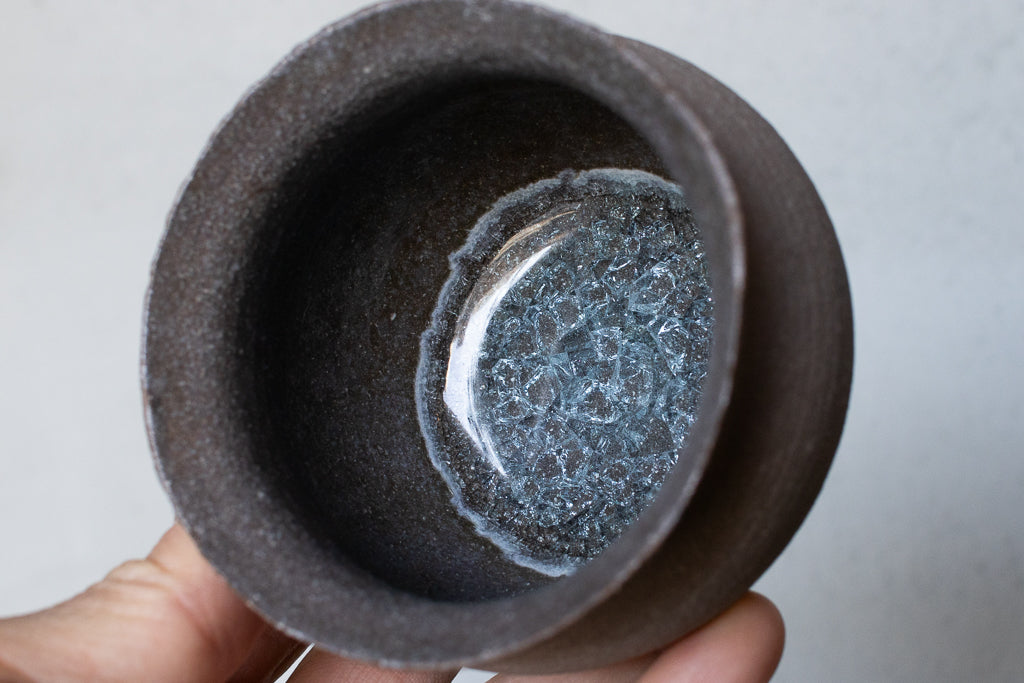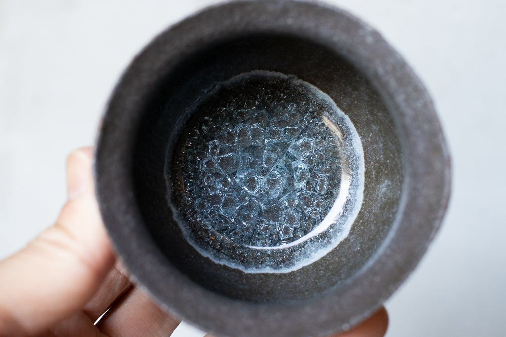 京都のタニガワユメさんのつぼカップ。代表作のつぼ型のフリーカップです。ごく薄く仕上げられた反った縁はコーヒーなど香りを楽しむドリンクに非常に相性が良いです。ドリンクの他、デザートカップとしてお使い頂くことも多い汎用性の高い逸品。ガラスを蒔いた見込みのキラキラも個体差があって選ぶ楽しみも。