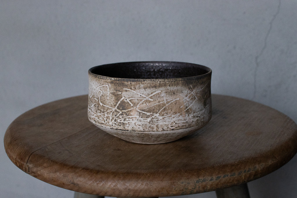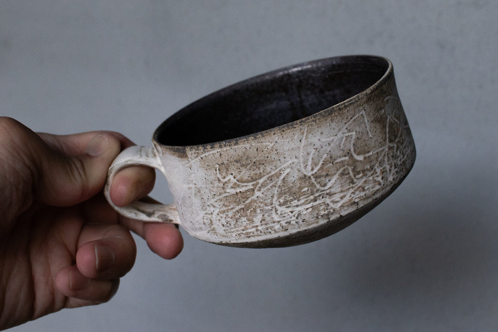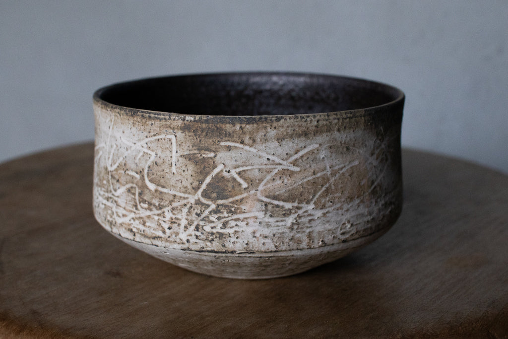 枯色線紋と名付けられた独特の枯れた質感に、フリーハンドで施されたリズミカルな線紋が軽やかに踊ります。線紋は針のような陶芸道具で引っかいて描いた後にベースとは異なる泥を埋めた一種の象嵌のような技法で表現されています。完全に埋まりきってはおらず、カサカサして凸凹感のある手触りがとても楽しく、撫でさすりたくなる作品です。表面は泥化粧+焼締めの仕上げですが、内側はダークでメタリックな釉薬が流してあり染み込みもなく日常的に便利にお使い頂けます。内外の色のコントラストも素敵です。