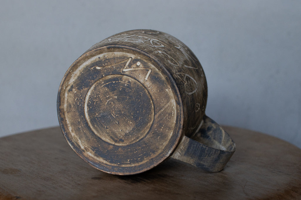 枯色線紋と名付けられた独特の枯れた質感に、フリーハンドで施されたリズミカルな線紋が軽やかに踊ります。線紋は針のような陶芸道具で引っかいて描いた後にベースとは異なる泥を埋めた一種の象嵌のような技法で表現されています。完全に埋まりきってはおらず、カサカサして凸凹感のある手触りがとても楽しく、撫でさすりたくなる作品です。表面は泥化粧+焼締めの仕上げですが、内側はダークでメタリックな釉薬が流してあり染み込みもなく日常的に便利にお使い頂けます。内外の色のコントラストも素敵です。