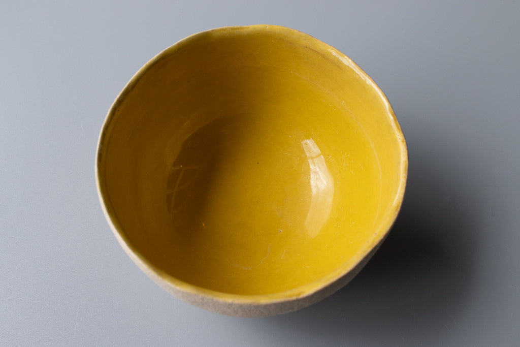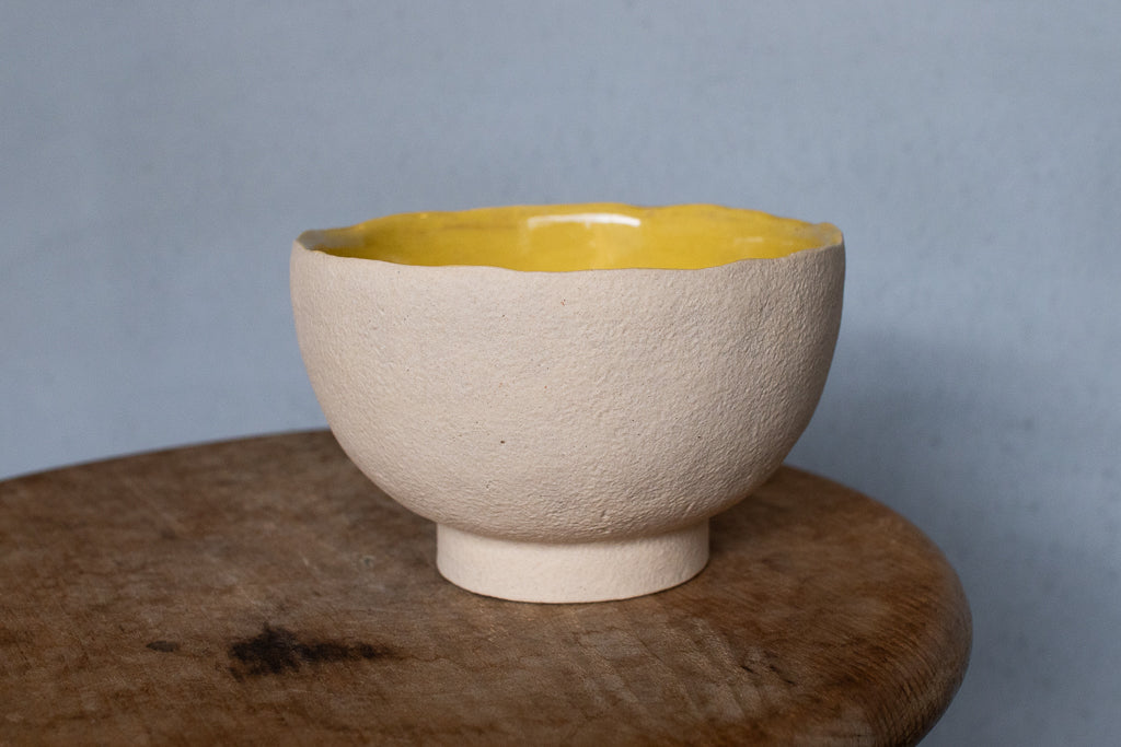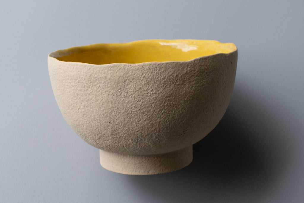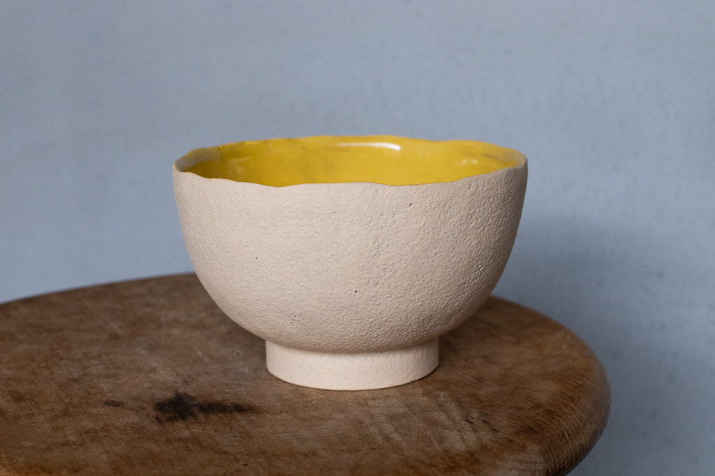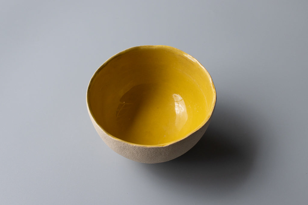 兵庫県の工房で作陶する井上智映子さんの作品。こちらは定番のSandyシリーズで、内側がマスタードイエローのタイプ。名前の通り、カサっとした質感のサンドベージュ色に内側のイエローが効いています。縁がやや歪に仕上げられているので、真横から見たときにイエローがちらちらと覗いてとてもキュートです。しっかりした高台がついているので小丼として、また熱い汁物にもお使い頂けそうです。
