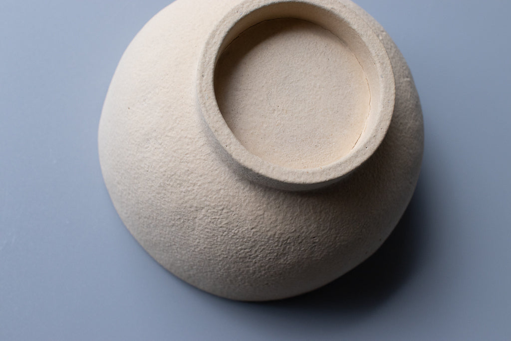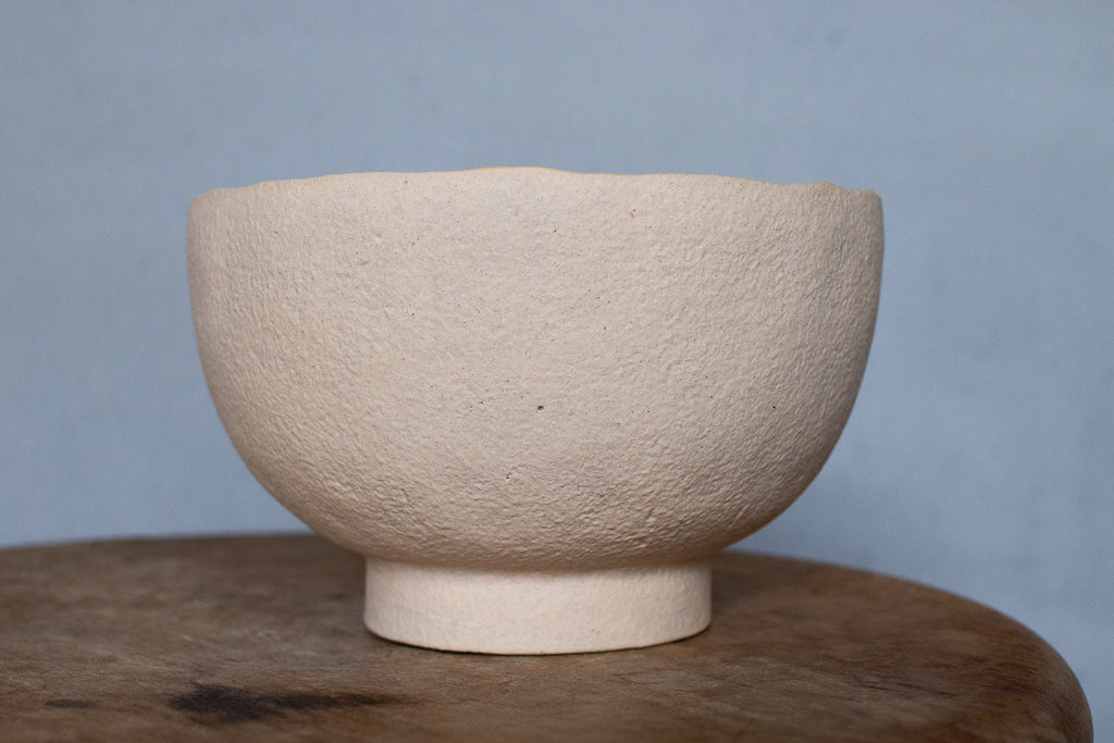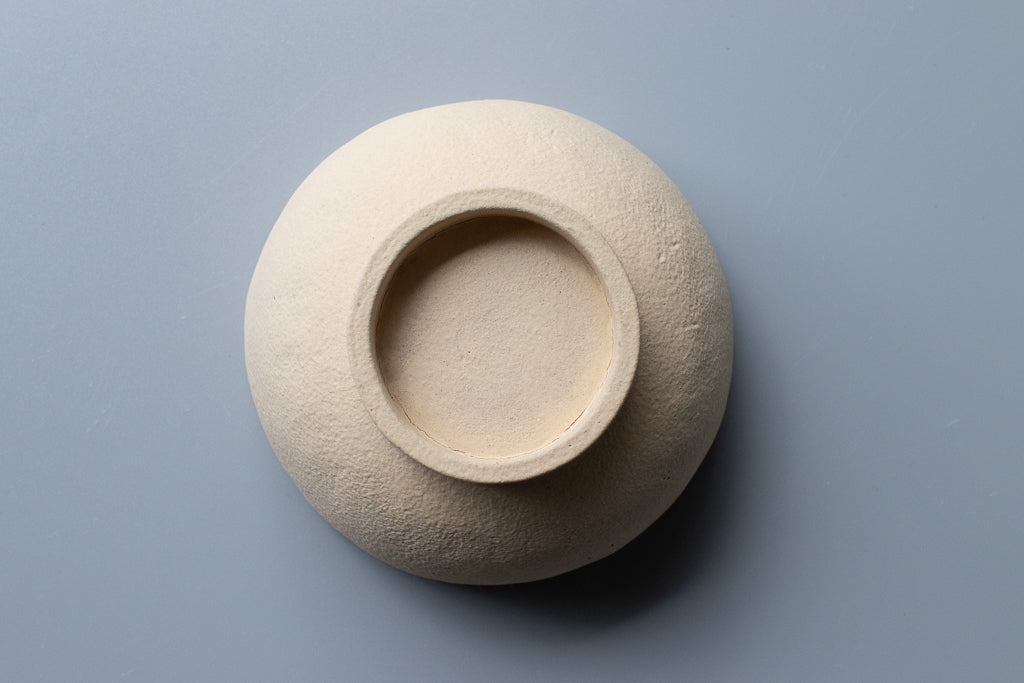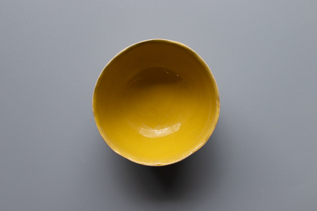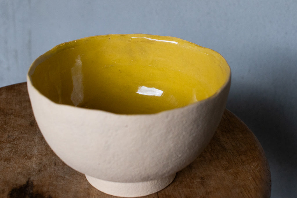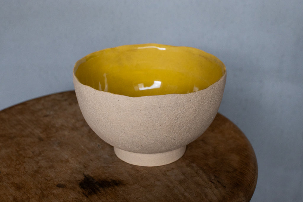 兵庫県の工房で作陶する井上智映子さんの作品。こちらは定番のSandyシリーズで、内側がマスタードイエローのタイプ。名前の通り、カサっとした質感のサンドベージュ色に内側のイエローが効いています。縁がやや歪に仕上げられているので、真横から見たときにイエローがちらちらと覗いてとてもキュートです。しっかりした高台がついているので小丼として、また熱い汁物にもお使い頂けそうです。