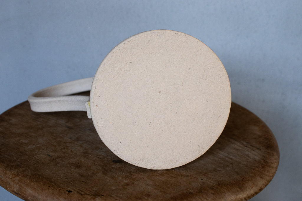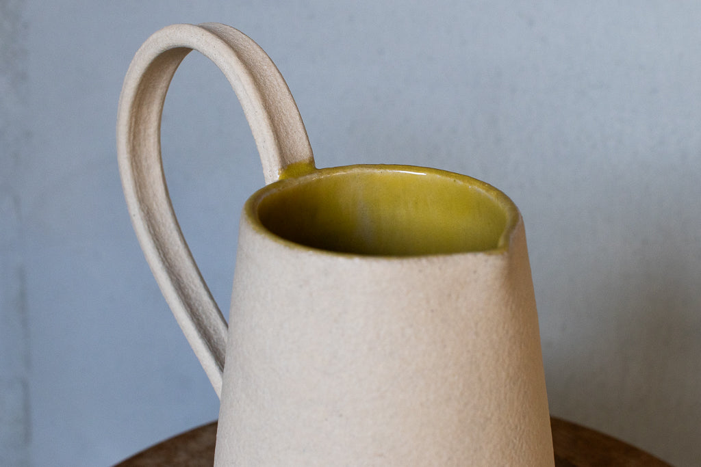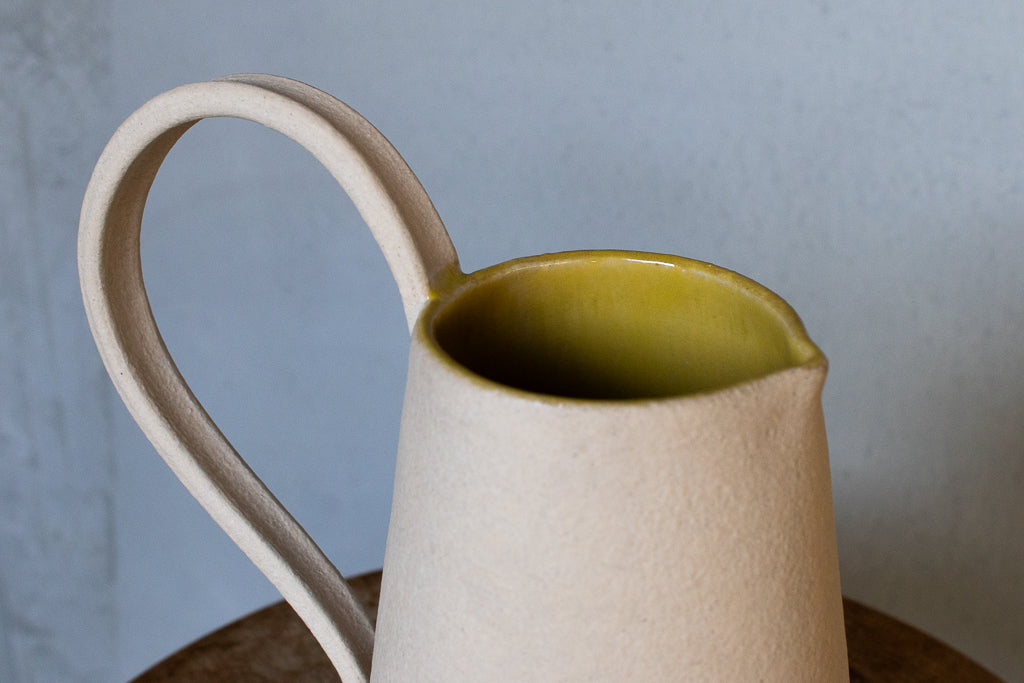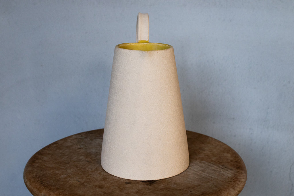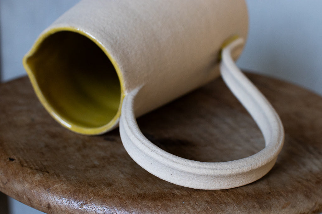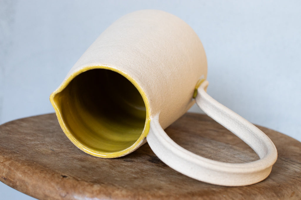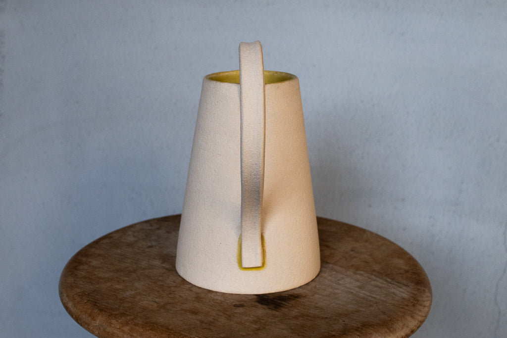 兵庫県の工房で作陶する井上智映子さんの作品。こちらは定番のSandyシリーズの内側が黄色のタイプ。名前の通り、カサっとした質感のサンドベージュ色に差し色のイエローが効いています。ハンドルの接着部分にも黄色が見えるのがグッとくるポイント。柔らかい色味はインテリアにも良く馴染んでくれそう。白や赤のお花が良く映えそうです。