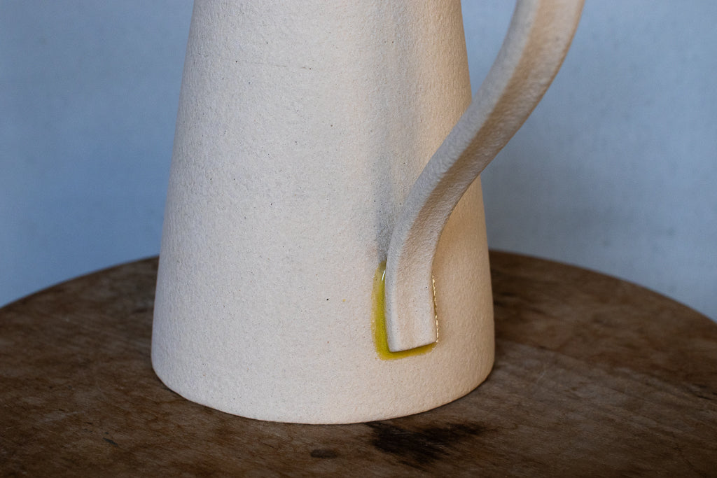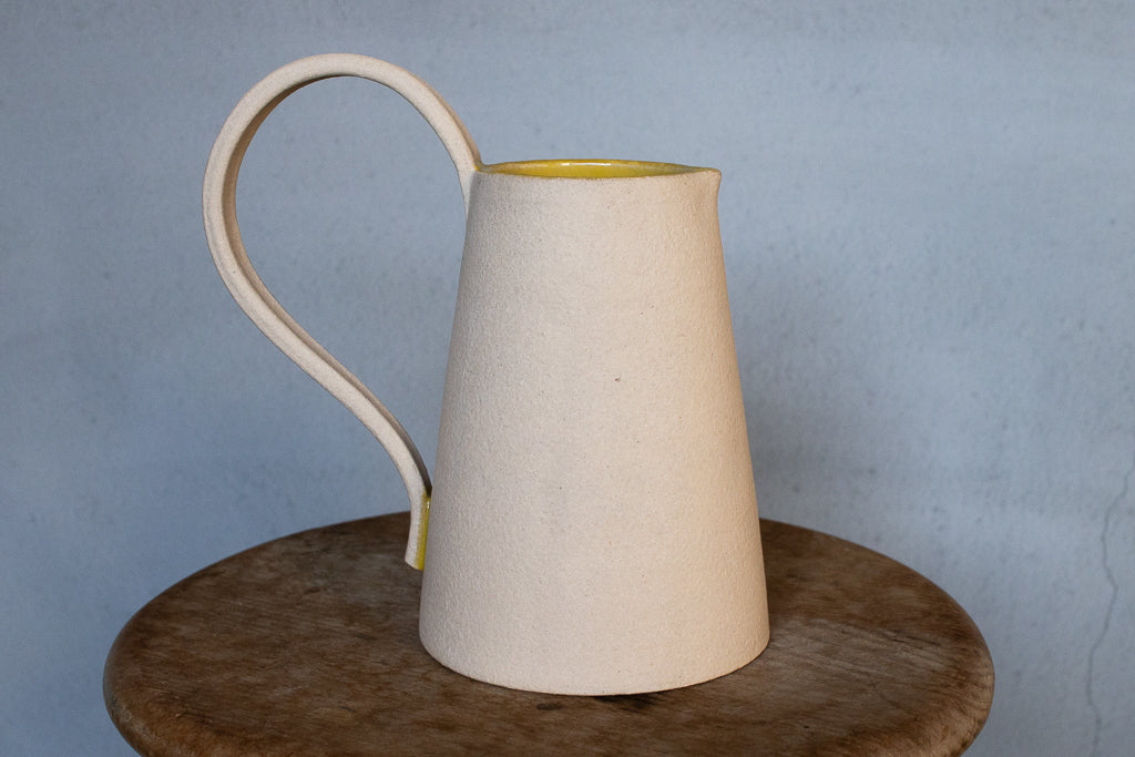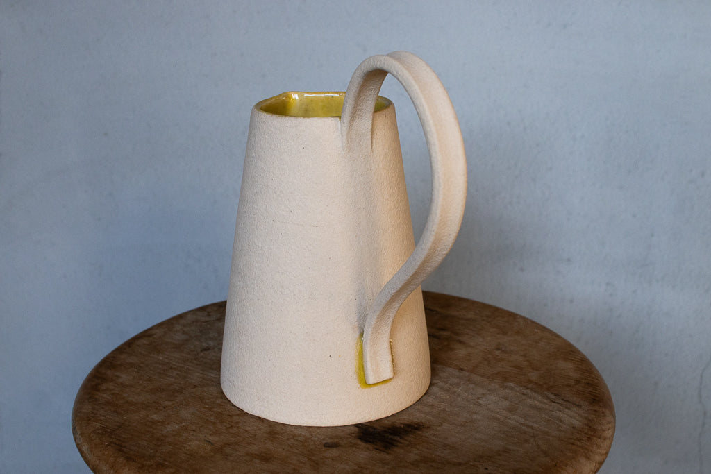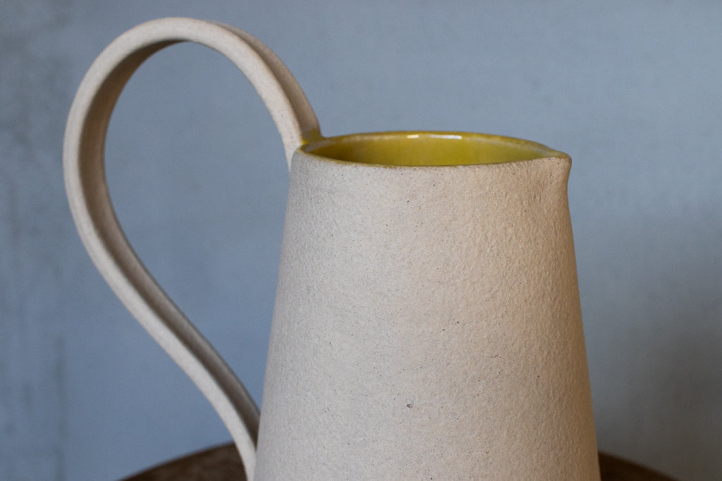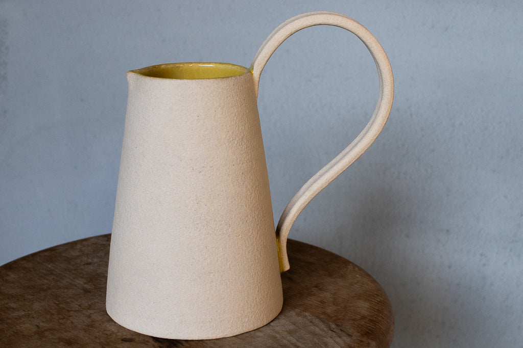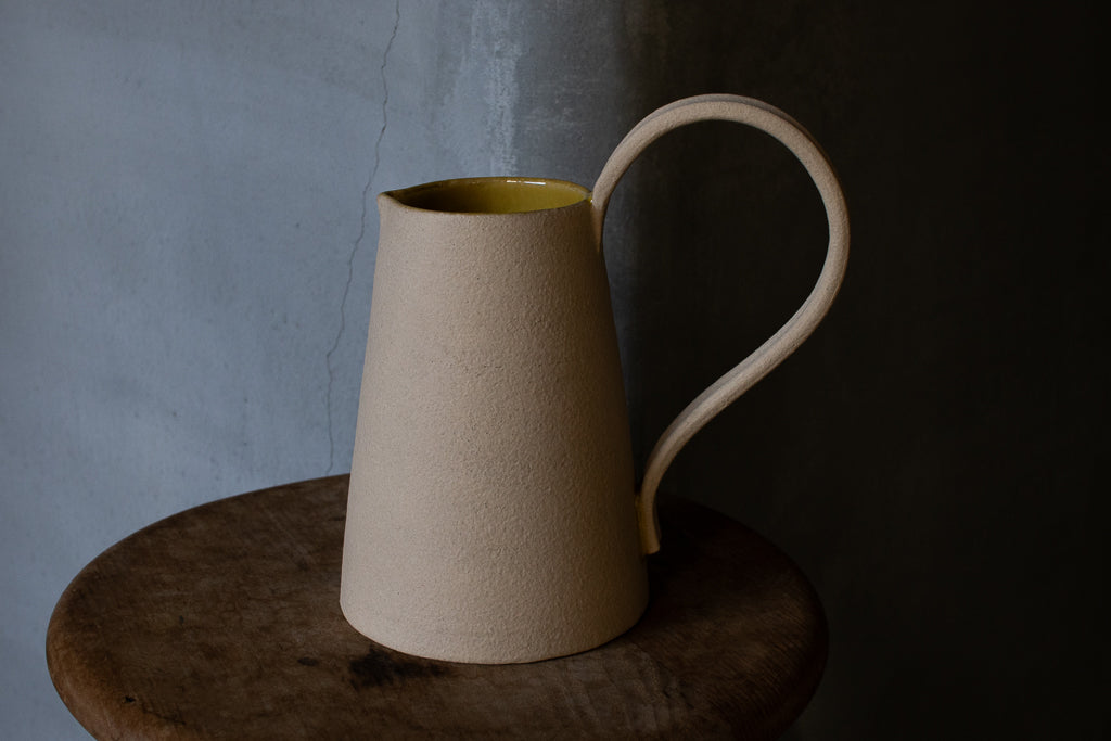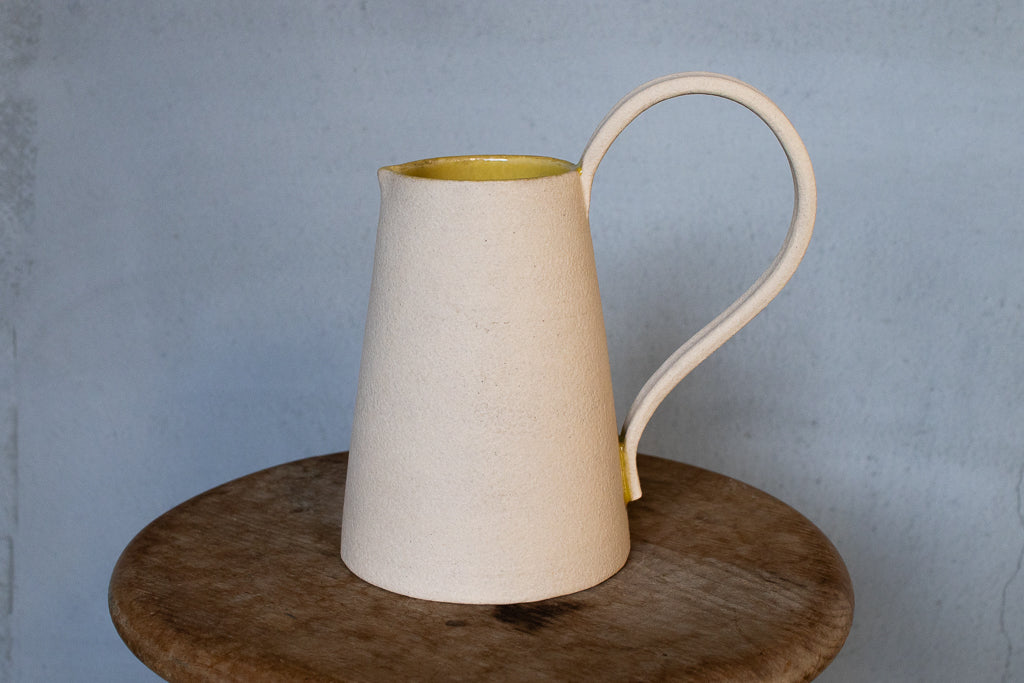 兵庫県の工房で作陶する井上智映子さんの作品。こちらは定番のSandyシリーズの内側が黄色のタイプ。名前の通り、カサっとした質感のサンドベージュ色に差し色のイエローが効いています。ハンドルの接着部分にも黄色が見えるのがグッとくるポイント。柔らかい色味はインテリアにも良く馴染んでくれそう。白や赤のお花が良く映えそうです。