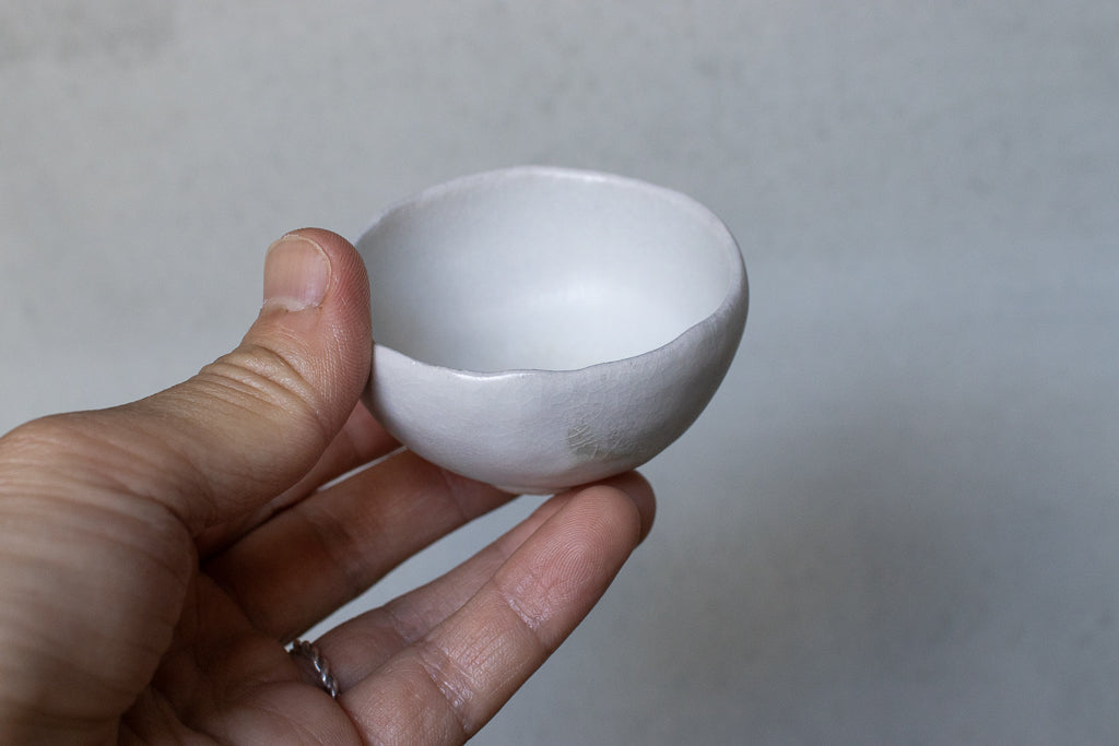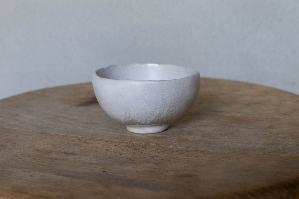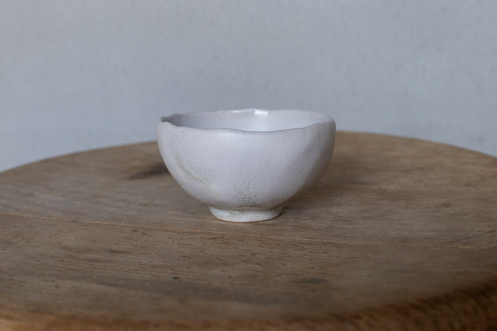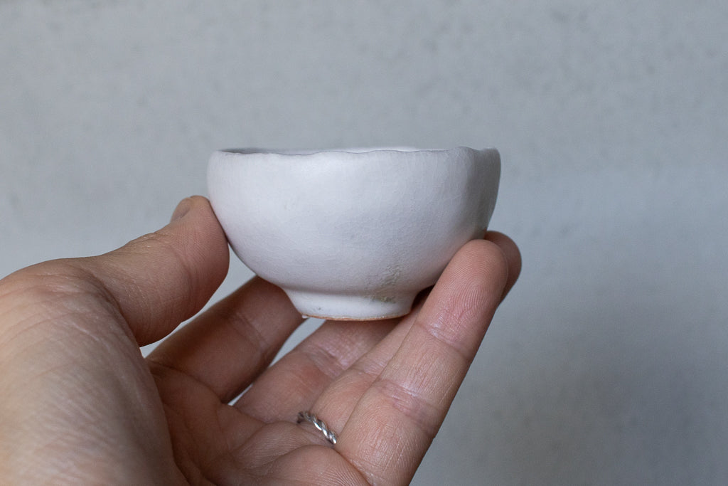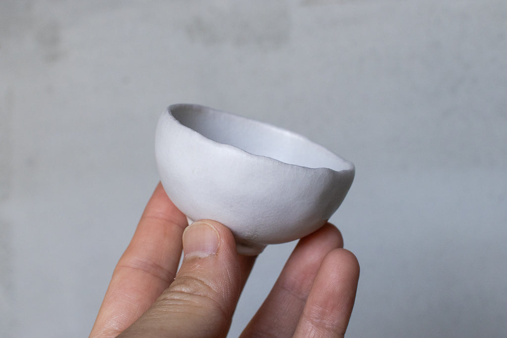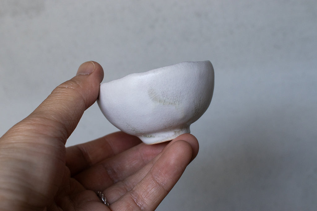 井上智映子氏の茶杯/ぐいのみです。oboroと名付けられた透明釉と白釉を重ねた美しい表情のひとしな。少しいびつに仕上げられた口縁が雰囲気良しです。揃いの茶海/片口と合わせてのご使用もおすすめです。