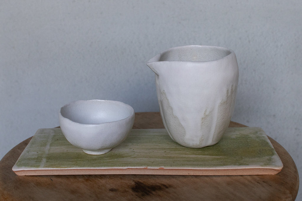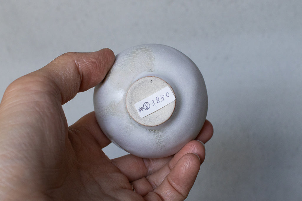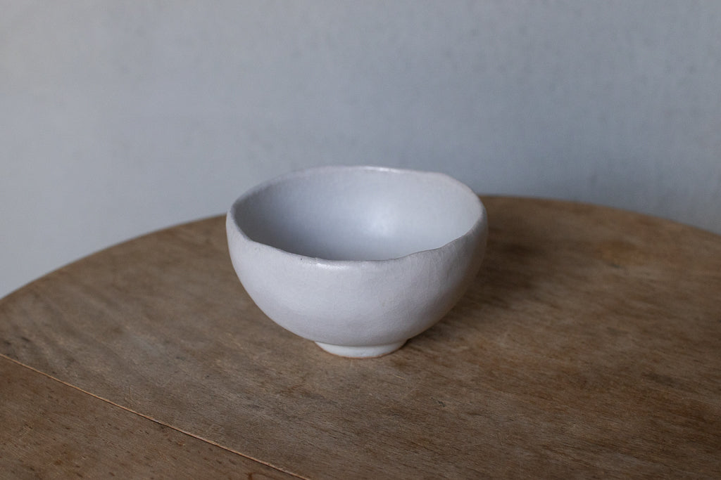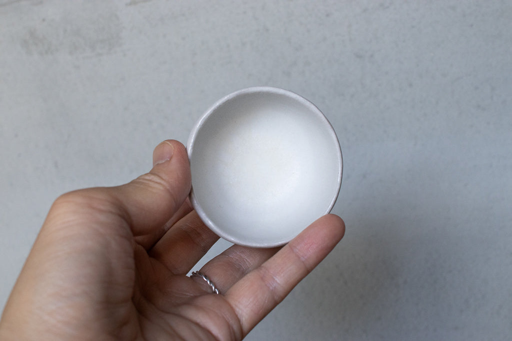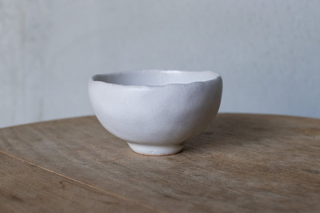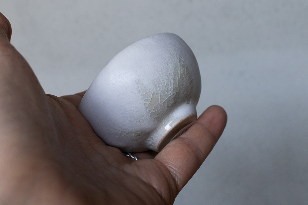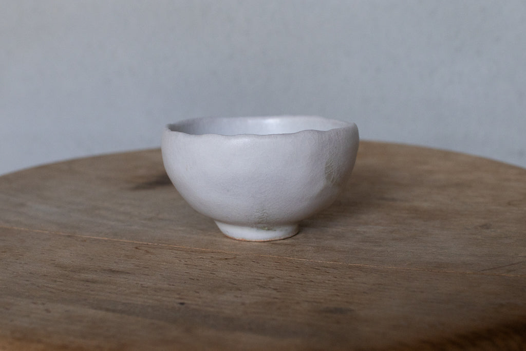 井上智映子氏の茶杯/ぐいのみです。oboroと名付けられた透明釉と白釉を重ねた美しい表情のひとしな。少しいびつに仕上げられた口縁が雰囲気良しです。揃いの茶海/片口と合わせてのご使用もおすすめです。