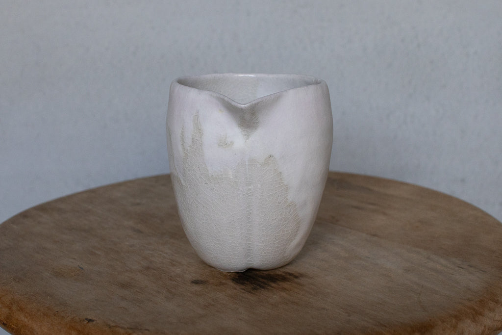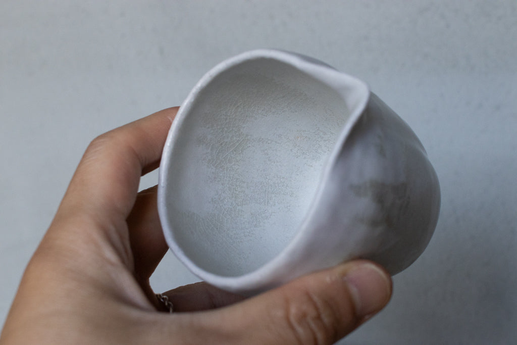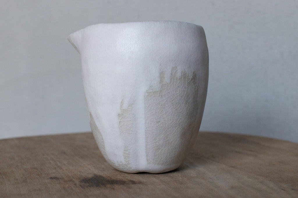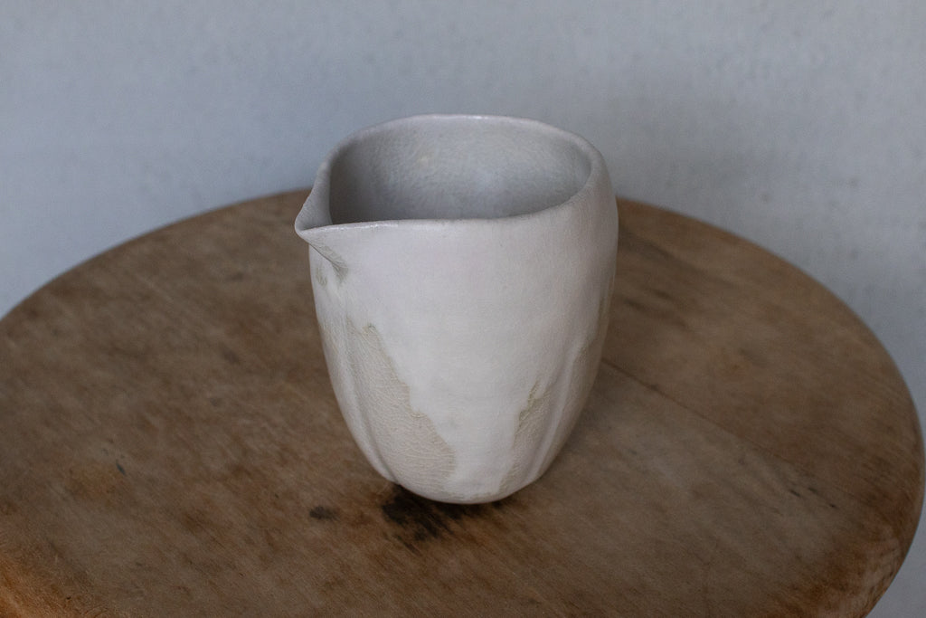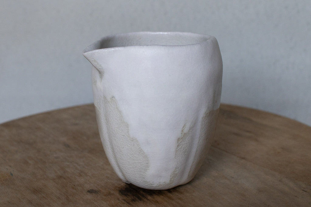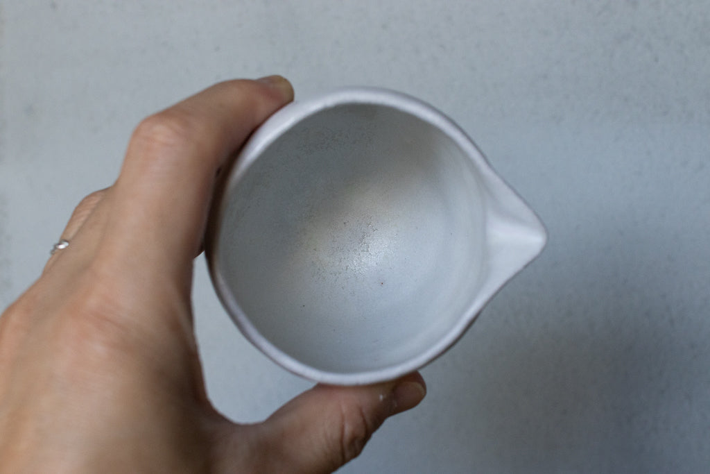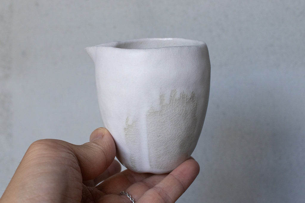 井上智映子氏の茶海です。お茶はもちろん、片口としてお酒用にもお使いいただけそう。oboroと名付けられた透明釉と白釉を重ねた美しい表情のひとしな。柿かピーマンのおしりのような高台のデザインがとてもキュートです。揃いの茶杯/ぐいのみと合わせてのご使用もおすすめです。