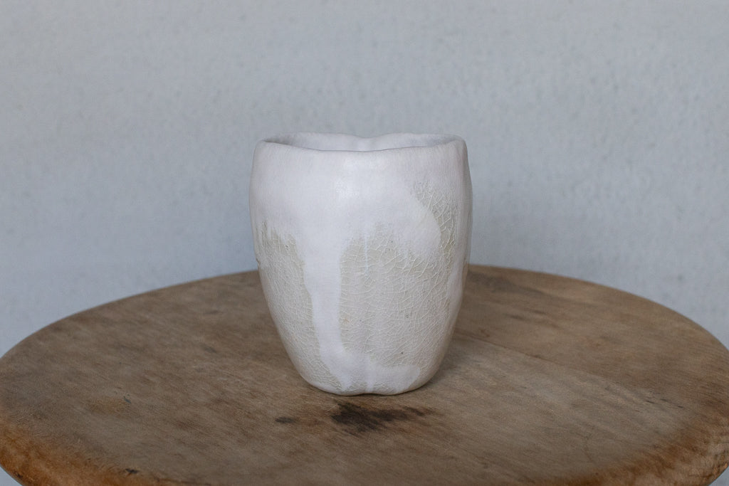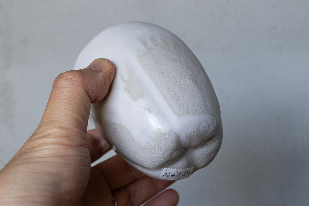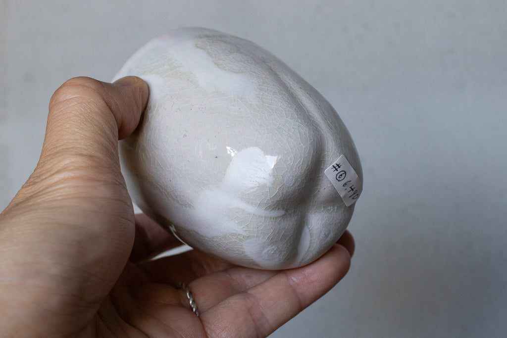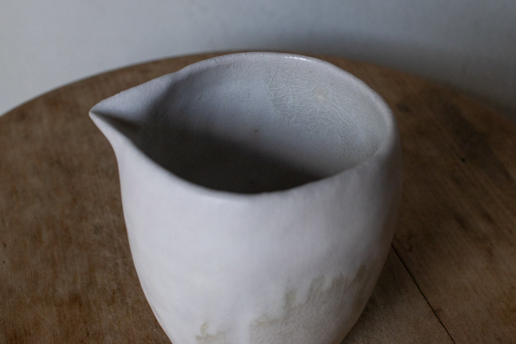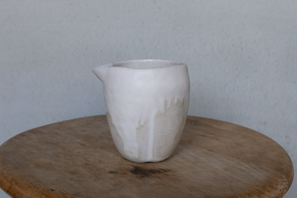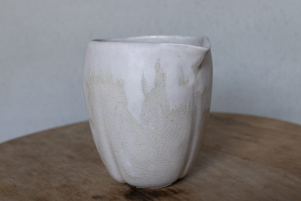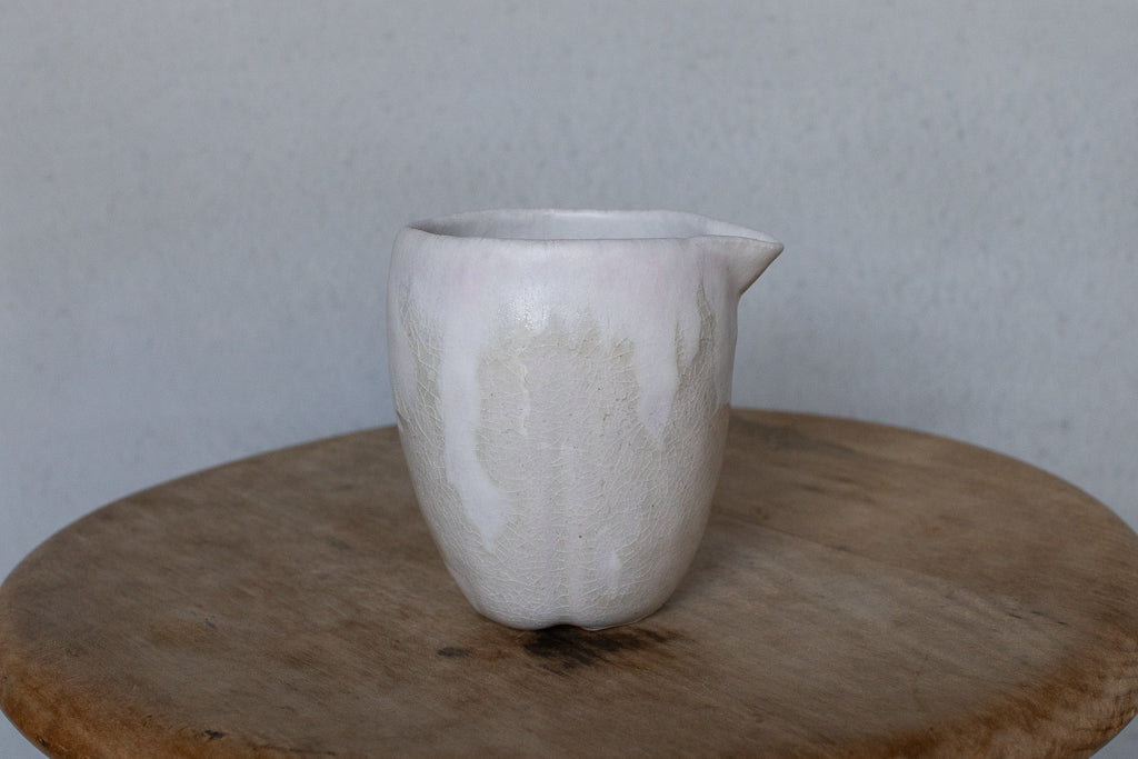 井上智映子氏の茶海です。お茶はもちろん、片口としてお酒用にもお使いいただけそう。oboroと名付けられた透明釉と白釉を重ねた美しい表情のひとしな。柿かピーマンのおしりのような高台のデザインがとてもキュートです。揃いの茶杯/ぐいのみと合わせてのご使用もおすすめです。