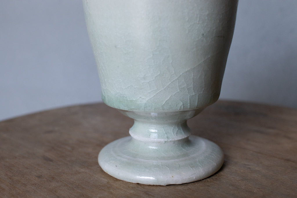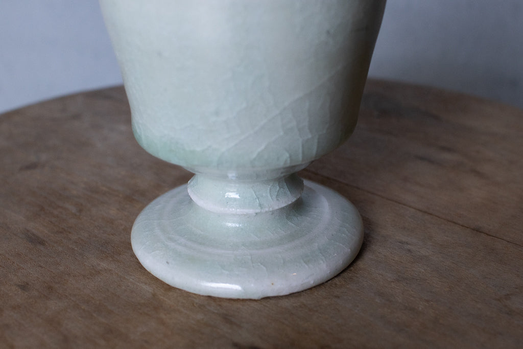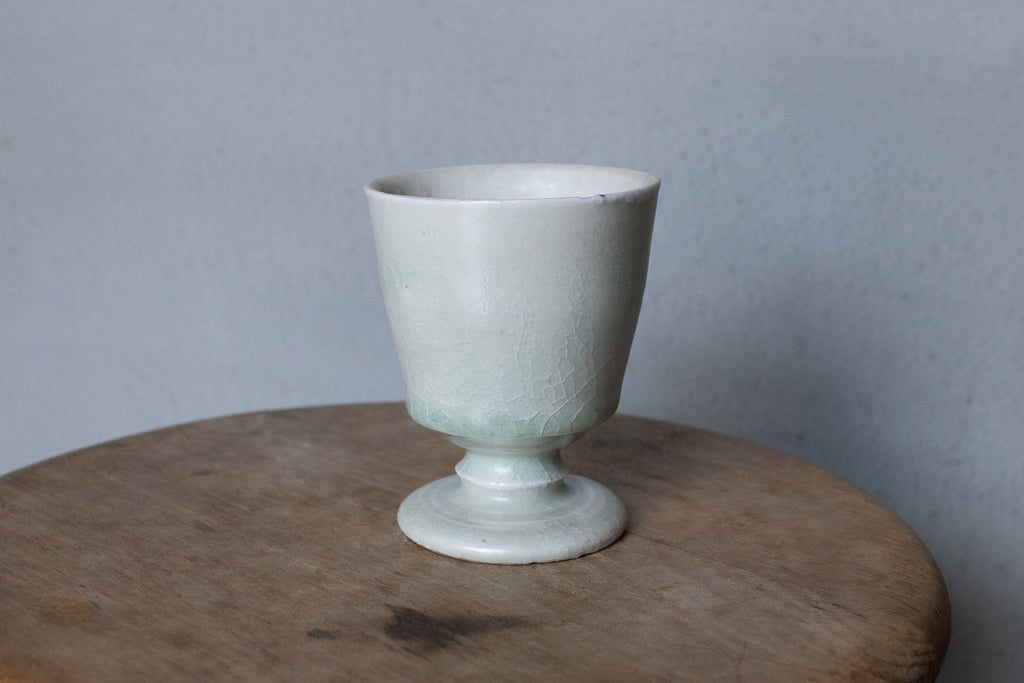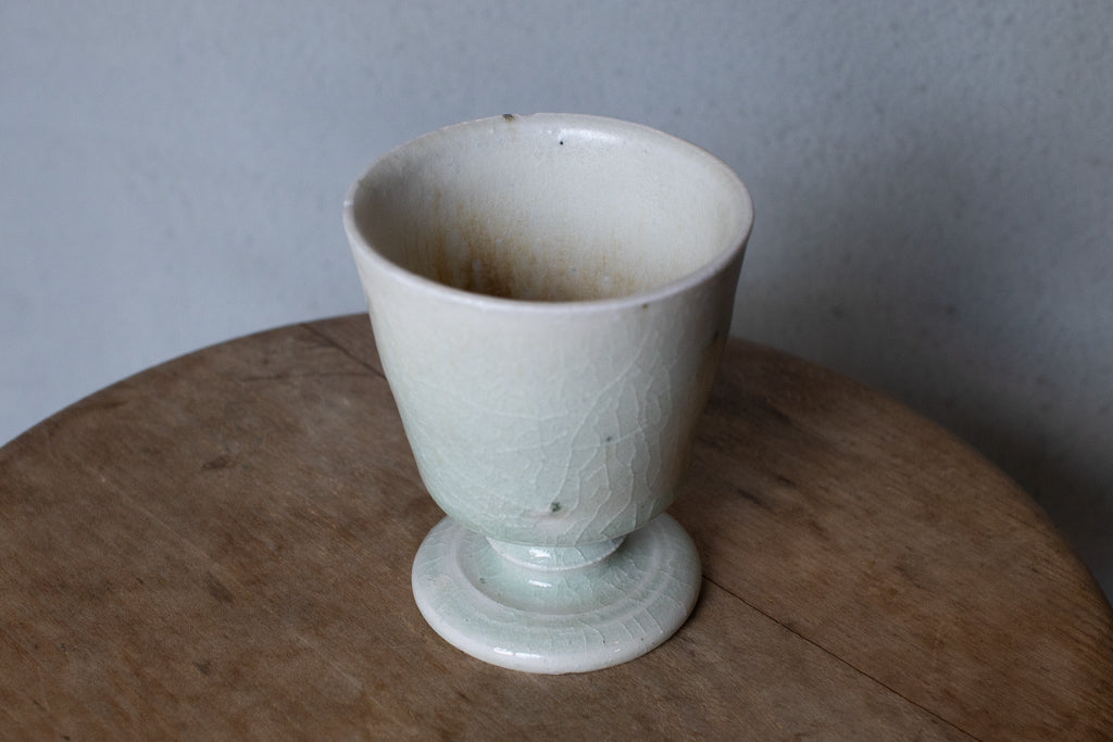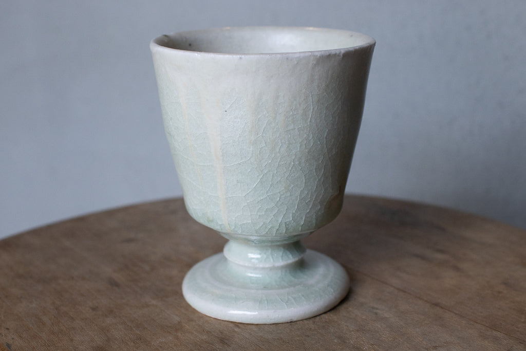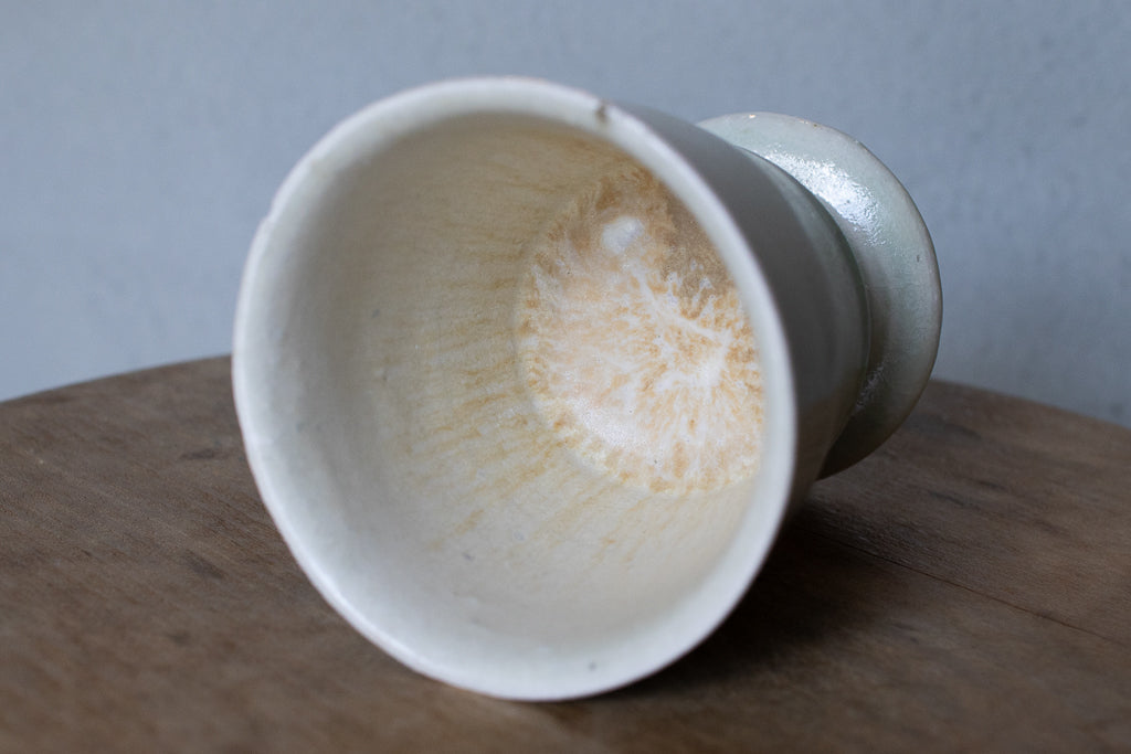 ややこぶりなゴブレット。トノイケさんにしては珍しく(?)削りを入れたやや端正なたたずまい。透明感あるテクスチャも新鮮ですが、重ねがけられた釉薬の流れや見込みにたまった自然灰(樫かな?)のとろみのある結晶などはまさにトノイケさんという感じで素敵です。
