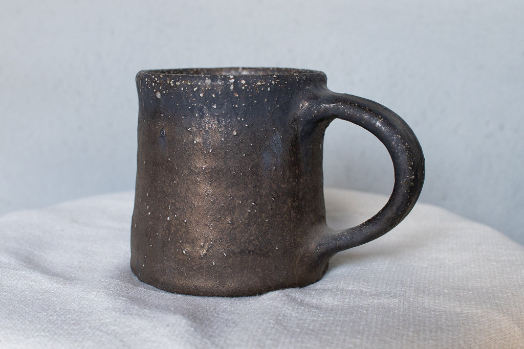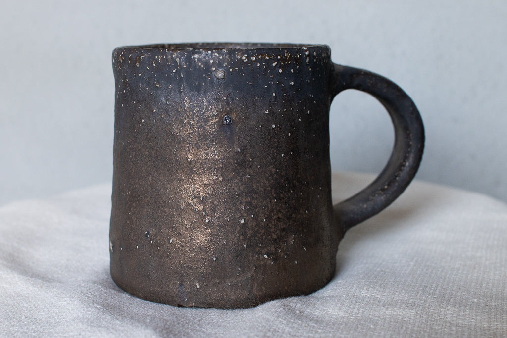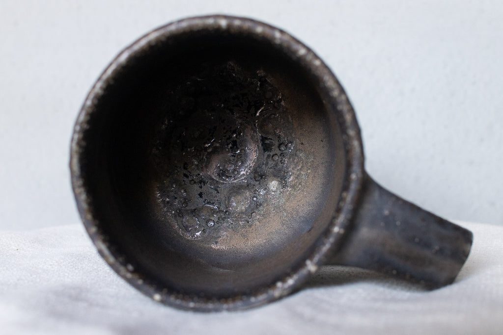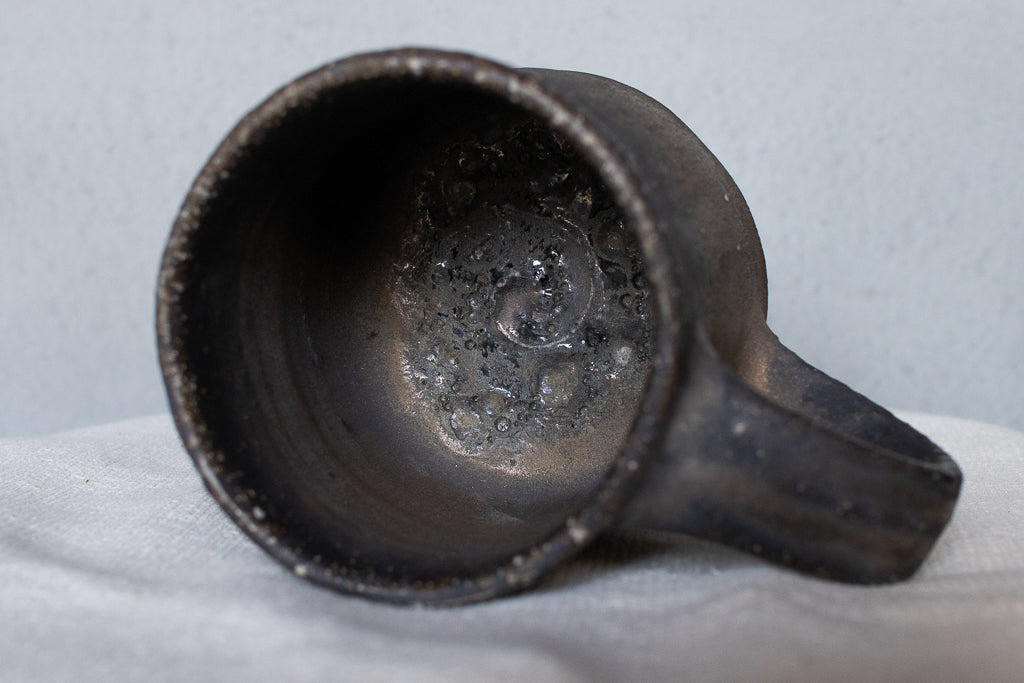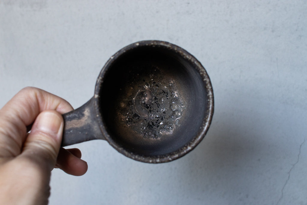 常滑の大原光一氏のマグカップです。定番の釉薬のうち、こちらは「黒釉」と名付けられたシリーズの逸品。個体差も激しい釉薬ですが、こちらの作品は全体としてややマットな印象。ところどころ鈍く輝く質感が素敵です。見込みのなんとも言えない表情も素晴らしい。