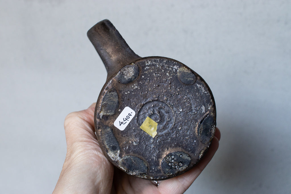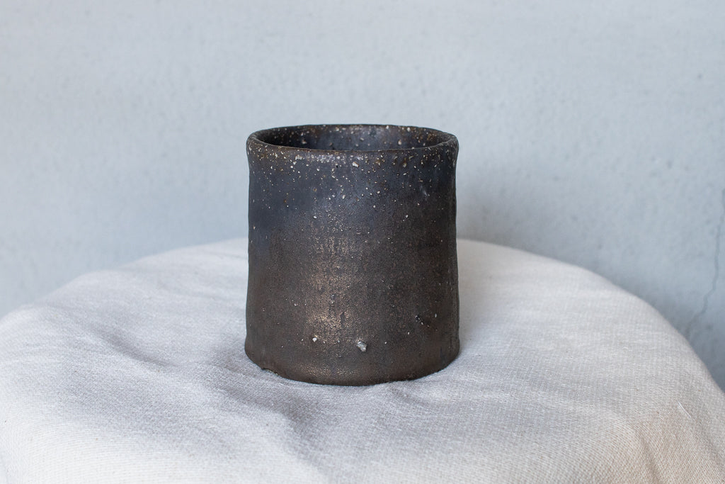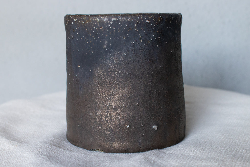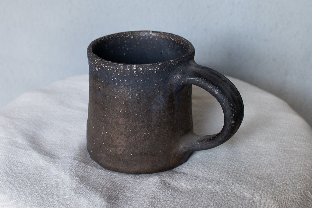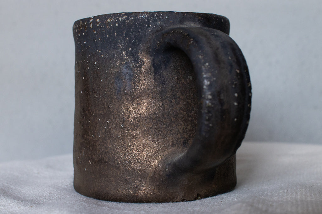 常滑の大原光一氏のマグカップです。定番の釉薬のうち、こちらは「黒釉」と名付けられたシリーズの逸品。個体差も激しい釉薬ですが、こちらの作品は全体としてややマットな印象。ところどころ鈍く輝く質感が素敵です。見込みのなんとも言えない表情も素晴らしい。