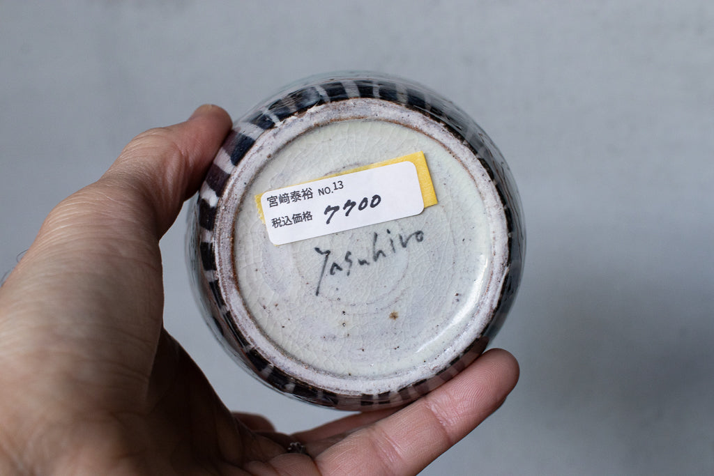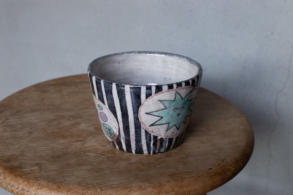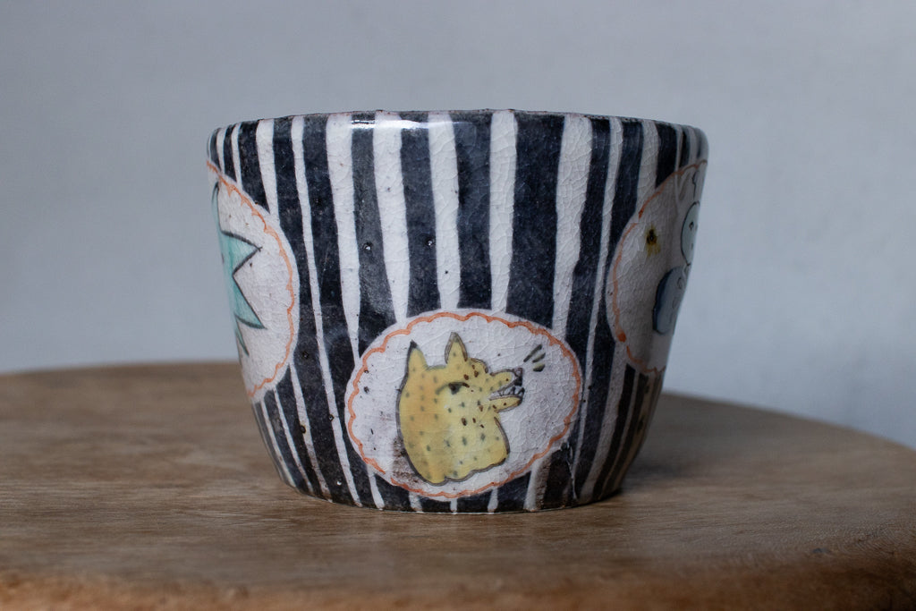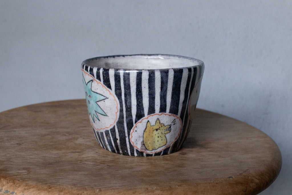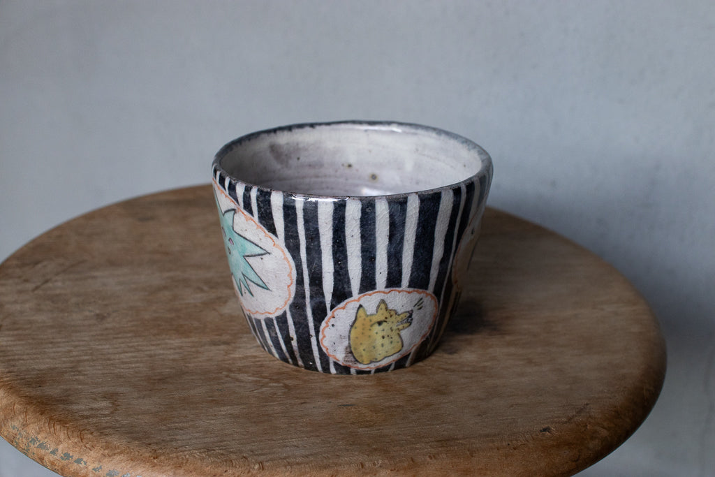 佐賀の宮﨑泰裕さんのそば猪口/フリーカップ/小鉢です。道具とアートピースの狭間の存在とも言えそうなアイテム。ユーモラスで独特な絵柄が素敵でまず目を惹きますが、実物を手にとるとその作りの良さや原料への拘りが見てとれ、気易くはあれど決してチープではないとても良いバランス感があります。ひとつ手元にあるだけで気持ちが上がるような、生き生きとしたパワーを秘めた作品です。ピンときた方、ぜひ。