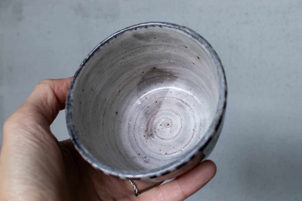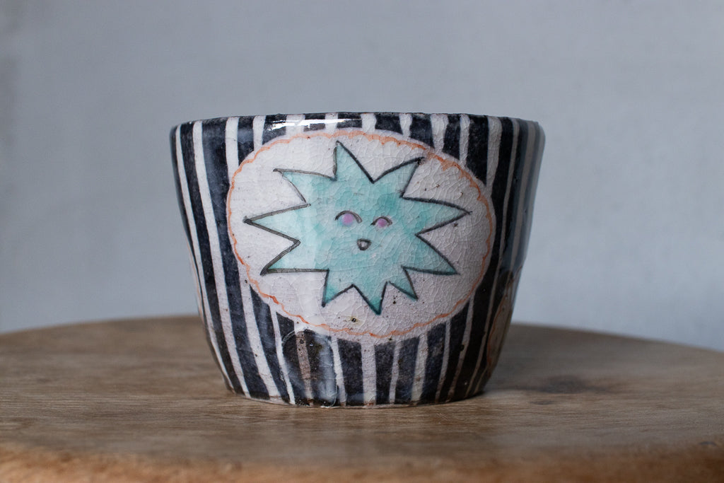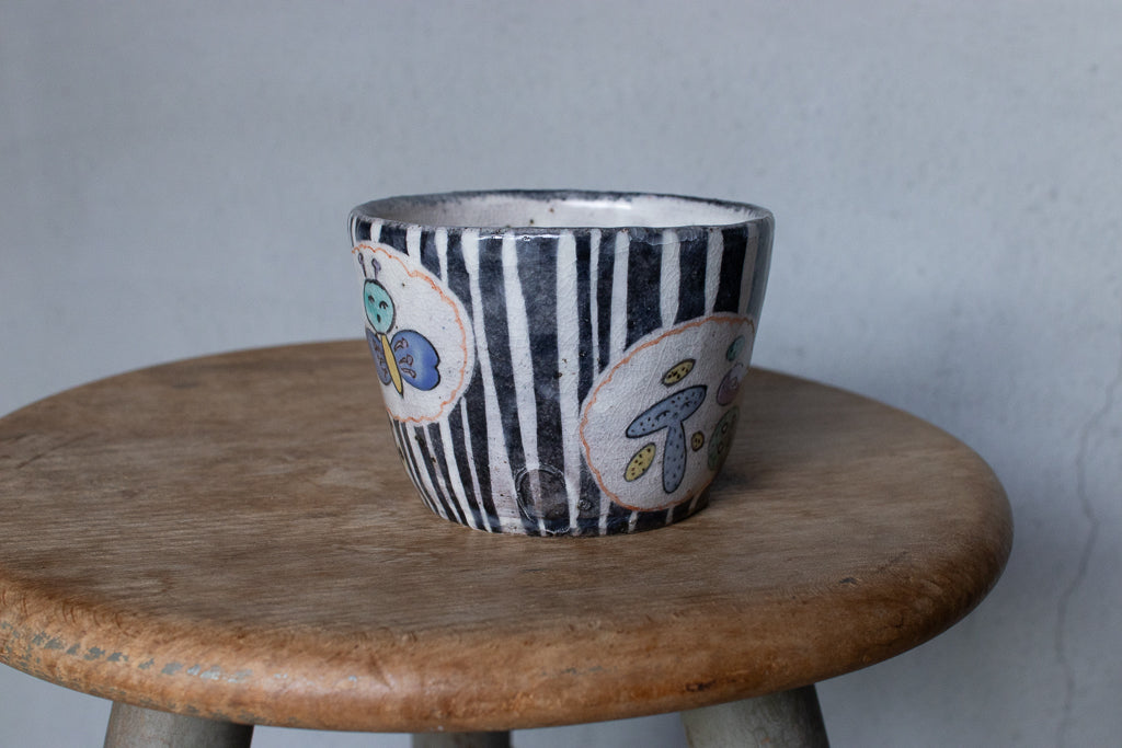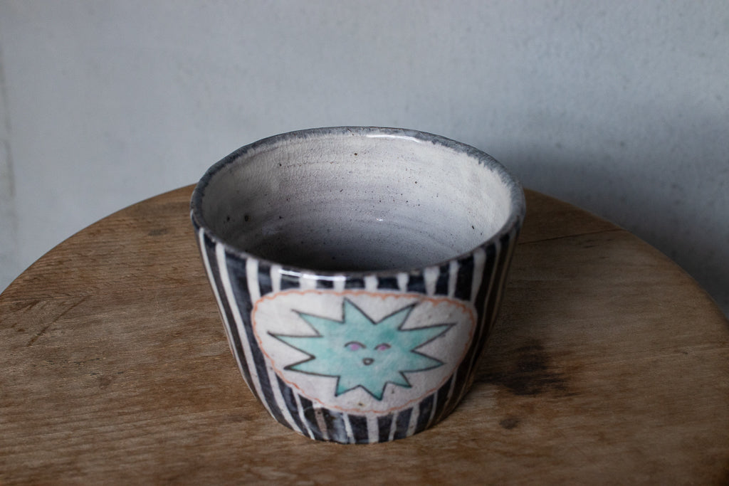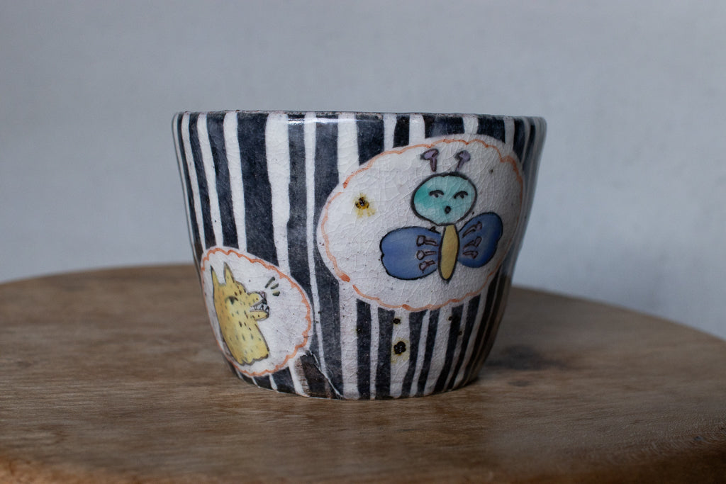 佐賀の宮﨑泰裕さんのそば猪口/フリーカップ/小鉢です。道具とアートピースの狭間の存在とも言えそうなアイテム。ユーモラスで独特な絵柄が素敵でまず目を惹きますが、実物を手にとるとその作りの良さや原料への拘りが見てとれ、気易くはあれど決してチープではないとても良いバランス感があります。ひとつ手元にあるだけで気持ちが上がるような、生き生きとしたパワーを秘めた作品です。ピンときた方、ぜひ。