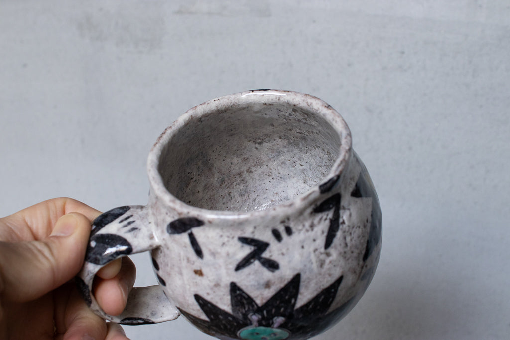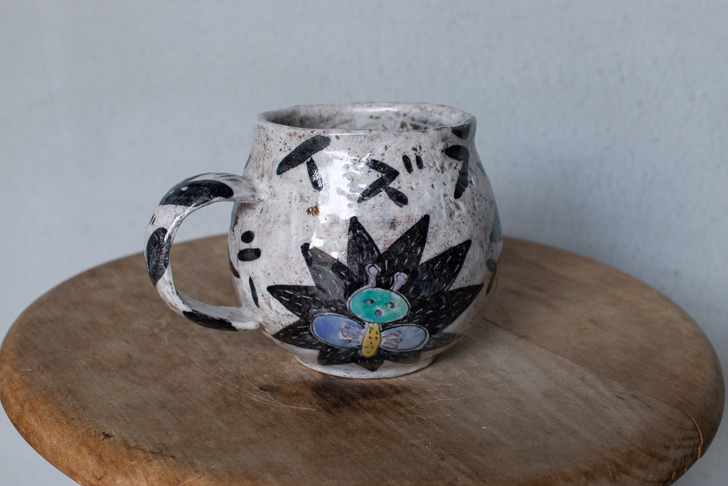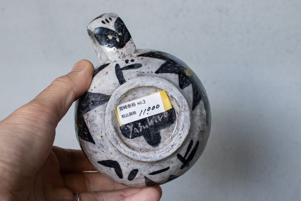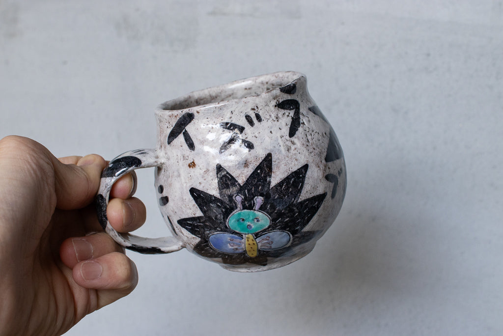 佐賀の宮﨑泰裕さんのマグカップです。道具とアートピースの狭間の存在とも言えそうな作品。ユーモラスで独特な絵柄が素敵でまず目を惹きますが、実物を手にとるとその作りの良さや原料への拘りが見てとれ、気易くはあれど決してチープではないとても良いバランス感があります。ひとつ手元にあるだけで気持ちが上がるような、生き生きとしたパワーを秘めた作品です。ピンときた方、ぜひ。