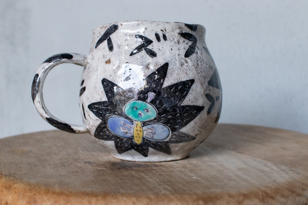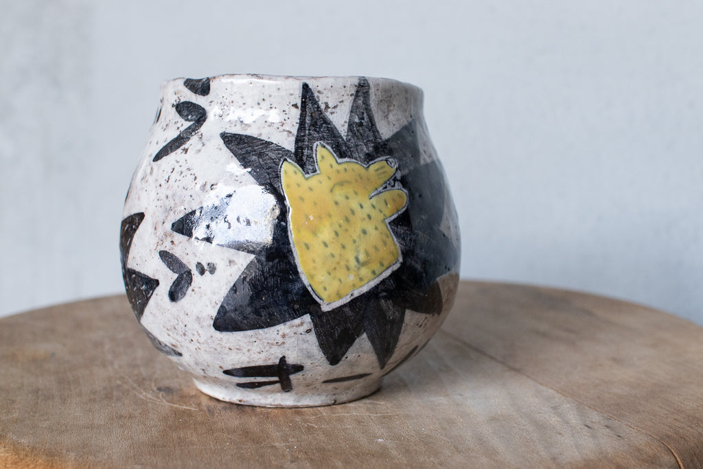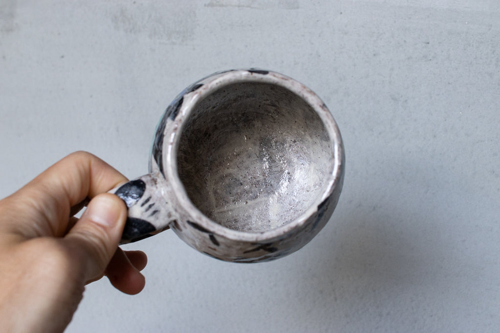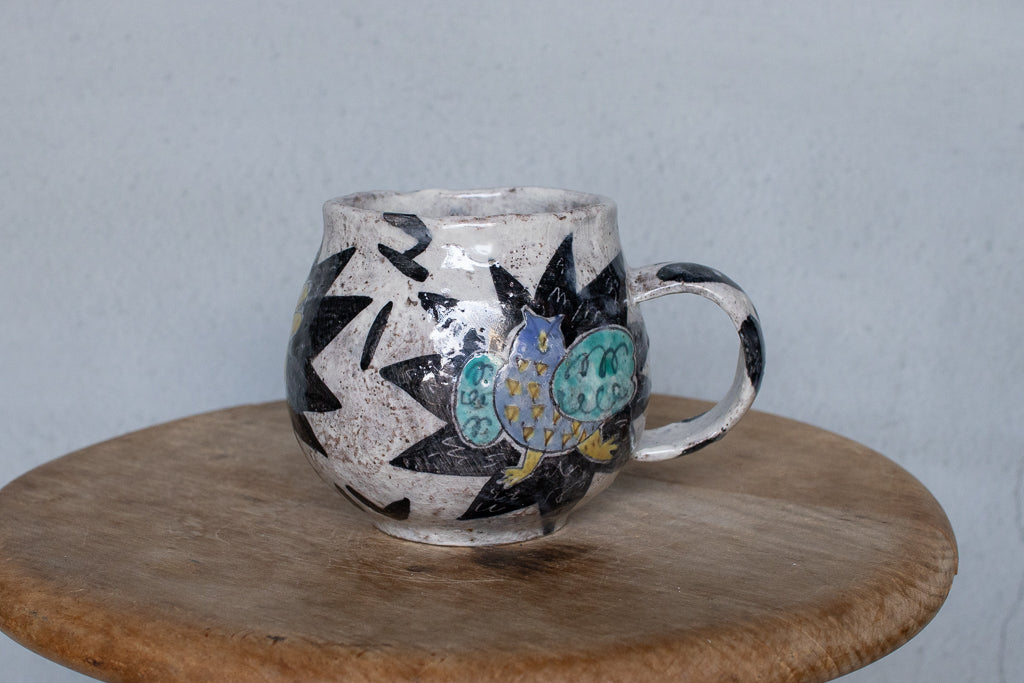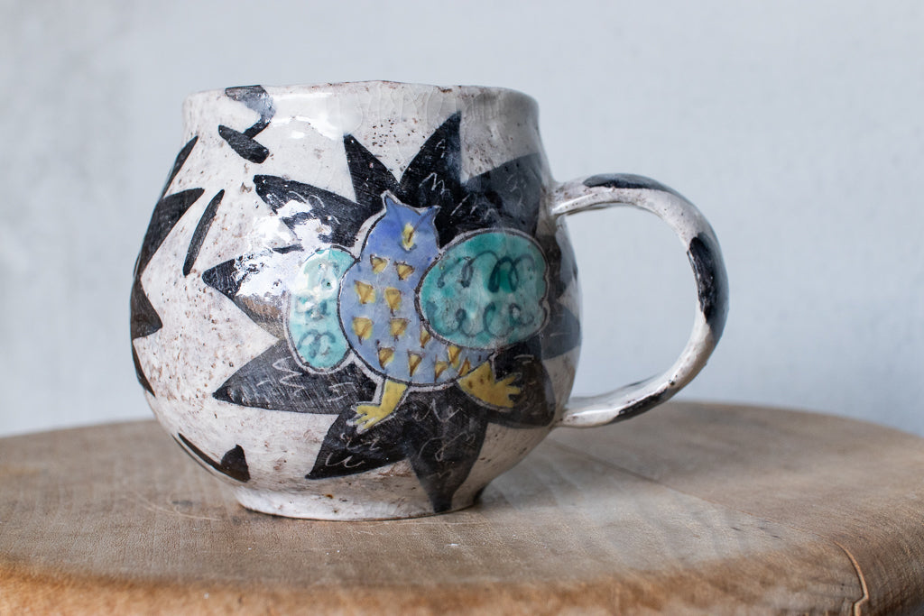 佐賀の宮﨑泰裕さんのマグカップです。道具とアートピースの狭間の存在とも言えそうな作品。ユーモラスで独特な絵柄が素敵でまず目を惹きますが、実物を手にとるとその作りの良さや原料への拘りが見てとれ、気易くはあれど決してチープではないとても良いバランス感があります。ひとつ手元にあるだけで気持ちが上がるような、生き生きとしたパワーを秘めた作品です。ピンときた方、ぜひ。