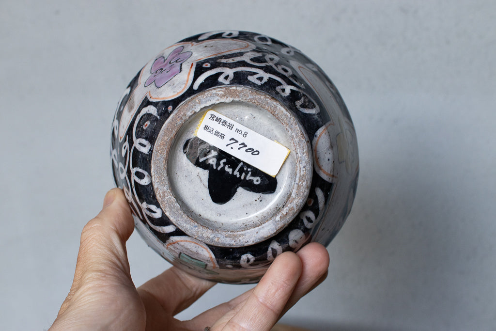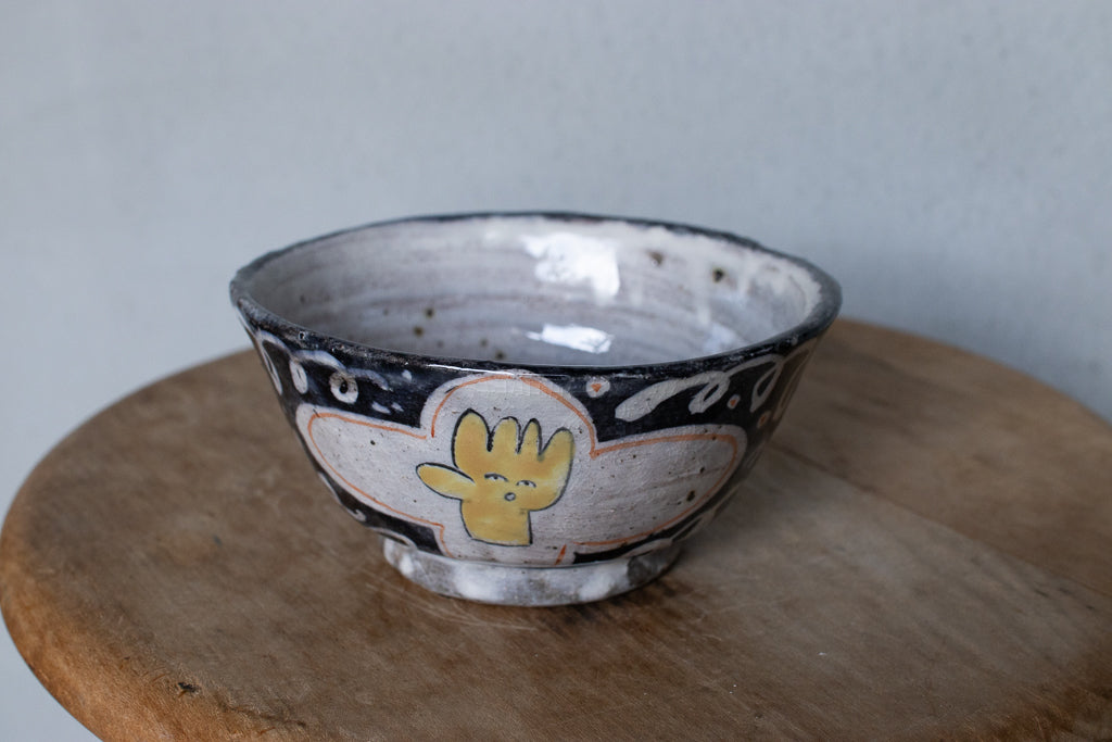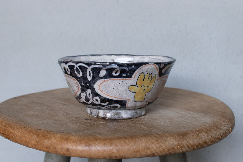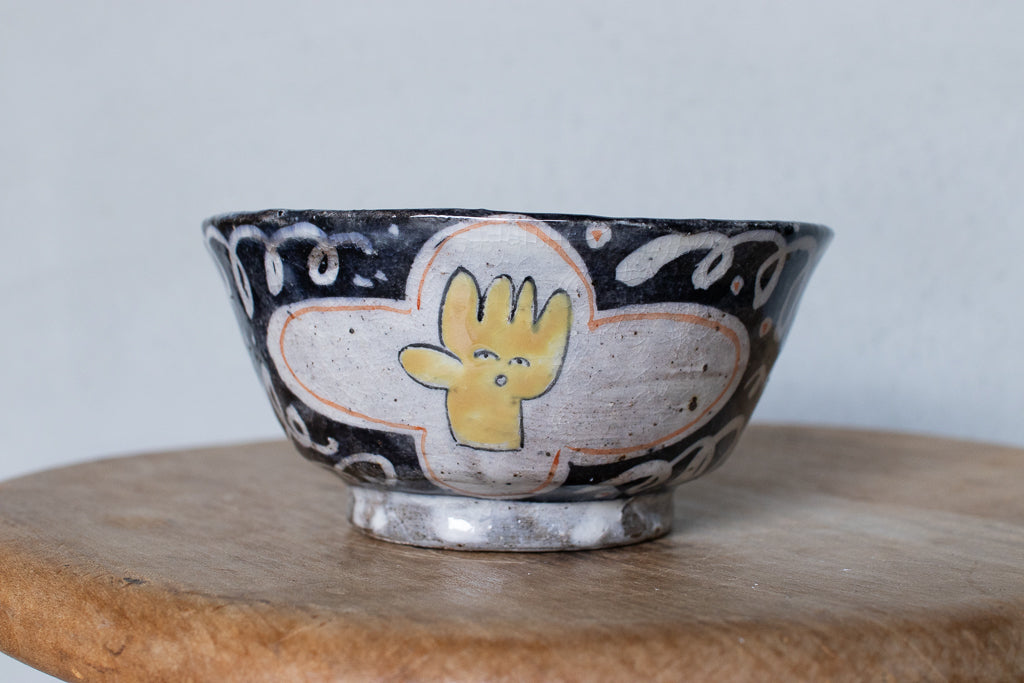 佐賀の宮﨑泰裕さんの飯碗です。道具とアートピースの狭間の存在とも言えそうな作品。ユーモラスで独特な絵柄が素敵でまず目を惹きますが、実物を手にとるとその作りの良さや原料への拘りが見てとれ、気易くはあれど決してチープではないとても良いバランス感があります。ひとつ手元にあるだけで気持ちが上がるような、生き生きとしたパワーを秘めた作品です。ピンときた方、ぜひ。