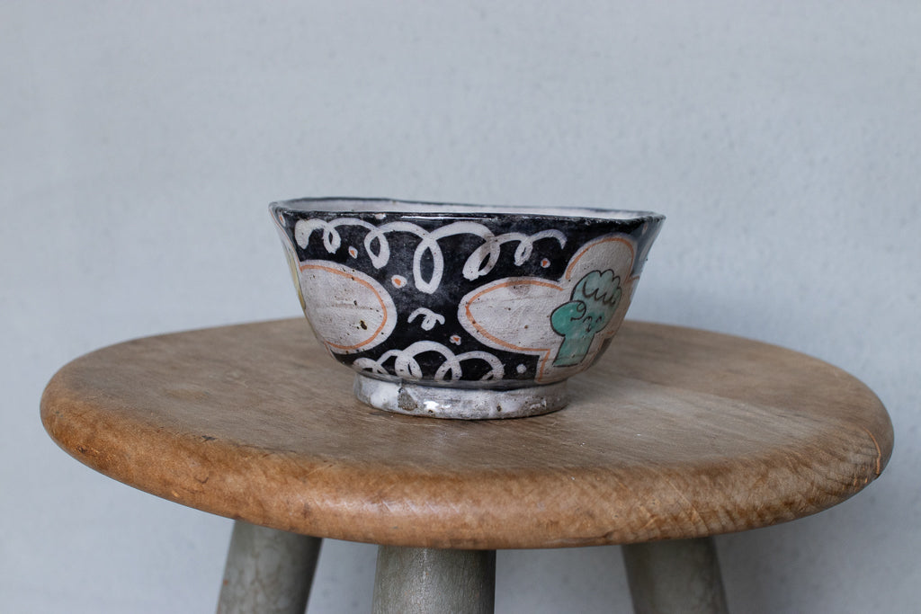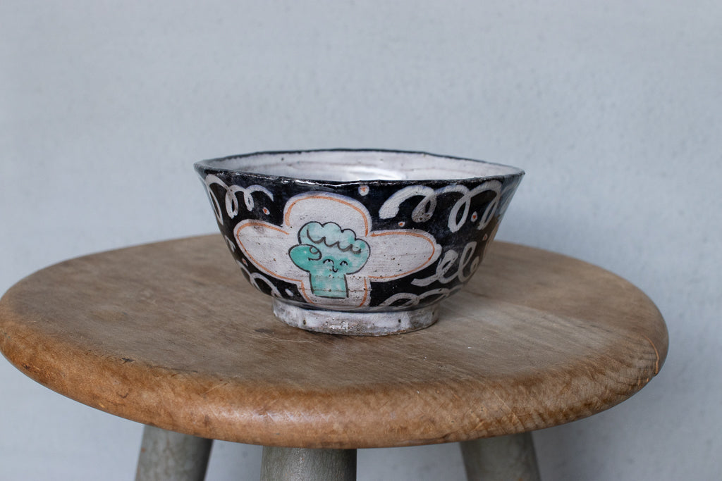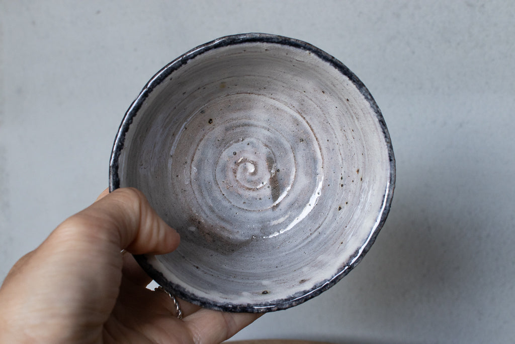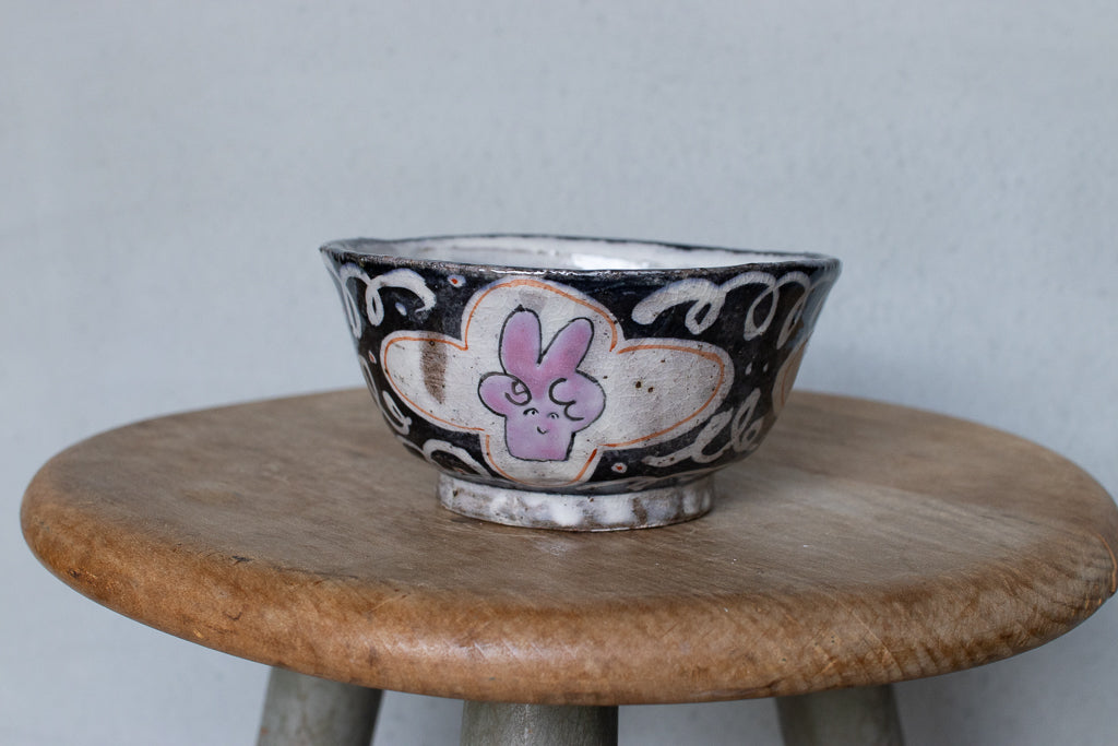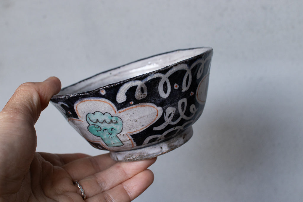 佐賀の宮﨑泰裕さんの飯碗です。道具とアートピースの狭間の存在とも言えそうな作品。ユーモラスで独特な絵柄が素敵でまず目を惹きますが、実物を手にとるとその作りの良さや原料への拘りが見てとれ、気易くはあれど決してチープではないとても良いバランス感があります。ひとつ手元にあるだけで気持ちが上がるような、生き生きとしたパワーを秘めた作品です。ピンときた方、ぜひ。