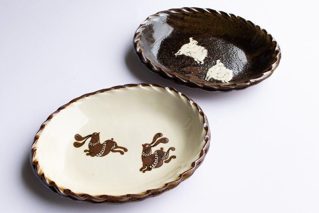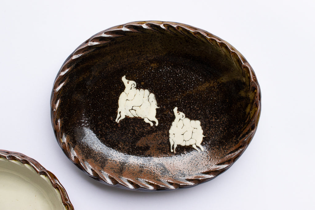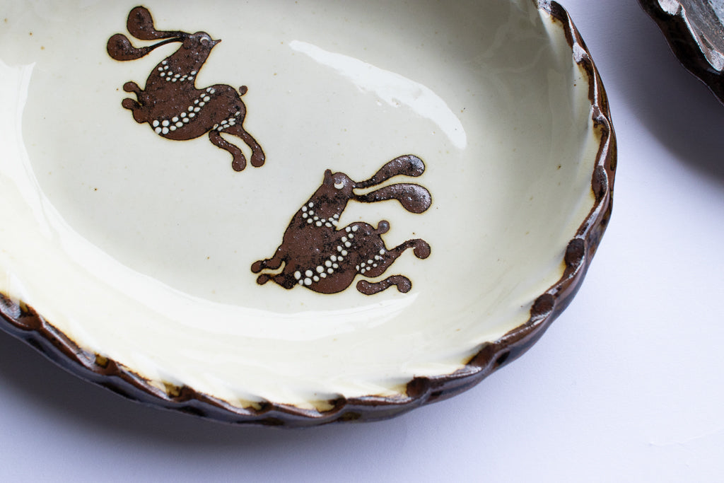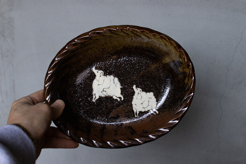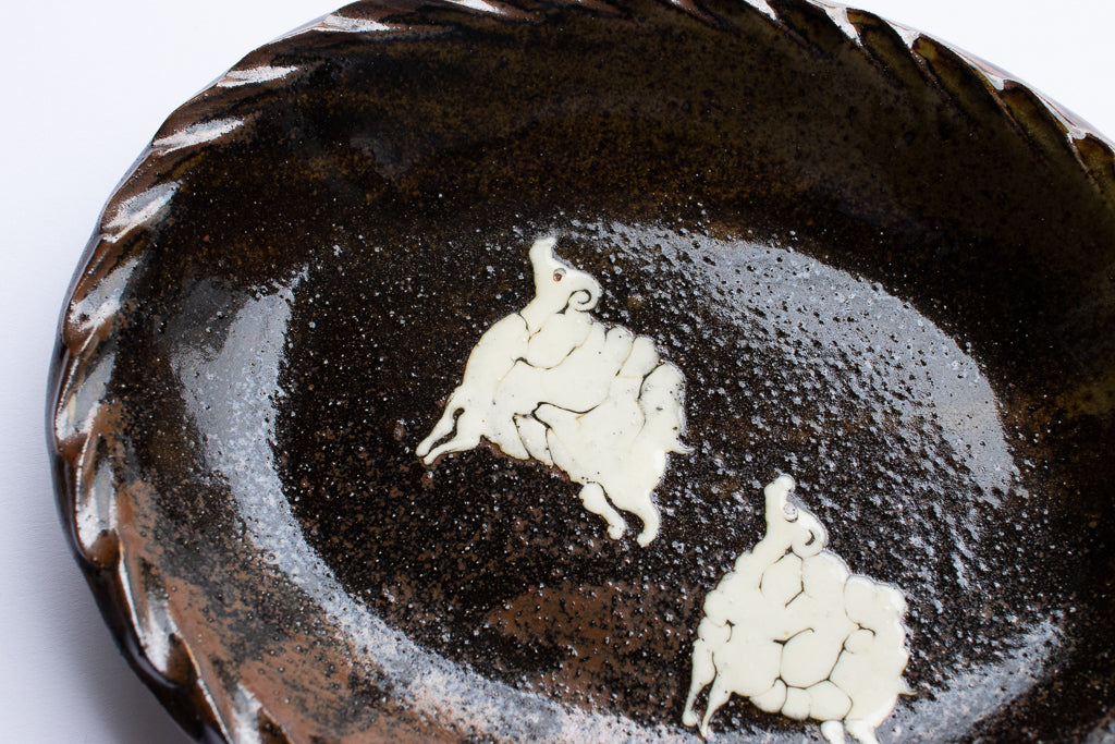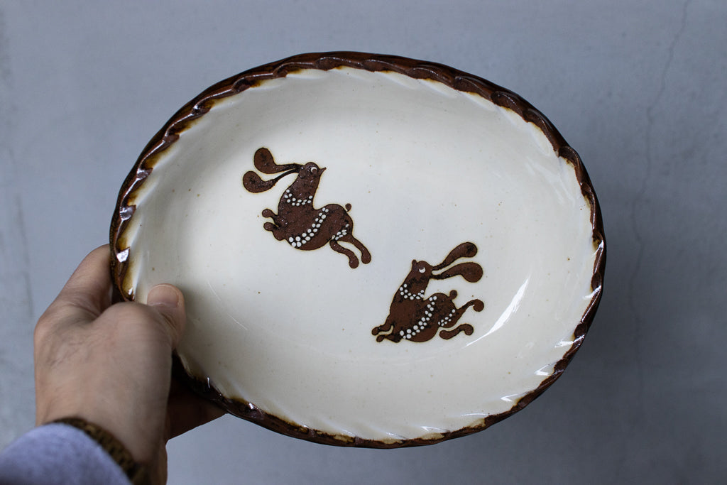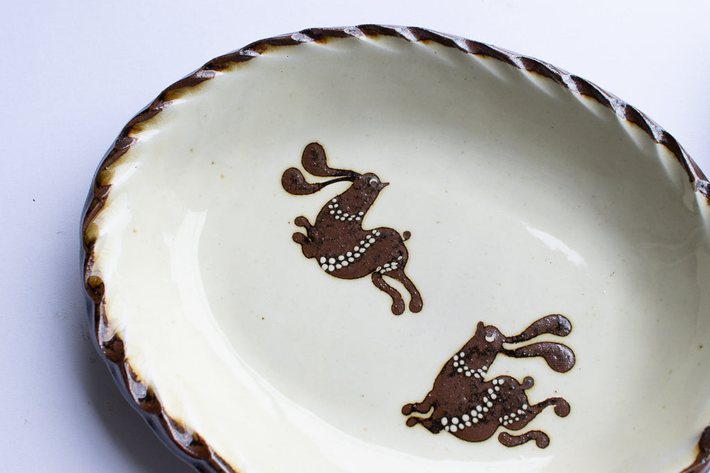 小島鉄平さんの楕円皿です。スリップウェアの技法で精緻な絵柄を描く、という比類ない作家。生き生きとした動物が魅力的な作品です。肉厚で重厚感ある作り。