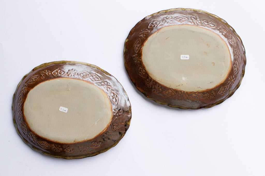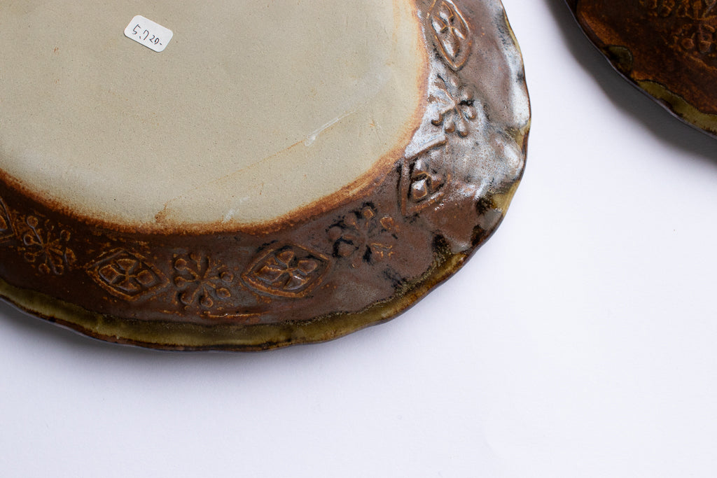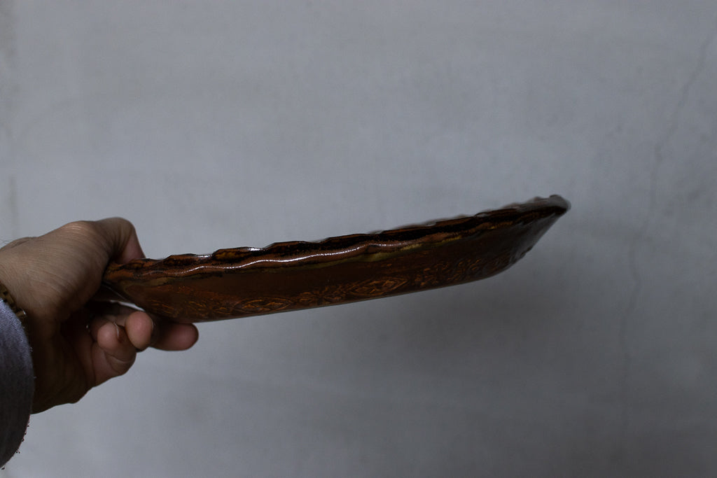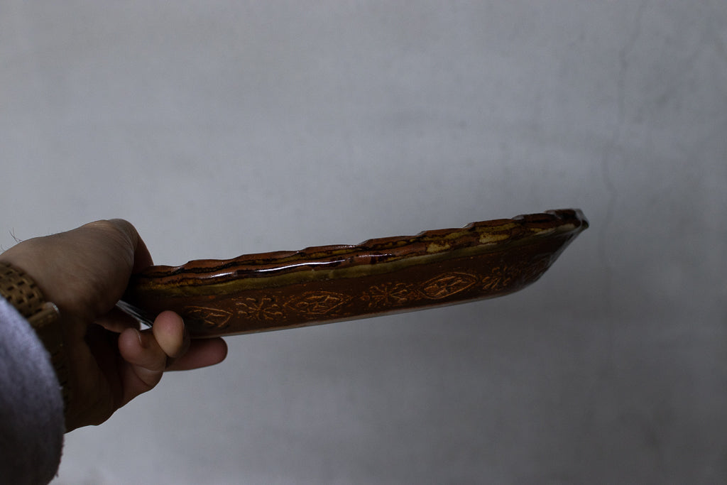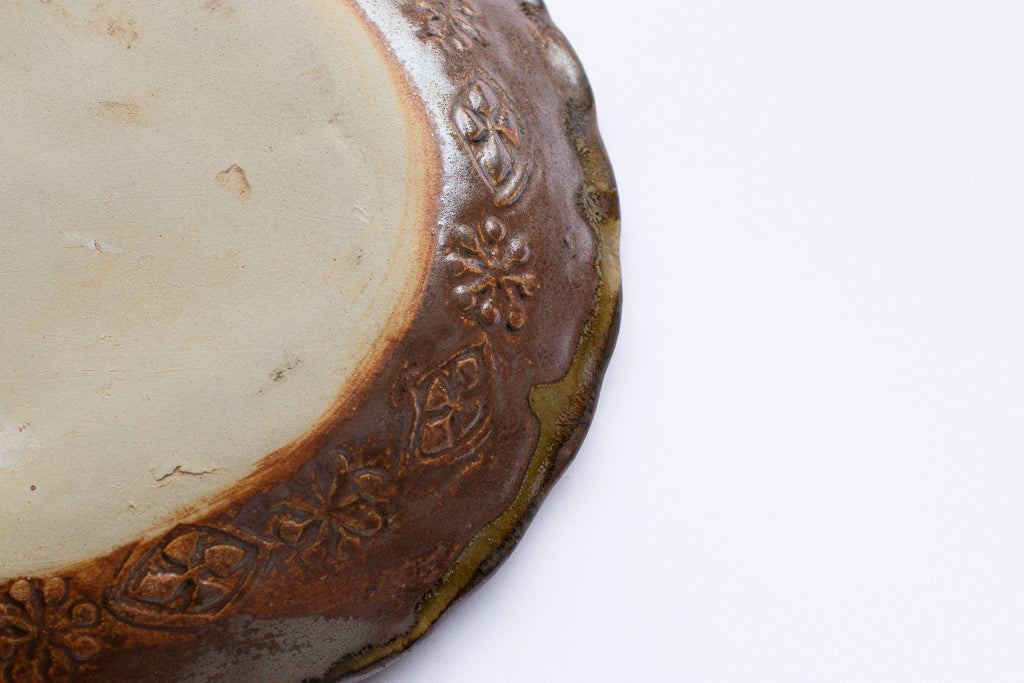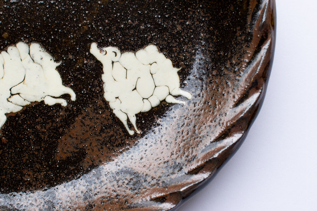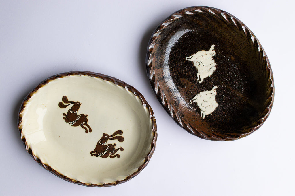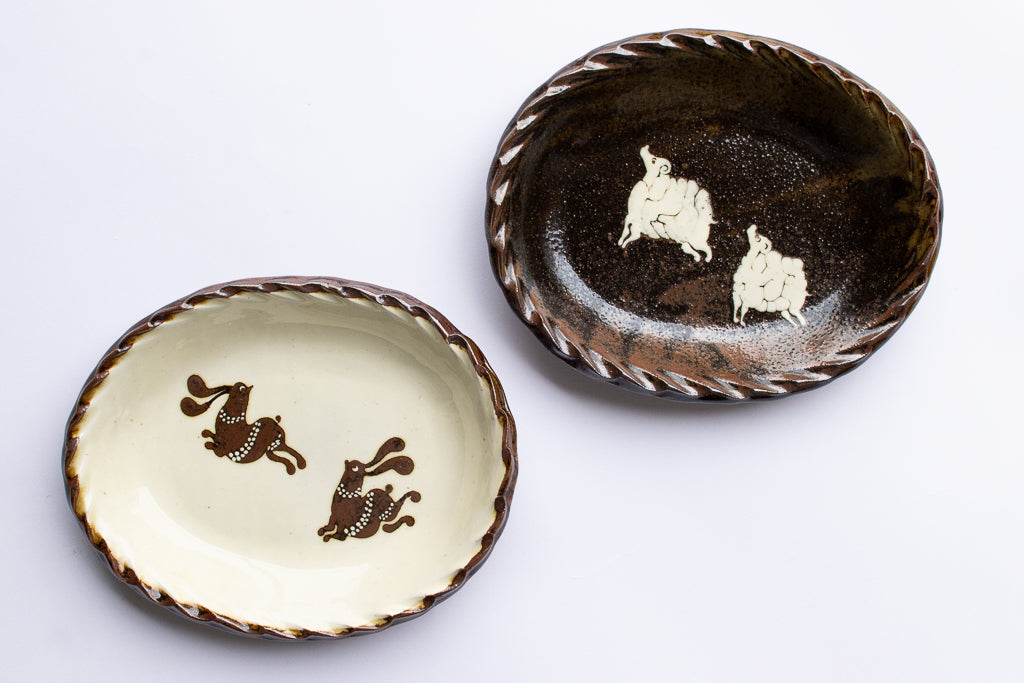 小島鉄平さんの楕円皿です。スリップウェアの技法で精緻な絵柄を描く、という比類ない作家。生き生きとした動物が魅力的な作品です。肉厚で重厚感ある作り。