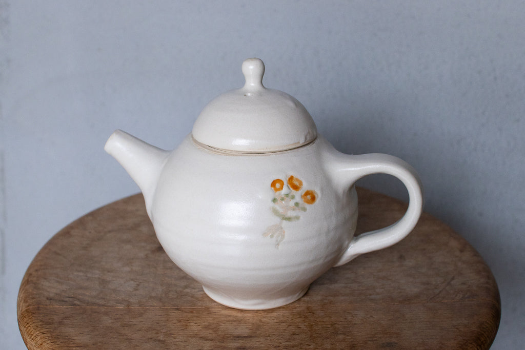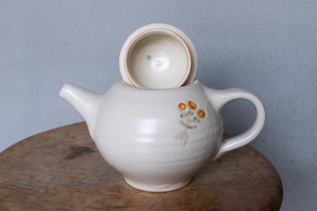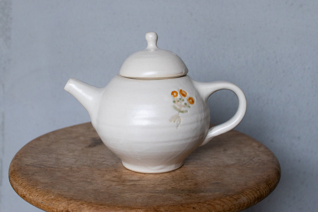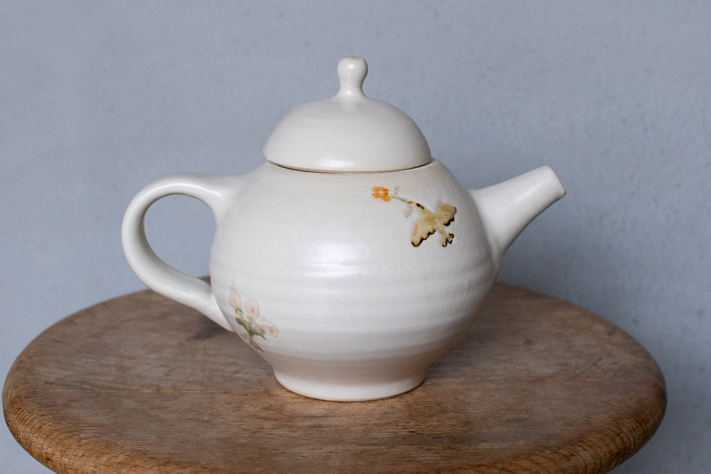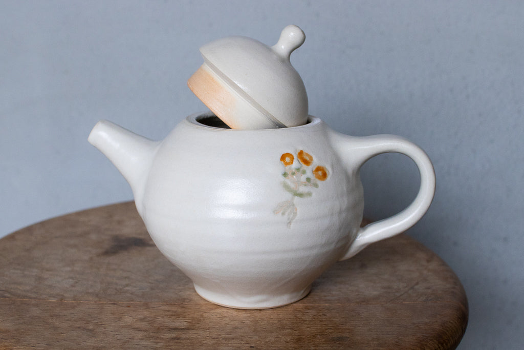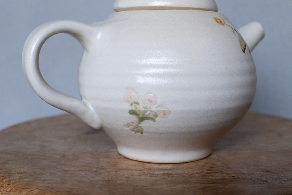 小早川智里 '24個展 出展作品。釉薬によるお花と鳥の絵付けがかわいいです。外側は柔らかなマット白で内側は透明釉がかけられたツヤのある仕上がりで良いコントラストになっています。余裕で300cc入るので、1~2人分の紅茶やお茶をお楽しみいただけます。