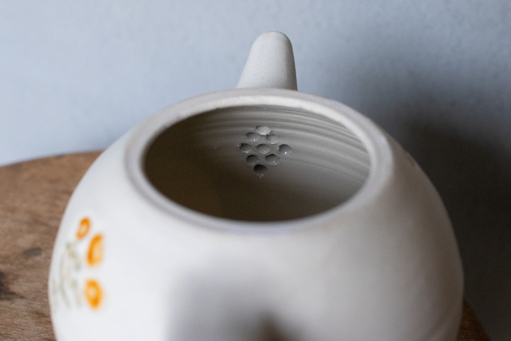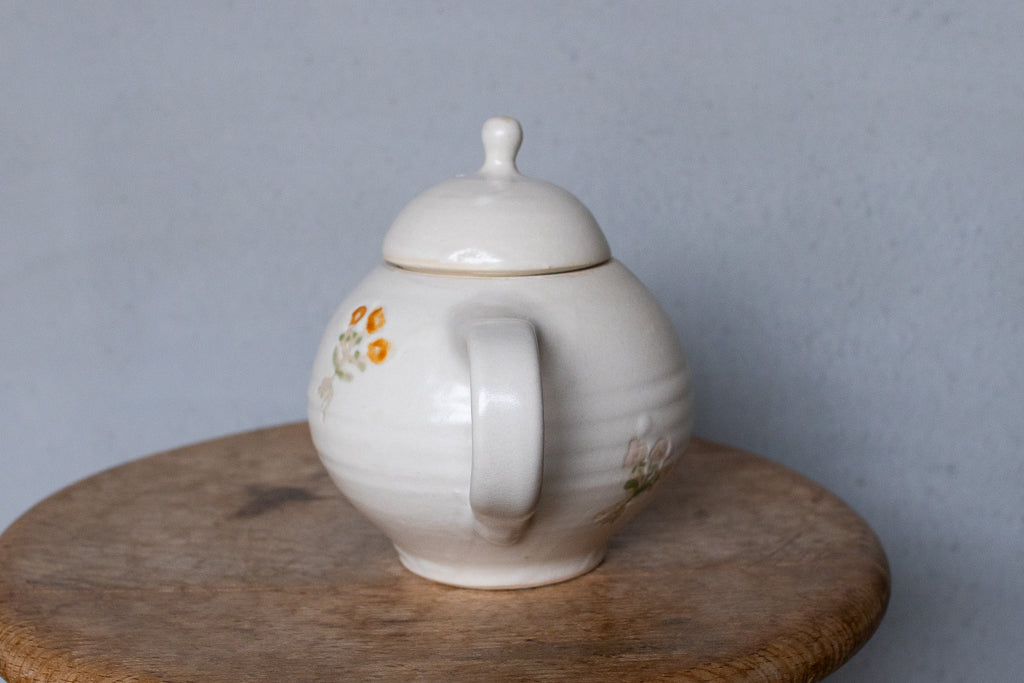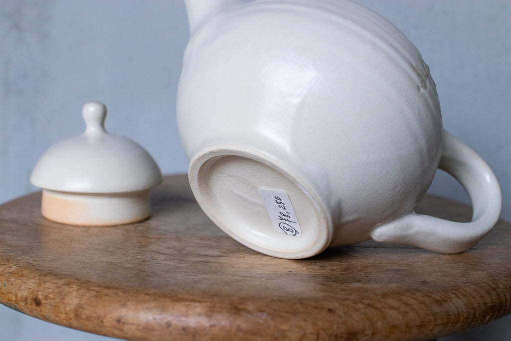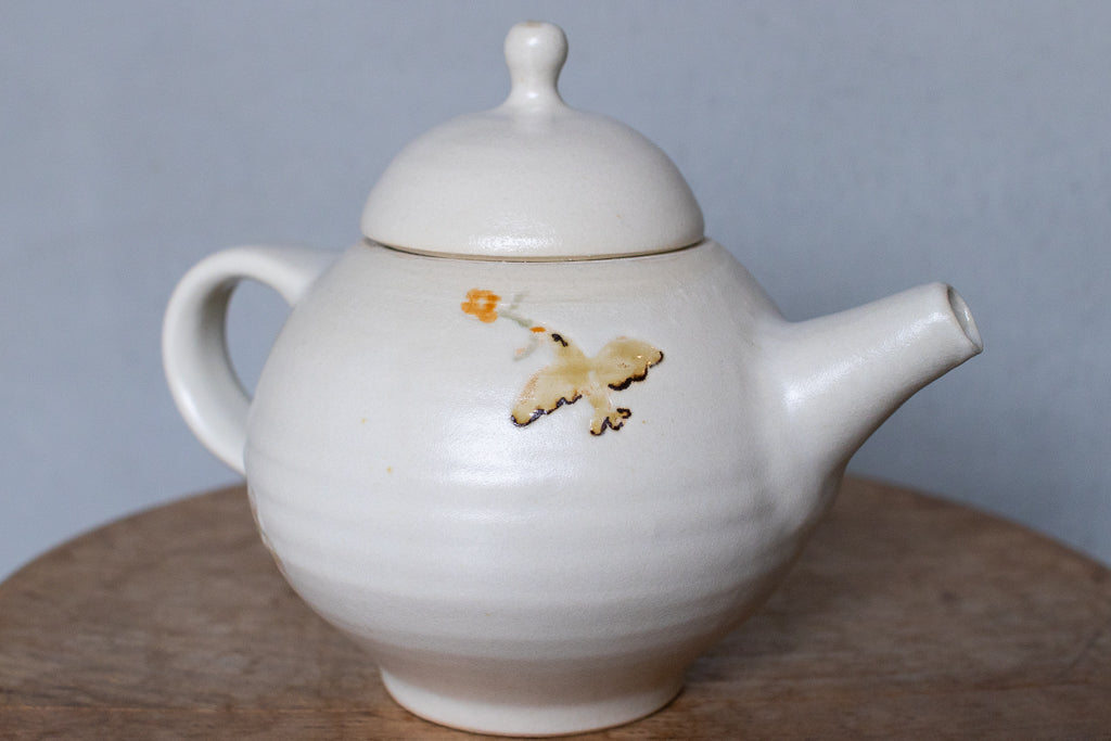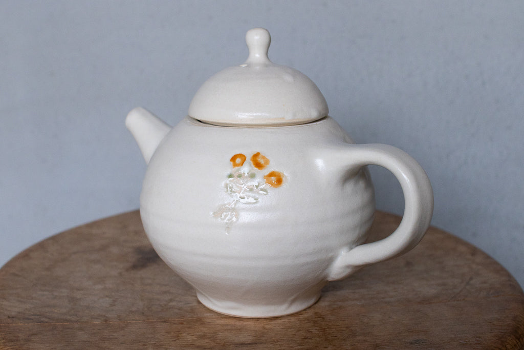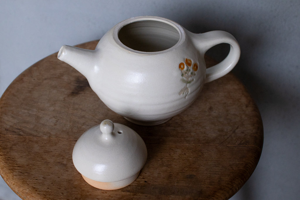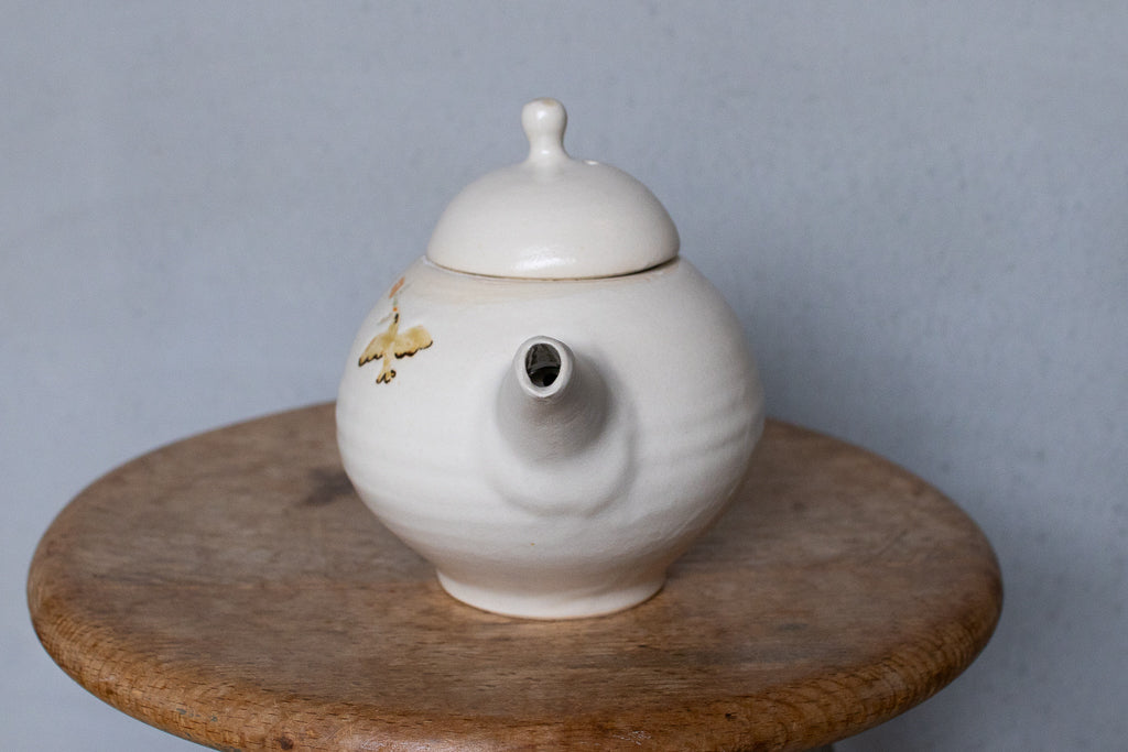 小早川智里 '24個展 出展作品。釉薬によるお花と鳥の絵付けがかわいいです。外側は柔らかなマット白で内側は透明釉がかけられたツヤのある仕上がりで良いコントラストになっています。余裕で300cc入るので、1~2人分の紅茶やお茶をお楽しみいただけます。
