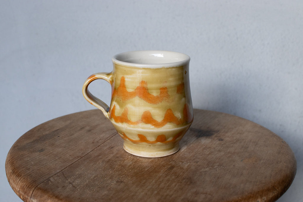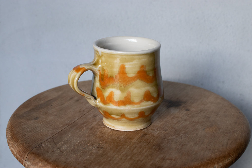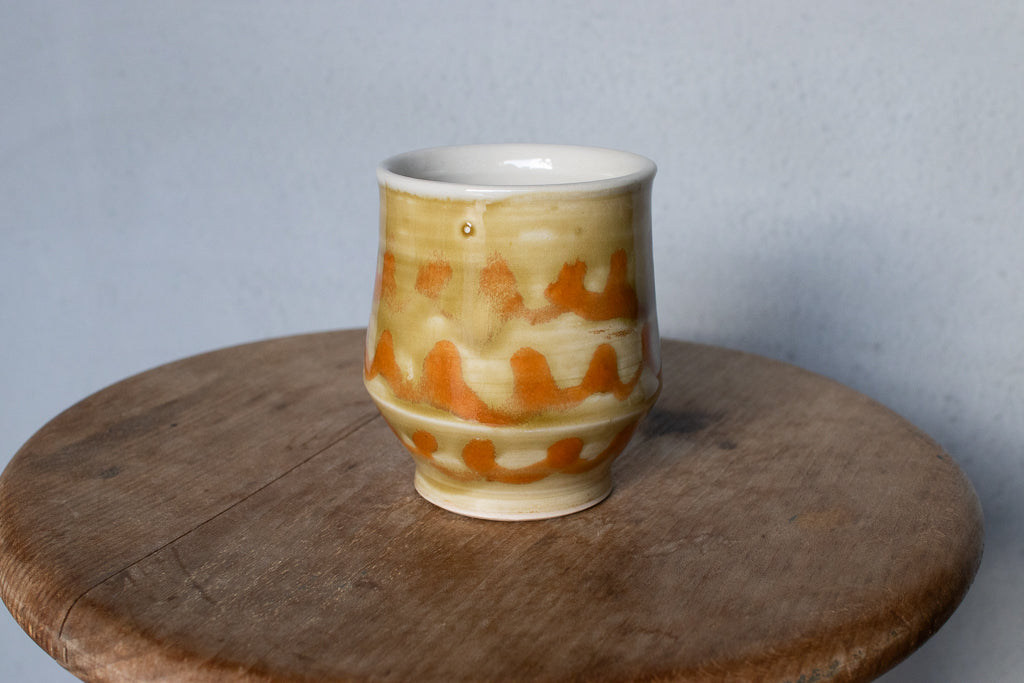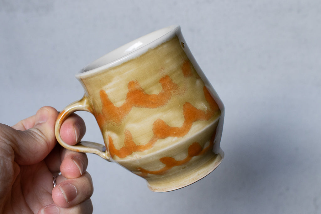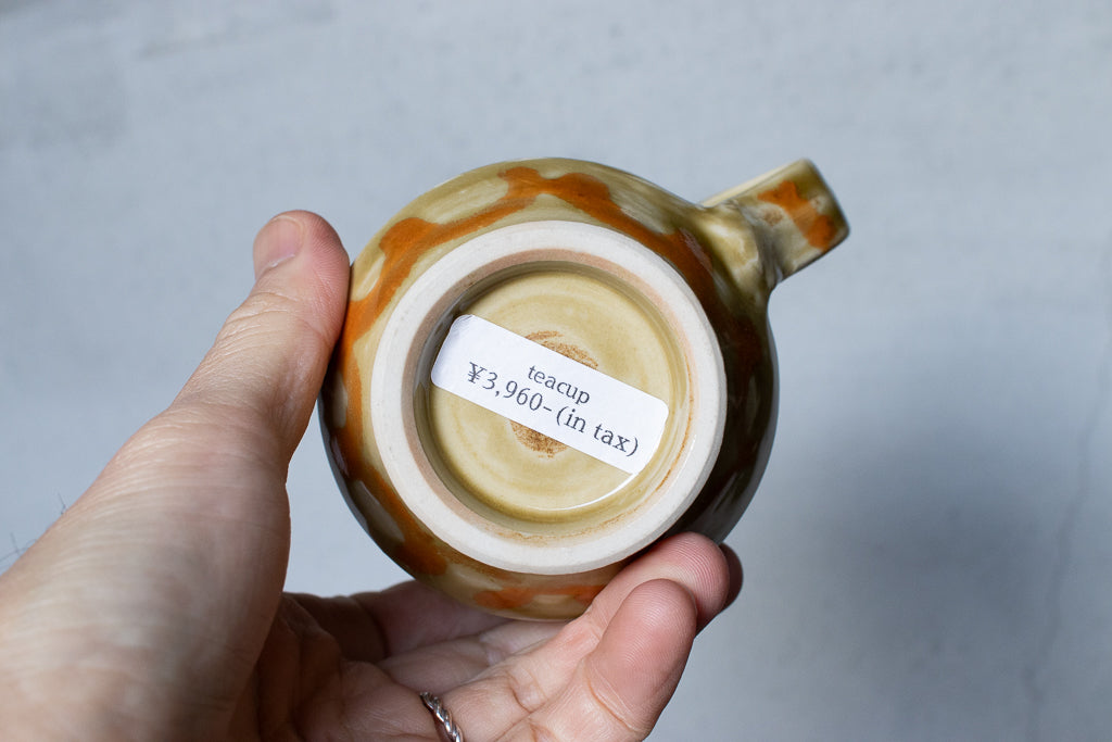 小早川智里さんのティーカップです。小早川智里 '25個展 出展作品。ベージュゴールド系のベースにオレンジの波模様がかわいいひと品です。程よく肉厚でドリンクも冷めにくそうで◎。