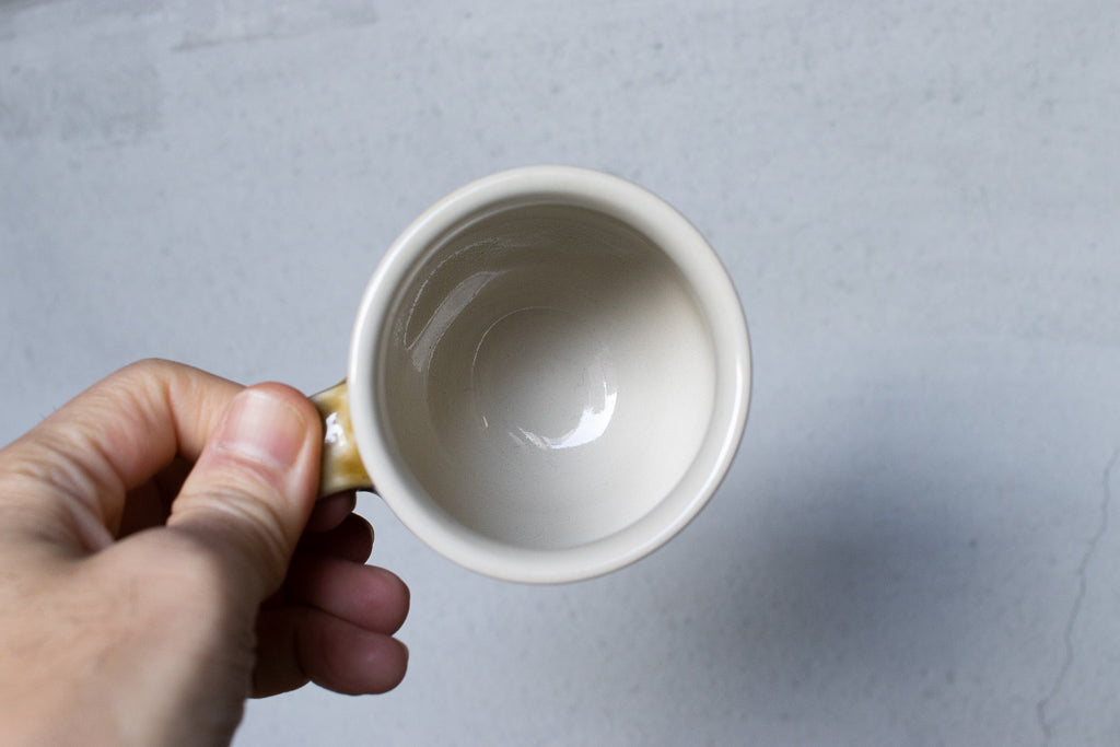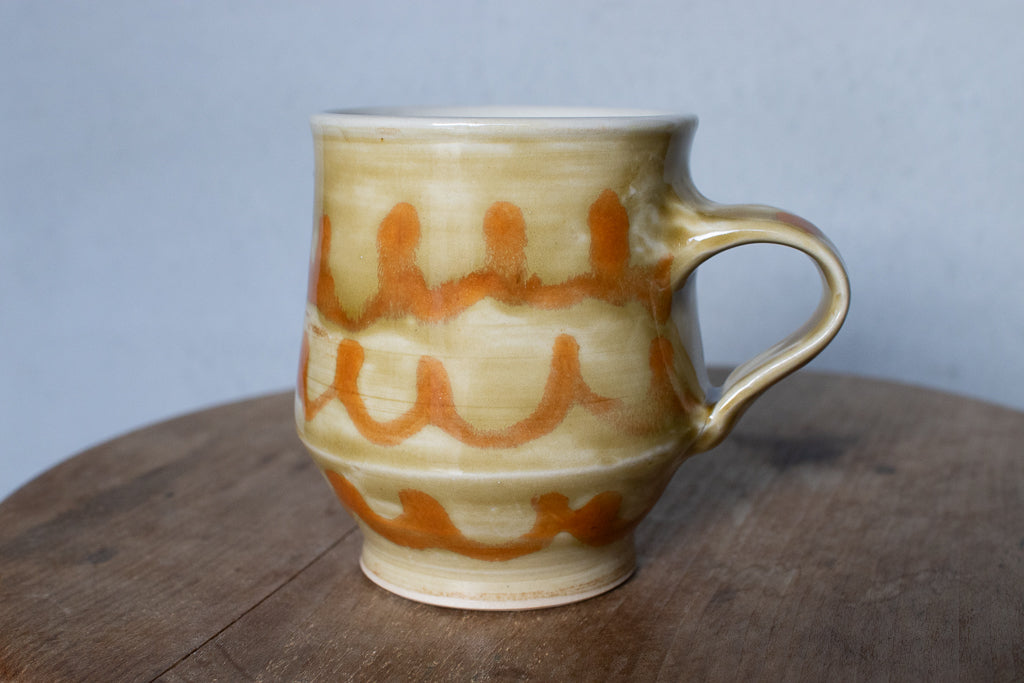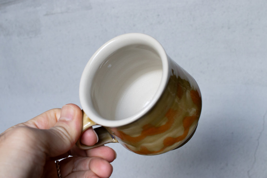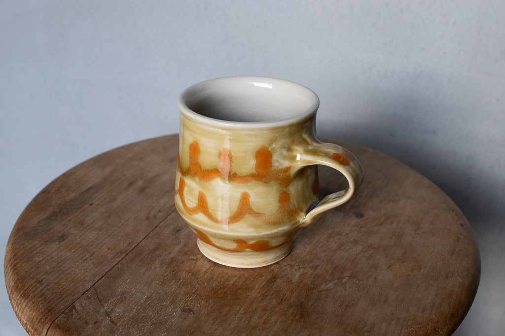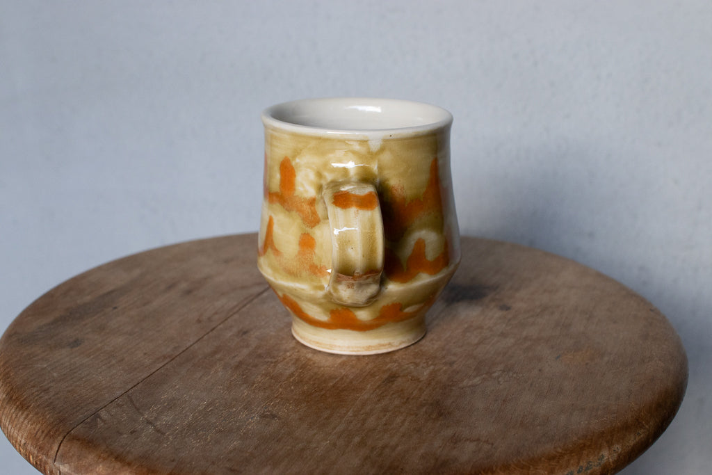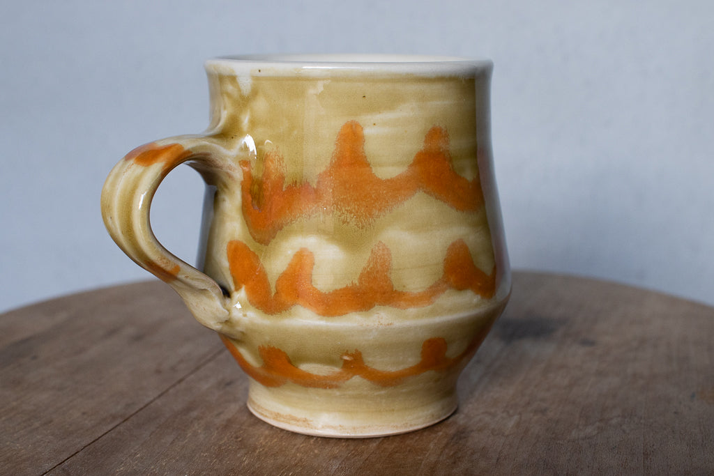 小早川智里さんのティーカップです。小早川智里 '25個展 出展作品。ベージュゴールド系のベースにオレンジの波模様がかわいいひと品です。程よく肉厚でドリンクも冷めにくそうで◎。