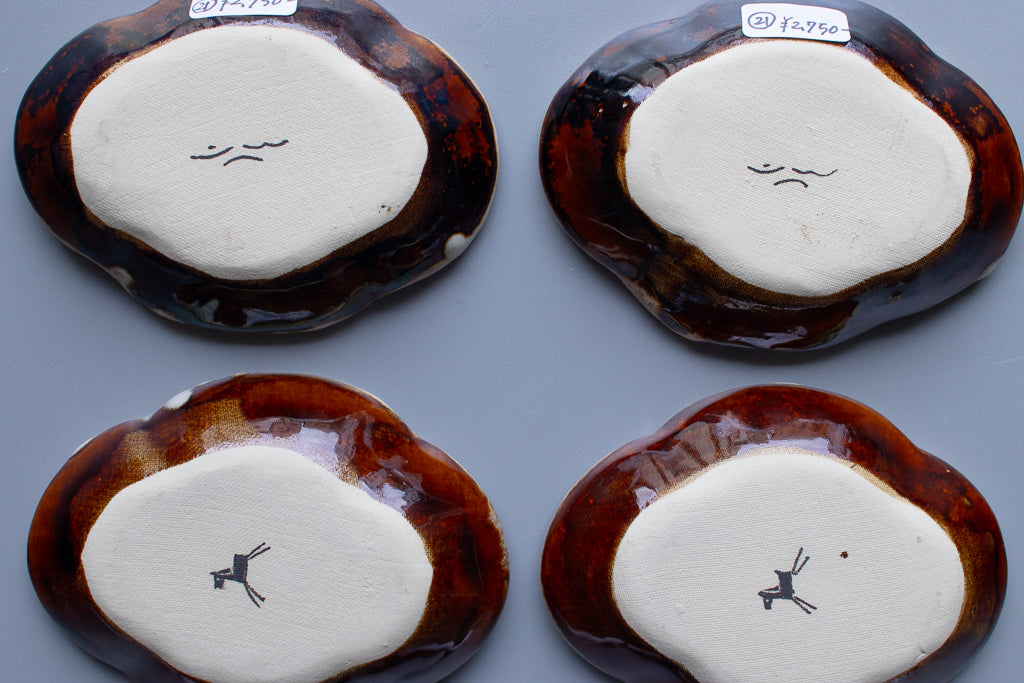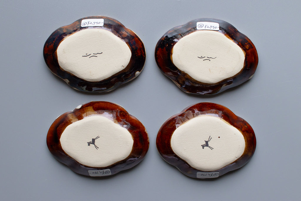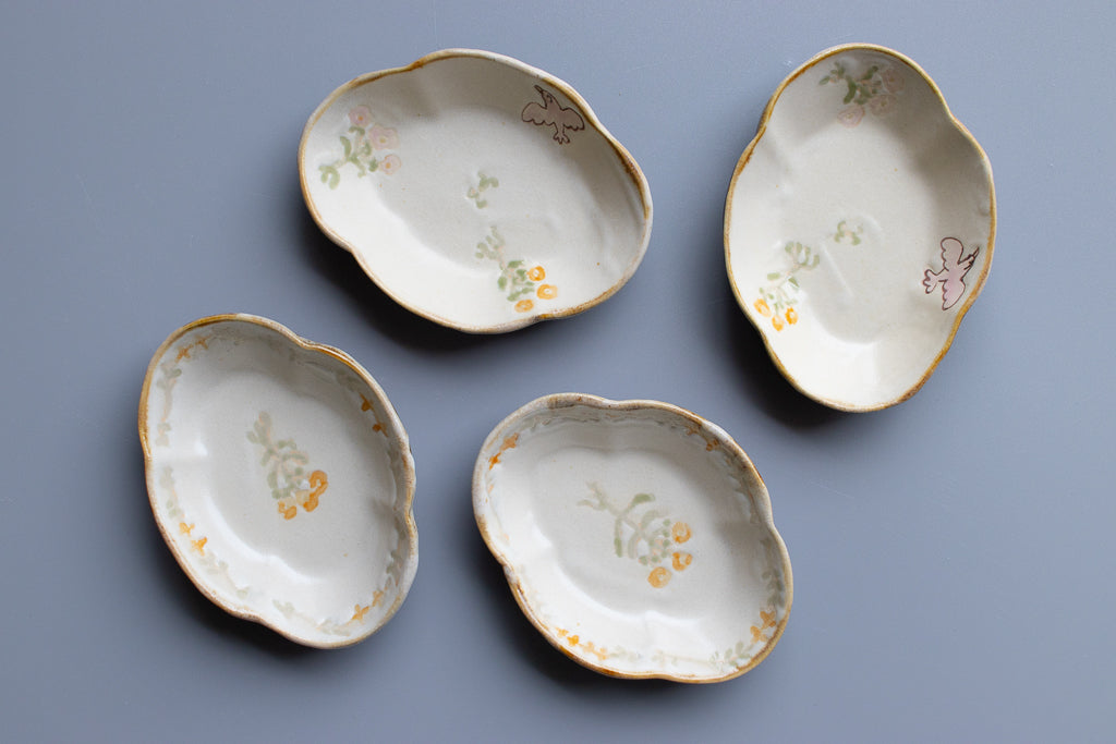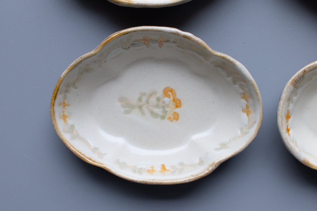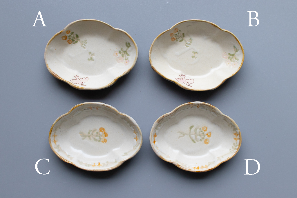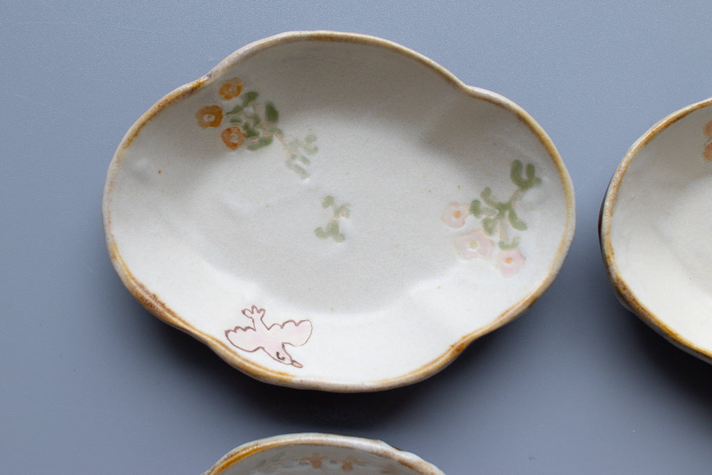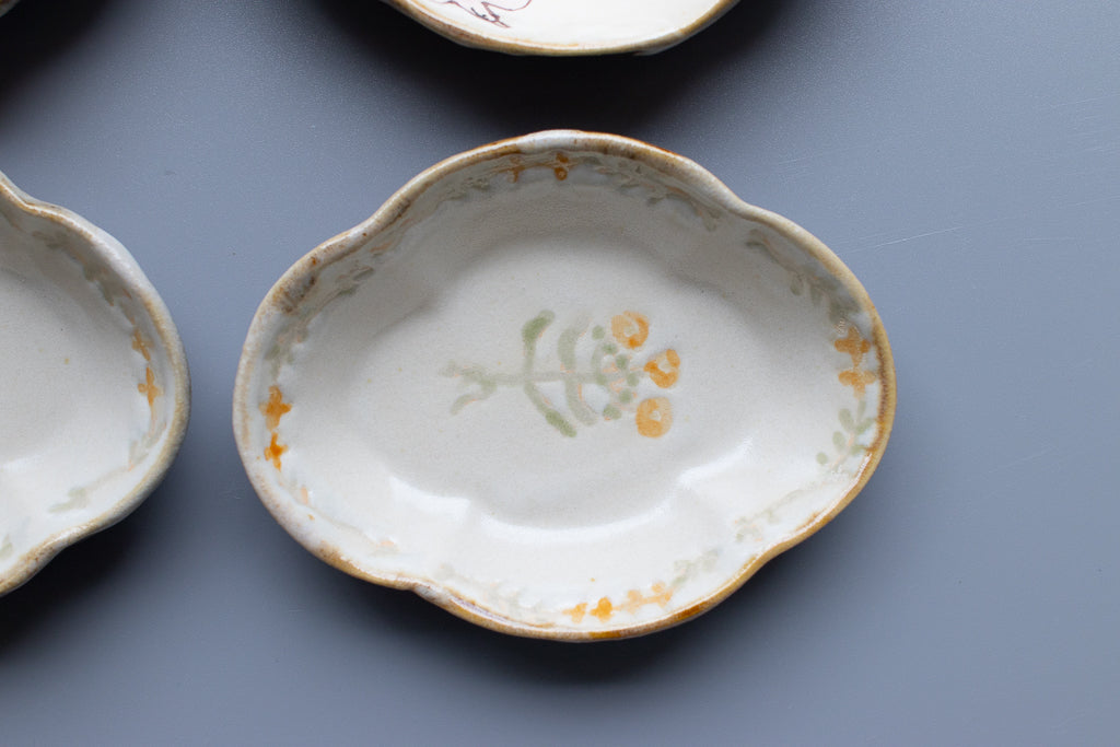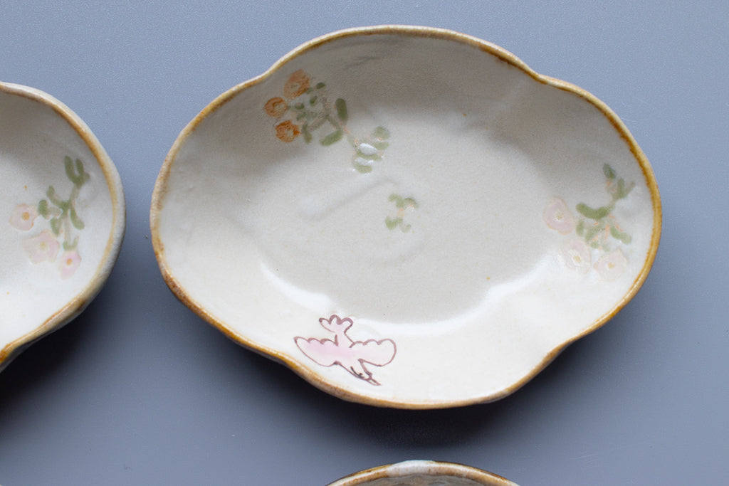 小早川智里 '24個展 出展作品。木瓜型の小皿です。釉薬による絵付けがかわいい作品。