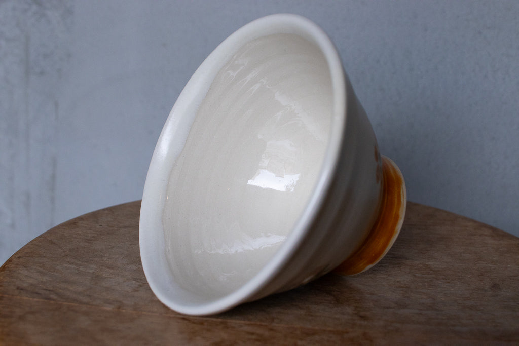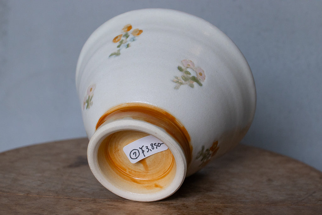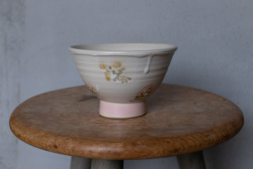 小早川智里 '24個展 出展作品。高めの高台が特徴的なご飯茶碗です。釉薬による絵付けがかわいいです。外側は柔らかなマット白で内側は透明釉がかけられたツヤのある仕上がりで良いコントラストになっています。