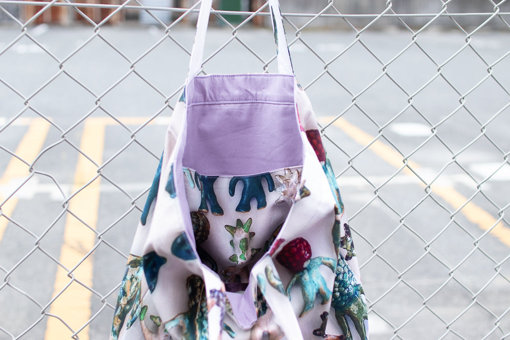 内側にヒューマン柄の小ポケット×1。内張りは薄パープル系。