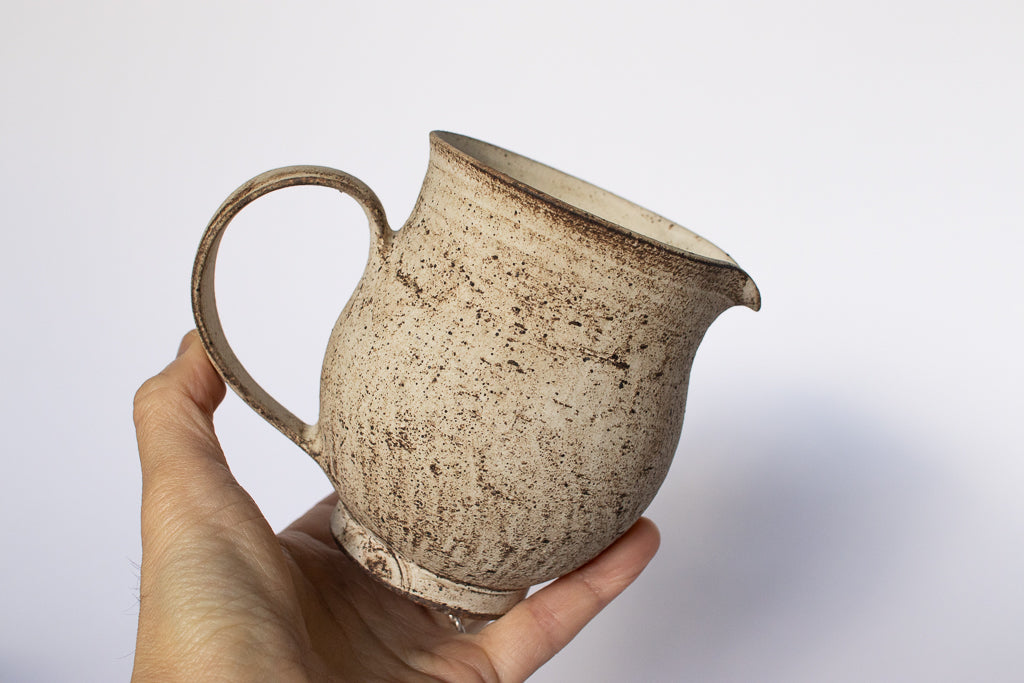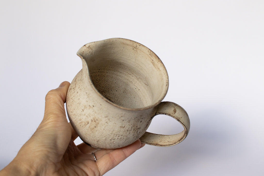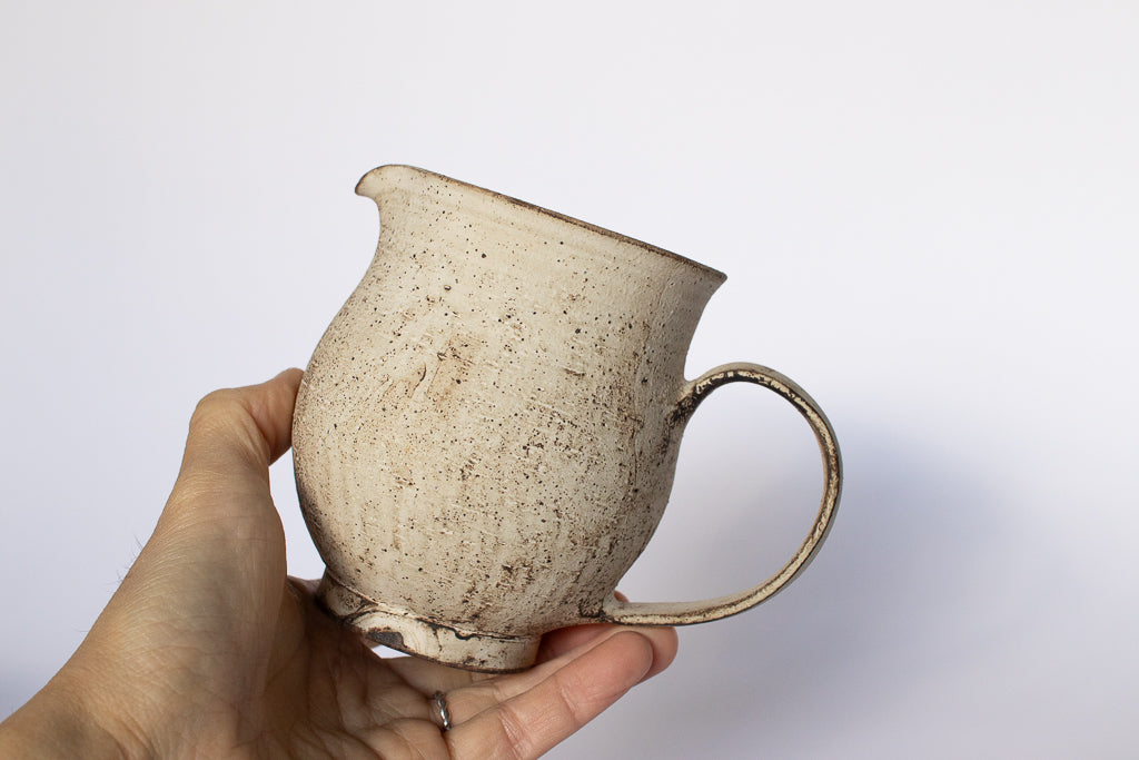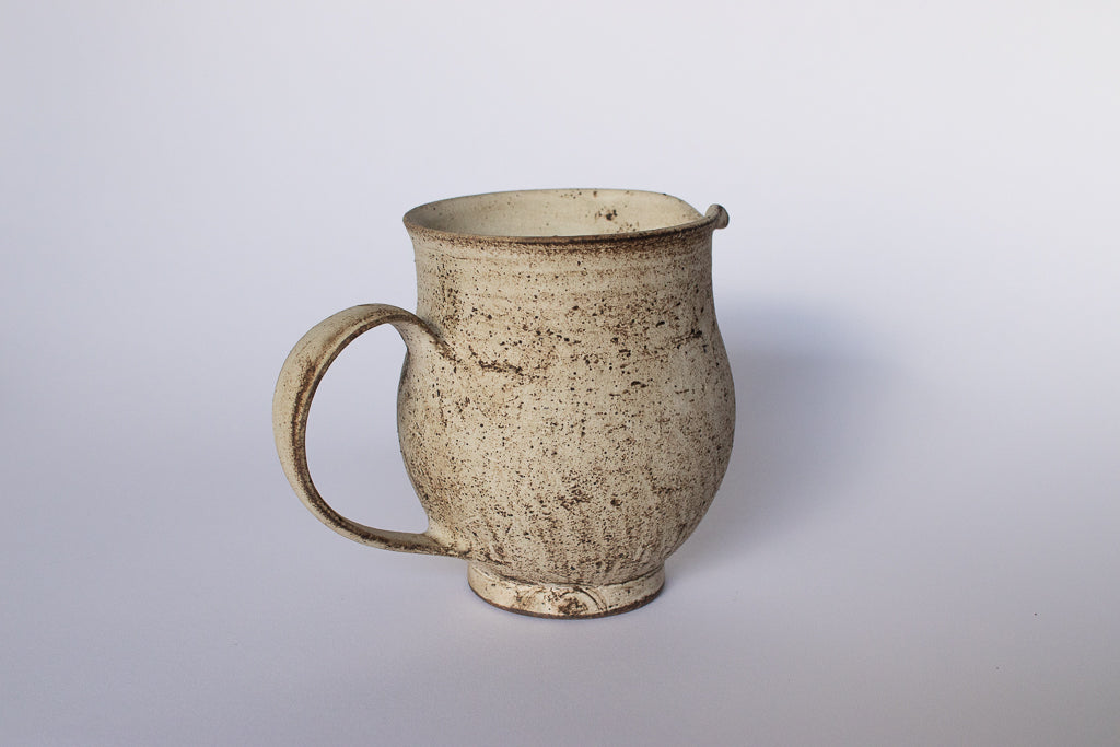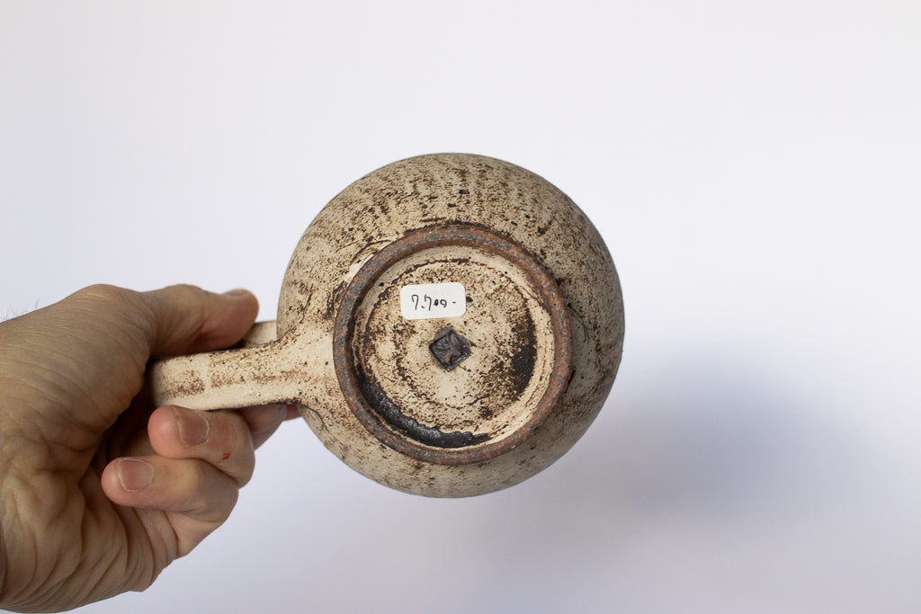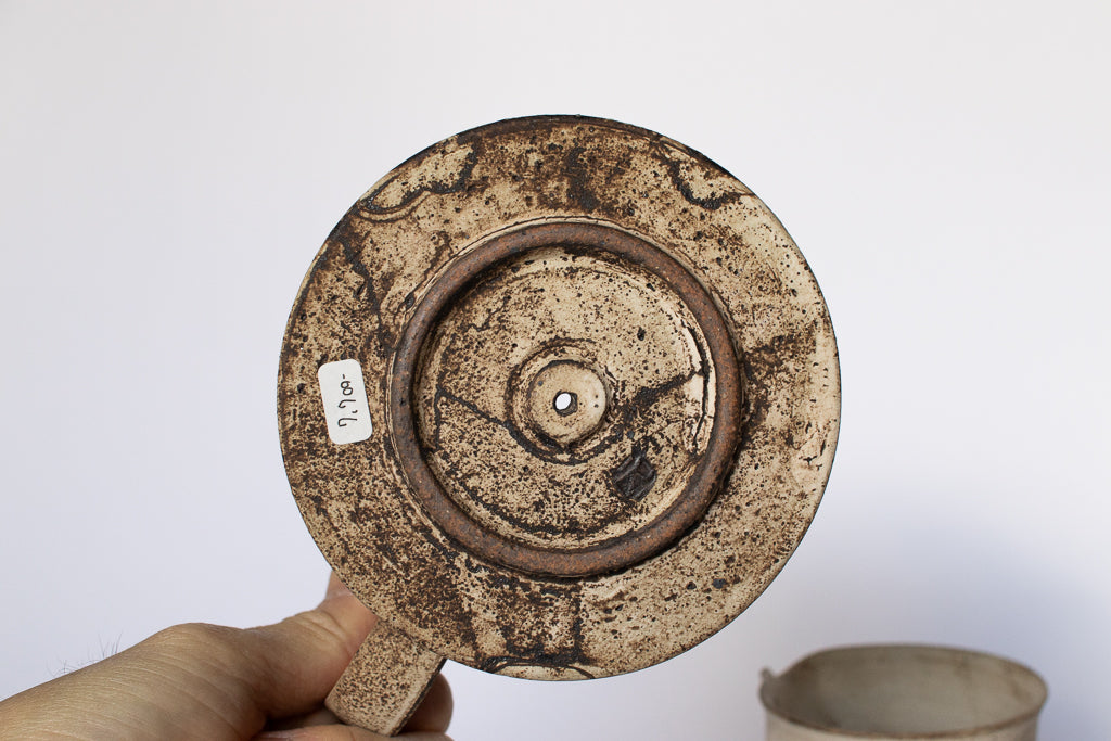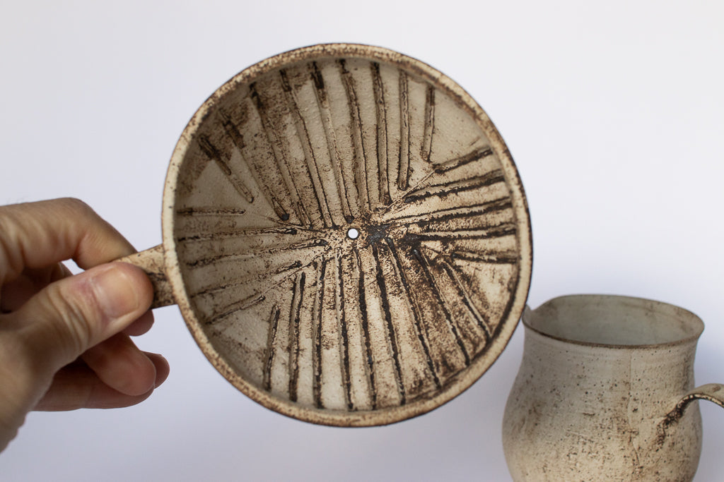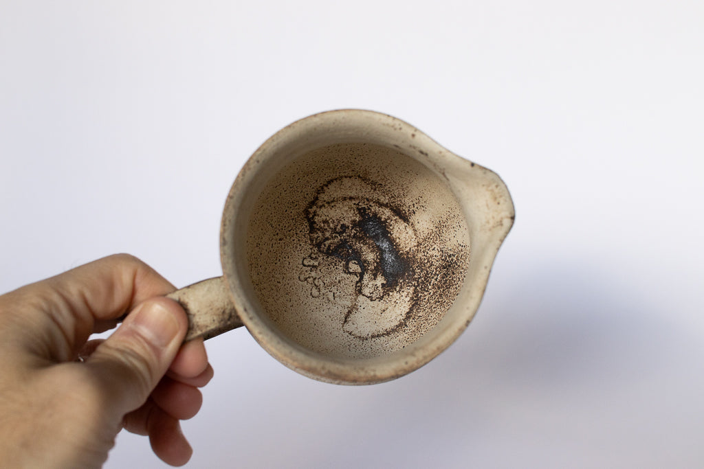 滋賀 草津 淡海陶芸研究所の山元一真さんのドリッパー&サーバーです。「錆白泥」と名付けられた新作。化粧泥の流れや指で触った痕跡などをあえて残すことで偶発的に生じる独特の表情が魅力的です。2~3人分のコーヒーを淹れるのにちょうどよいサイズ感のドリッパーとサーバーのセットです。ドリッパーの内側は溝付き&一つ穴タイプ。カリタのフィルターなどを使ってゆっくりドリップしていただければ、穏やかな味に淹れることができそうです。