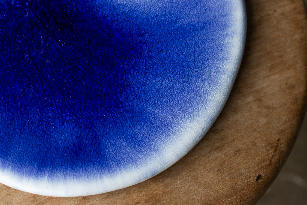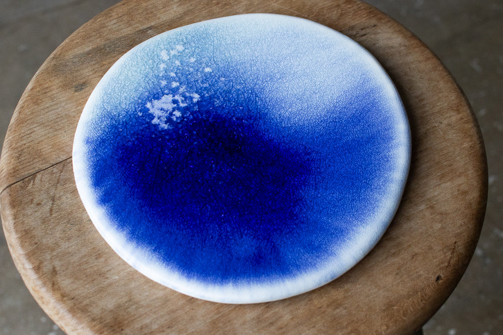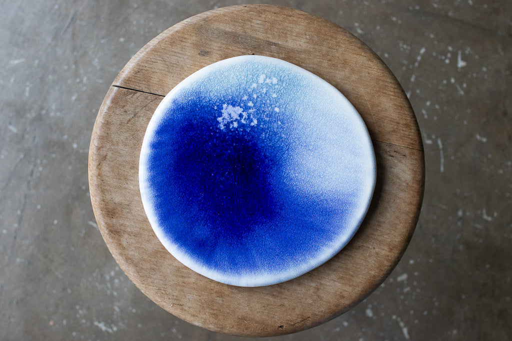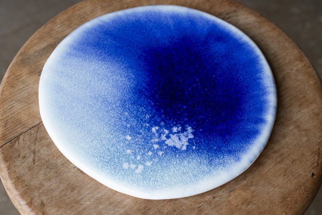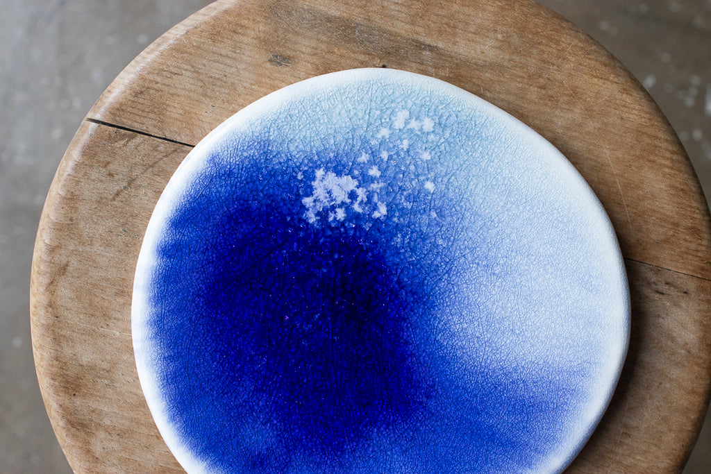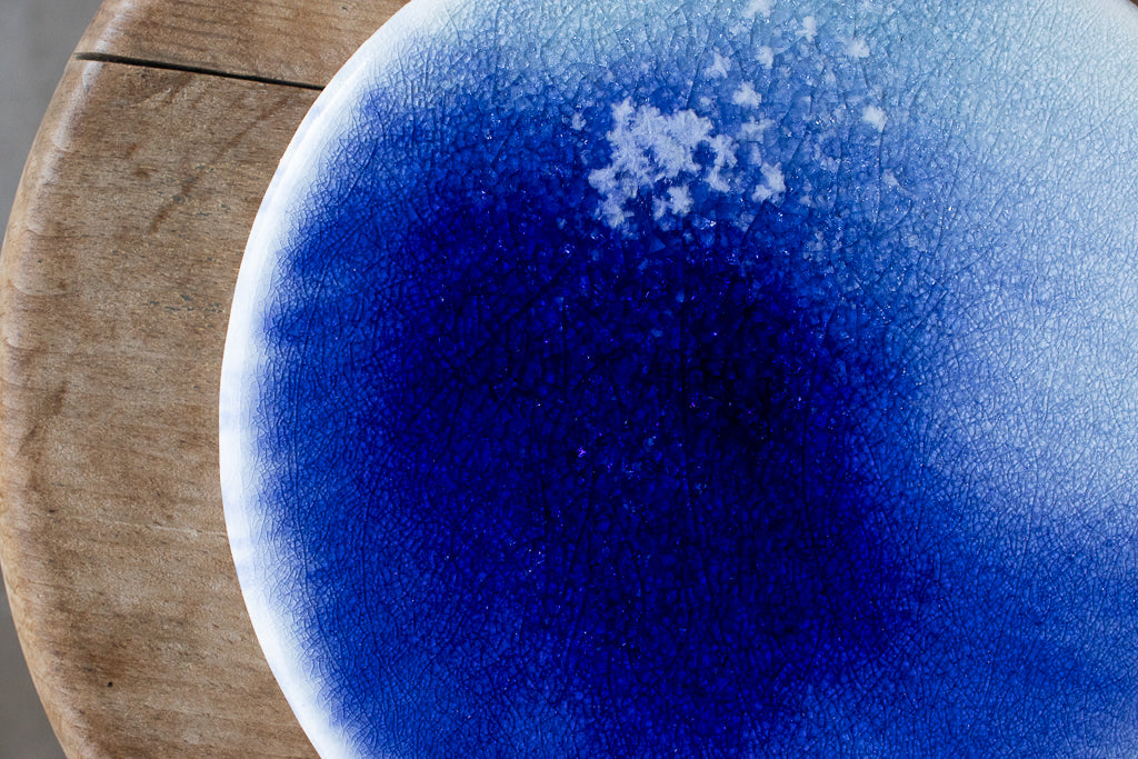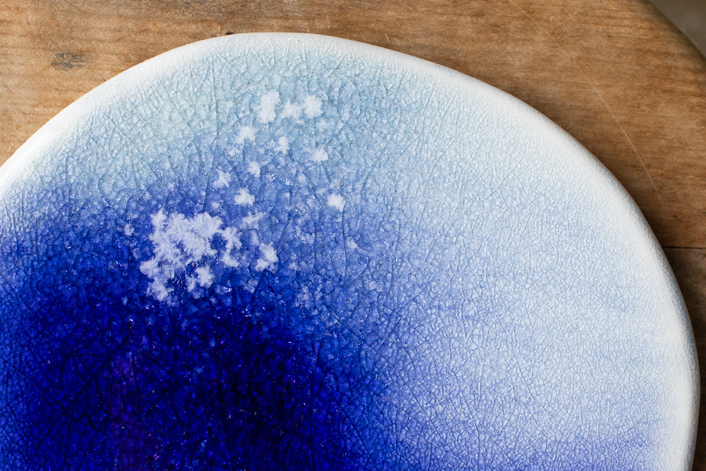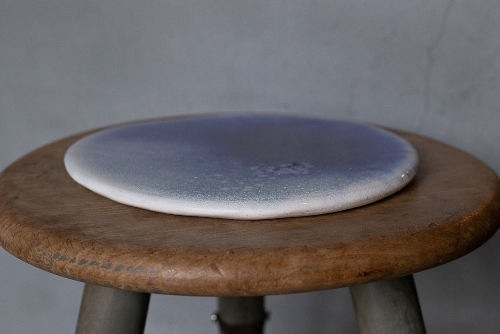 24年夏の個展出展作品。市川さんの代名詞の"流彩釉"がフラットな一面にきらめく美しいお皿です。フリーハンドで象られた造形もユニーク。自ら調合した白土と土灰を使った作品です。