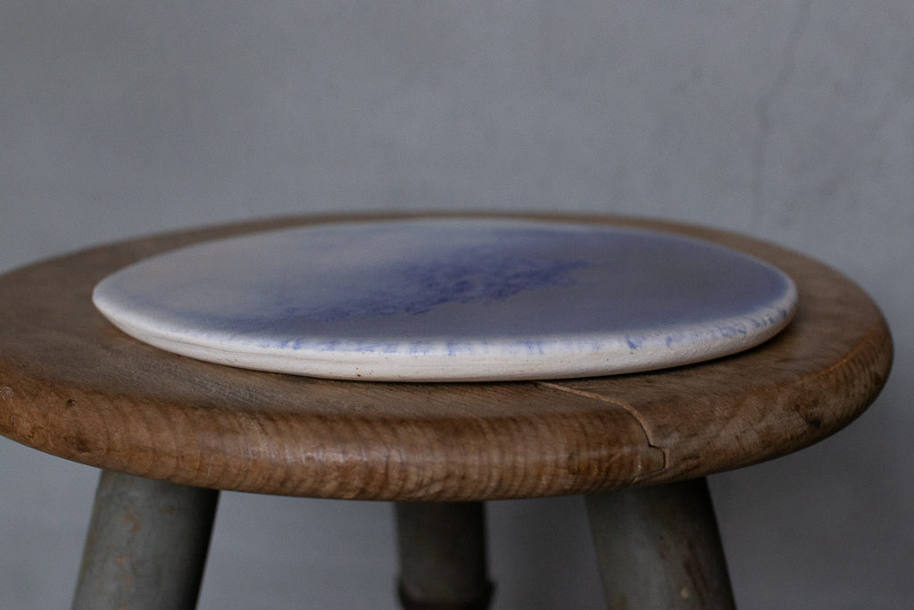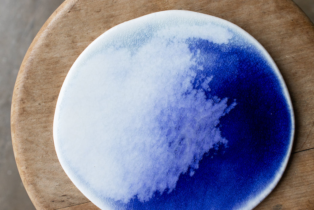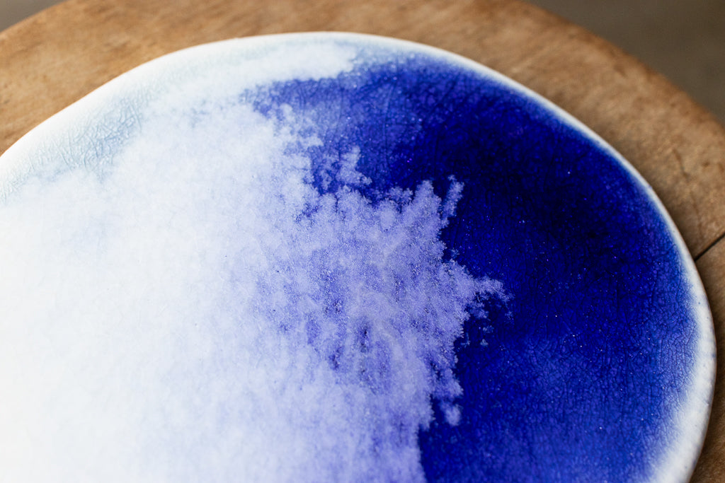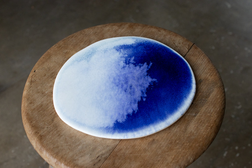 24年夏の個展出展作品。市川さんの代名詞の"流彩釉"がフラットな一面にきらめく美しいお皿です。フリーハンドで象られた造形もユニーク。自ら調合した白土と土灰を使った作品です。
